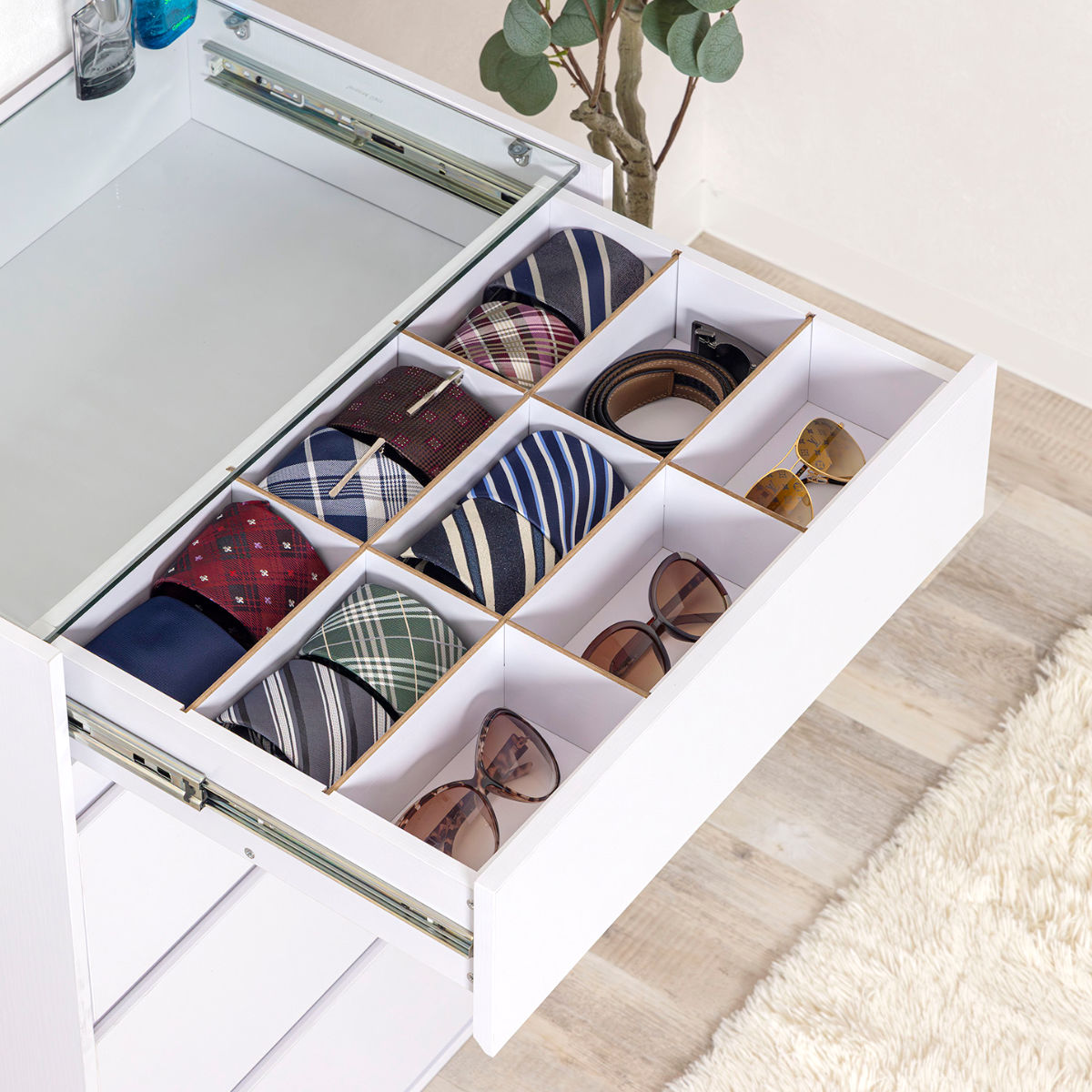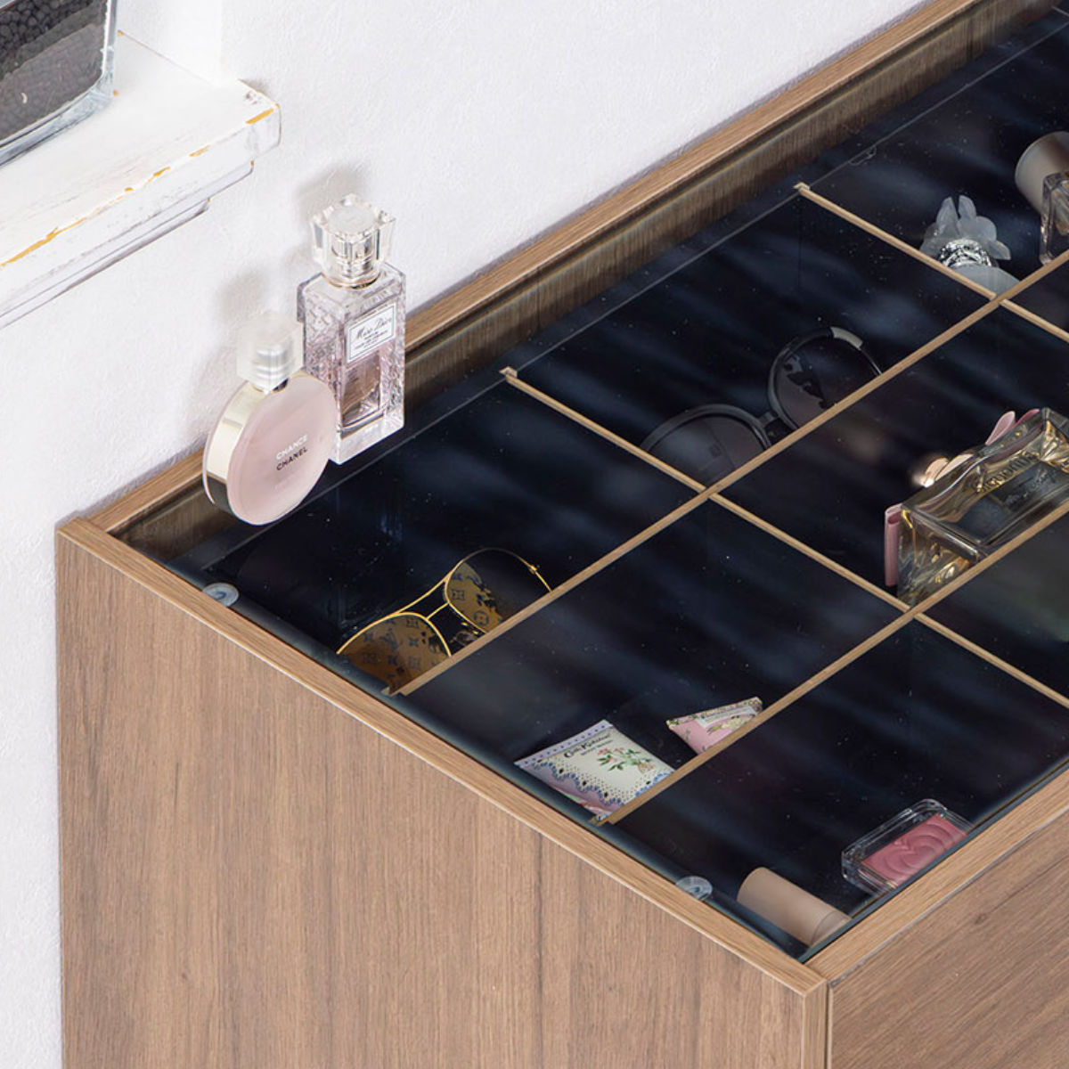 上段の天板には、8mm厚の強化ガラスを使用しています。アクセサリーなどを美しく飾りながら、ホコリや汚れから守り、きれいな状態を保ちます。
