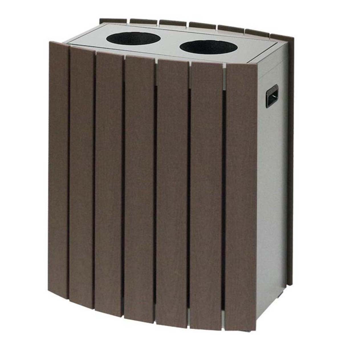 シックな木調デザインの屋外用ゴミ箱です。本体の周囲には木調パネルを配置し、ナチュラルで落ち着いた雰囲気を演出。屋外空間にも自然に溶け込みます。約43Lの容量で、施設や屋外スペースでの日常的なゴミ回収に適しています。公園や商業施設、オフィスビル、学校など、さまざまな場所で活躍する業務用ダストボックスです。