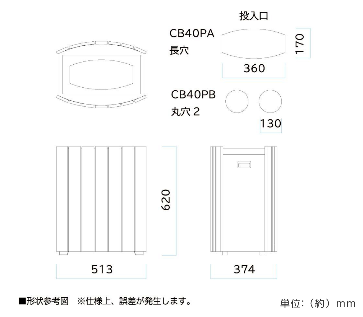 - 本体パネル:PET再生樹脂(再生100%)、樹脂 側板、投入口、中缶:SPCC