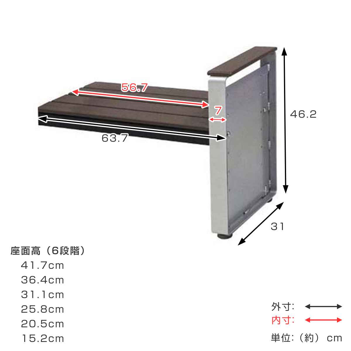 | サイズ | 約 幅63.7×奥行31×高さ46.2(cm) 座面高:6段階調節(15.2~41.7cm) |