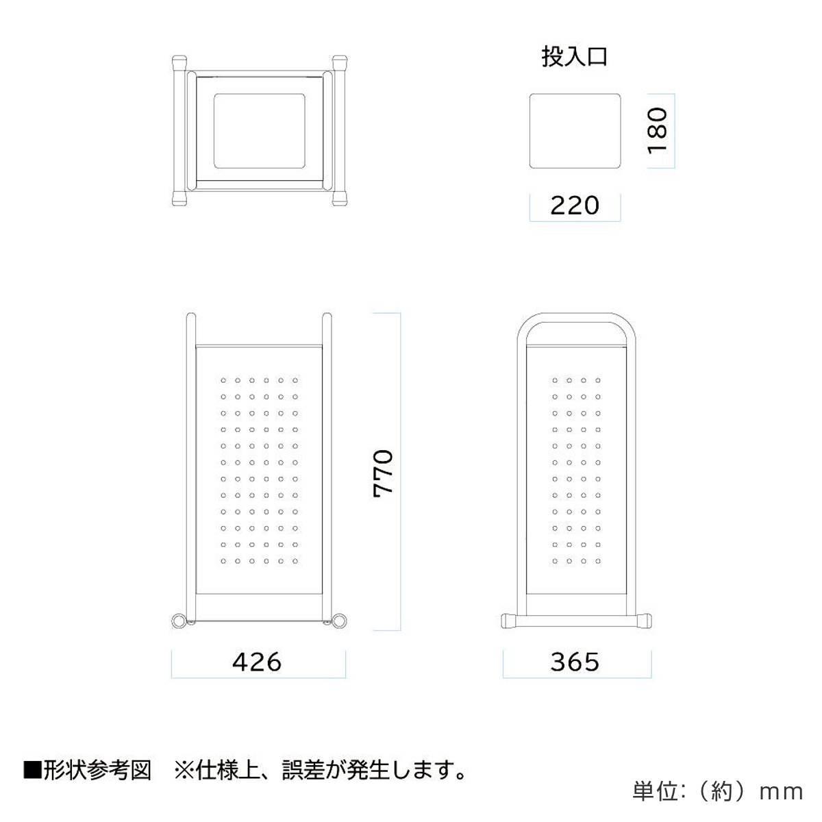 | 材質 | 本体・パイプ・側板・ベース板:スチール、粉体塗装 ゴムキャップ:エチレンプロピレンジエンゴム ビニール袋止め:ポリプロピレン |