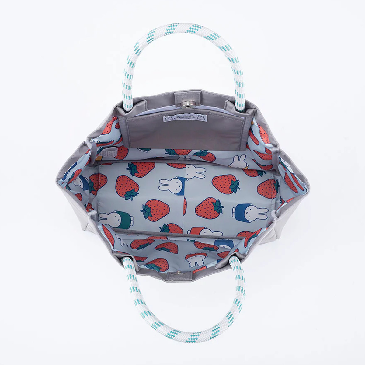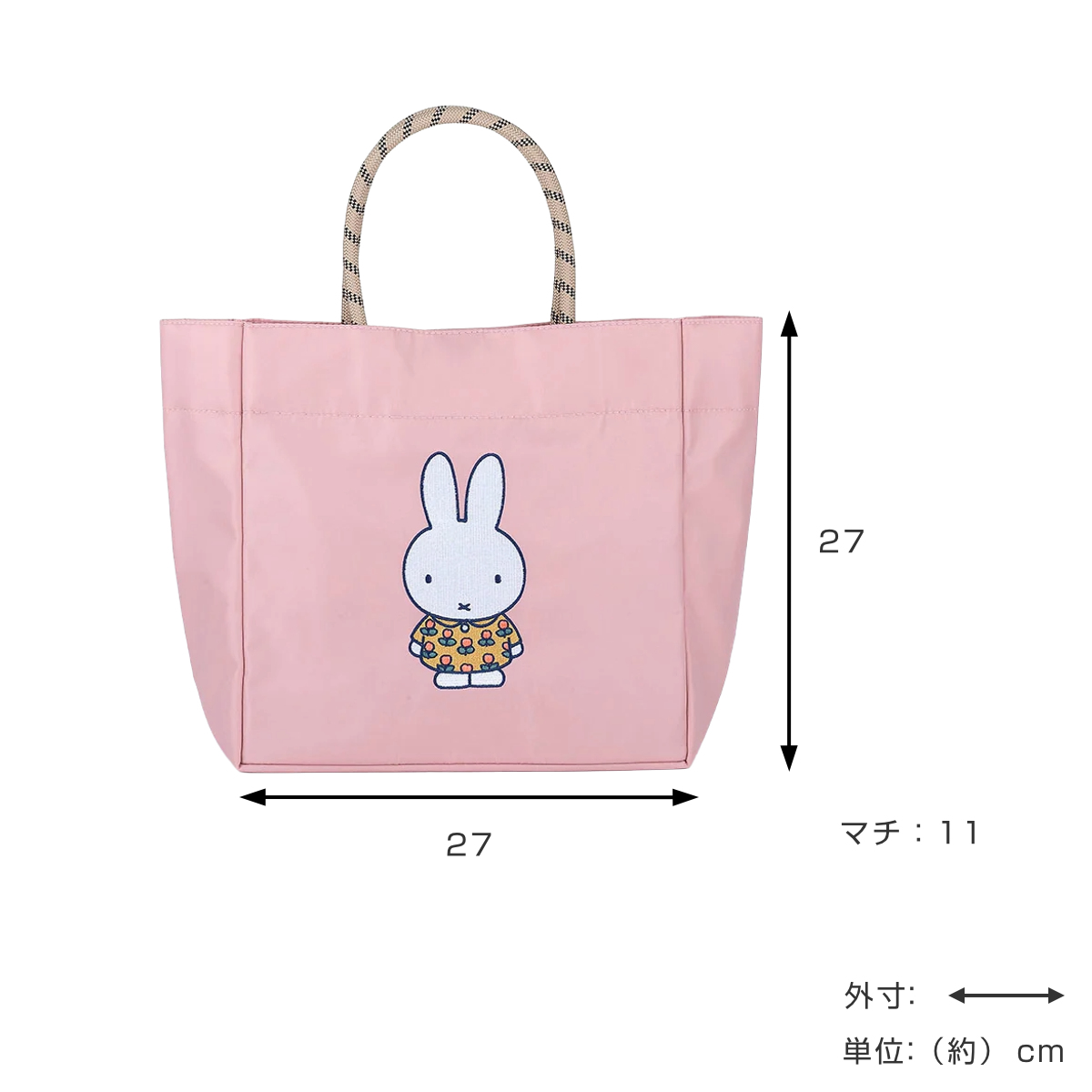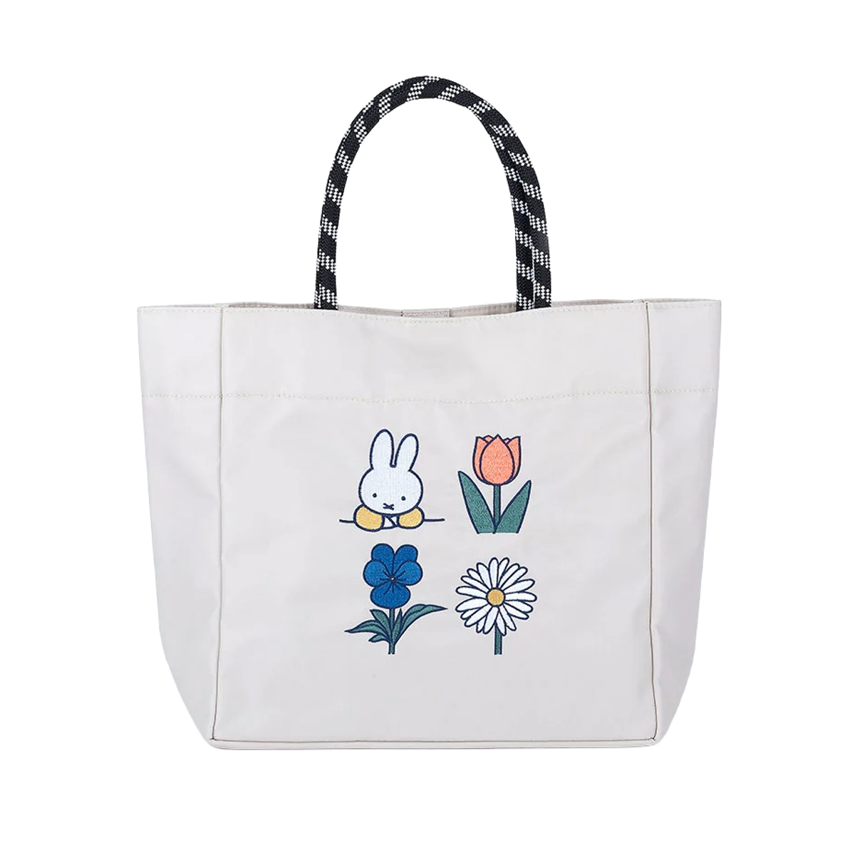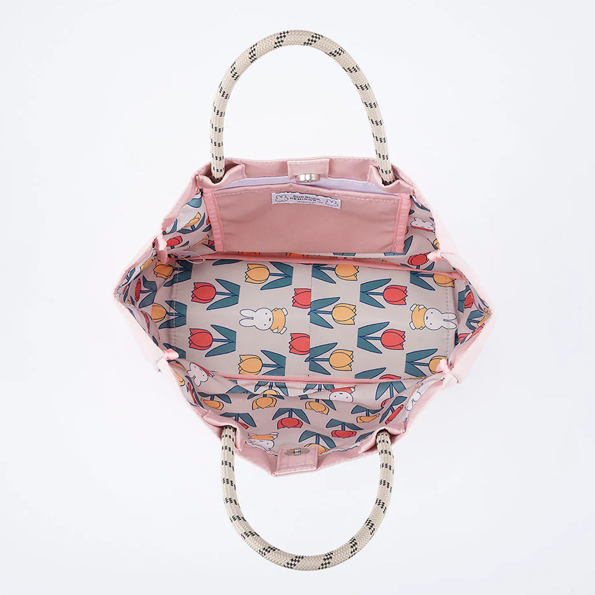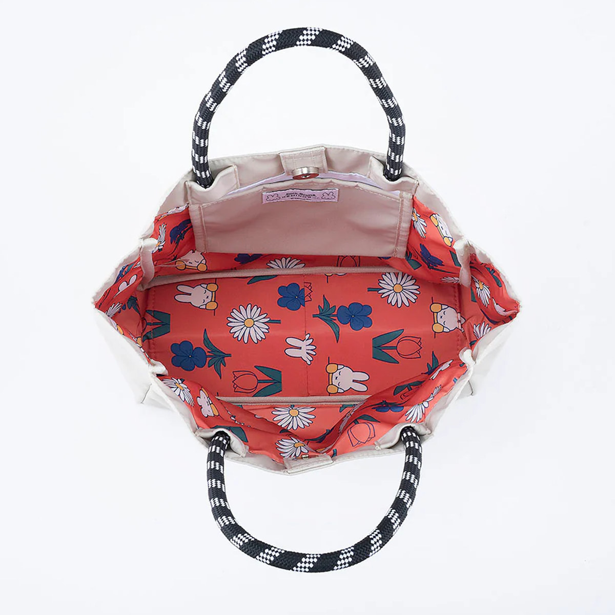 ロープハンドルと、フロントの大胆な刺繍がポイントのトートバッグです。バッグを開いた時にチラリと見える総柄の裏地がキュートです。