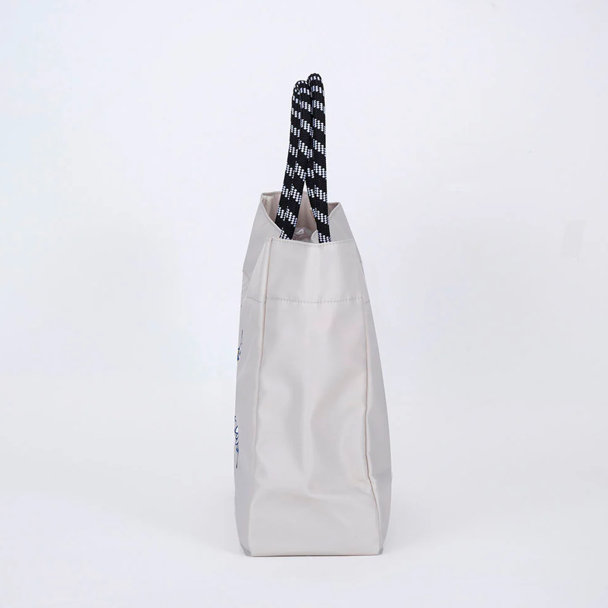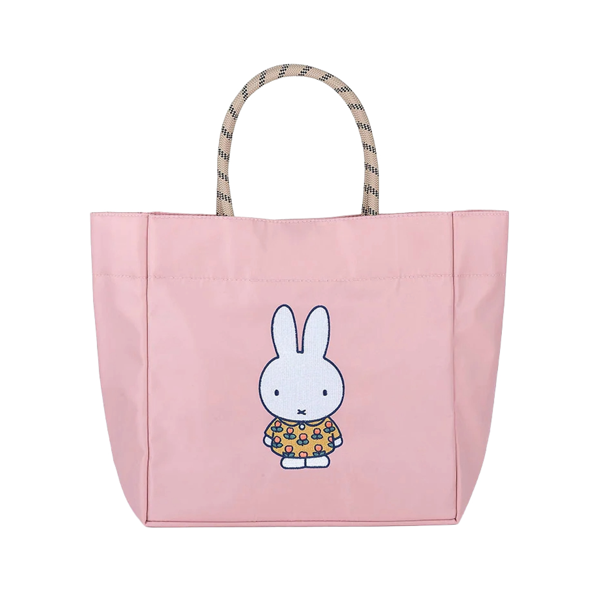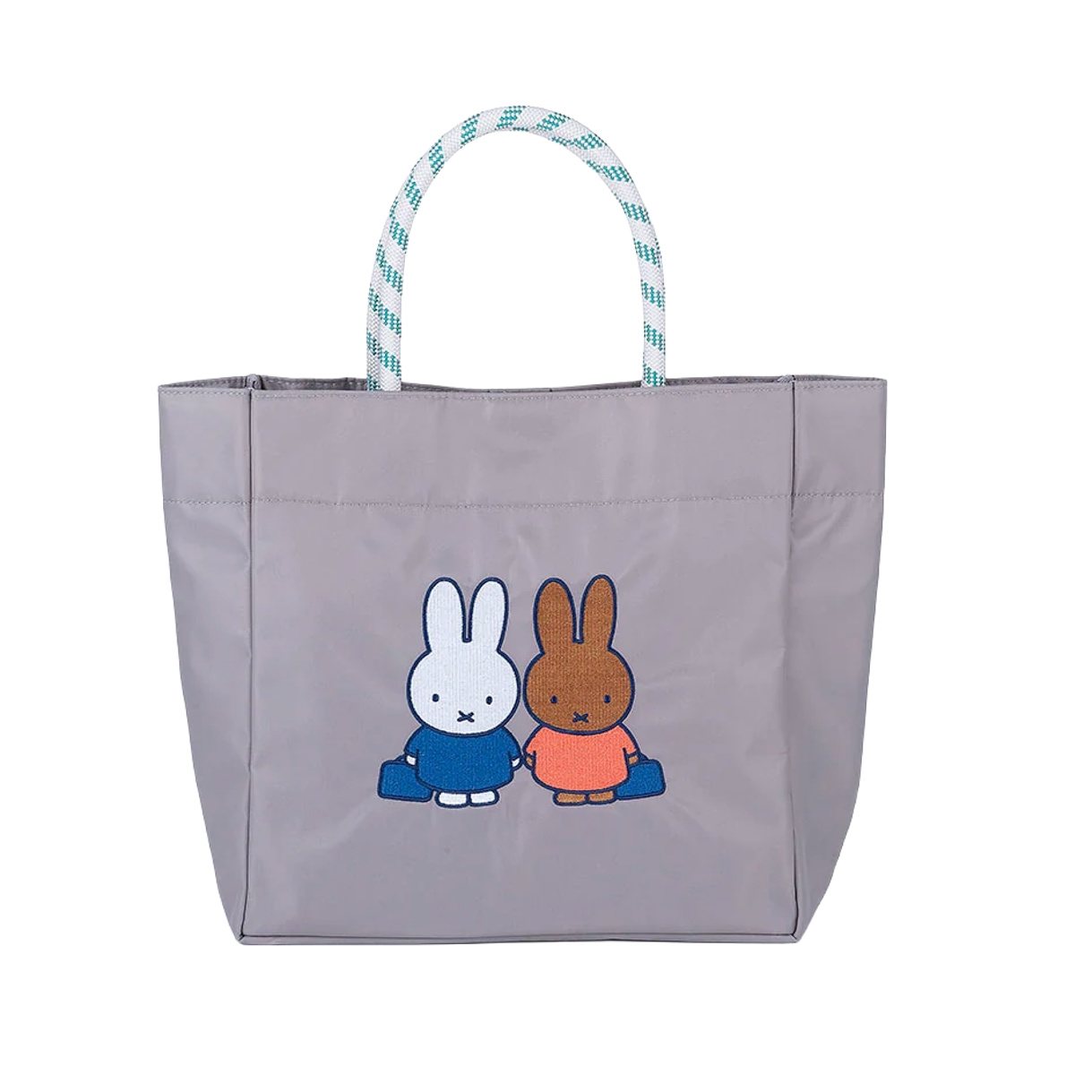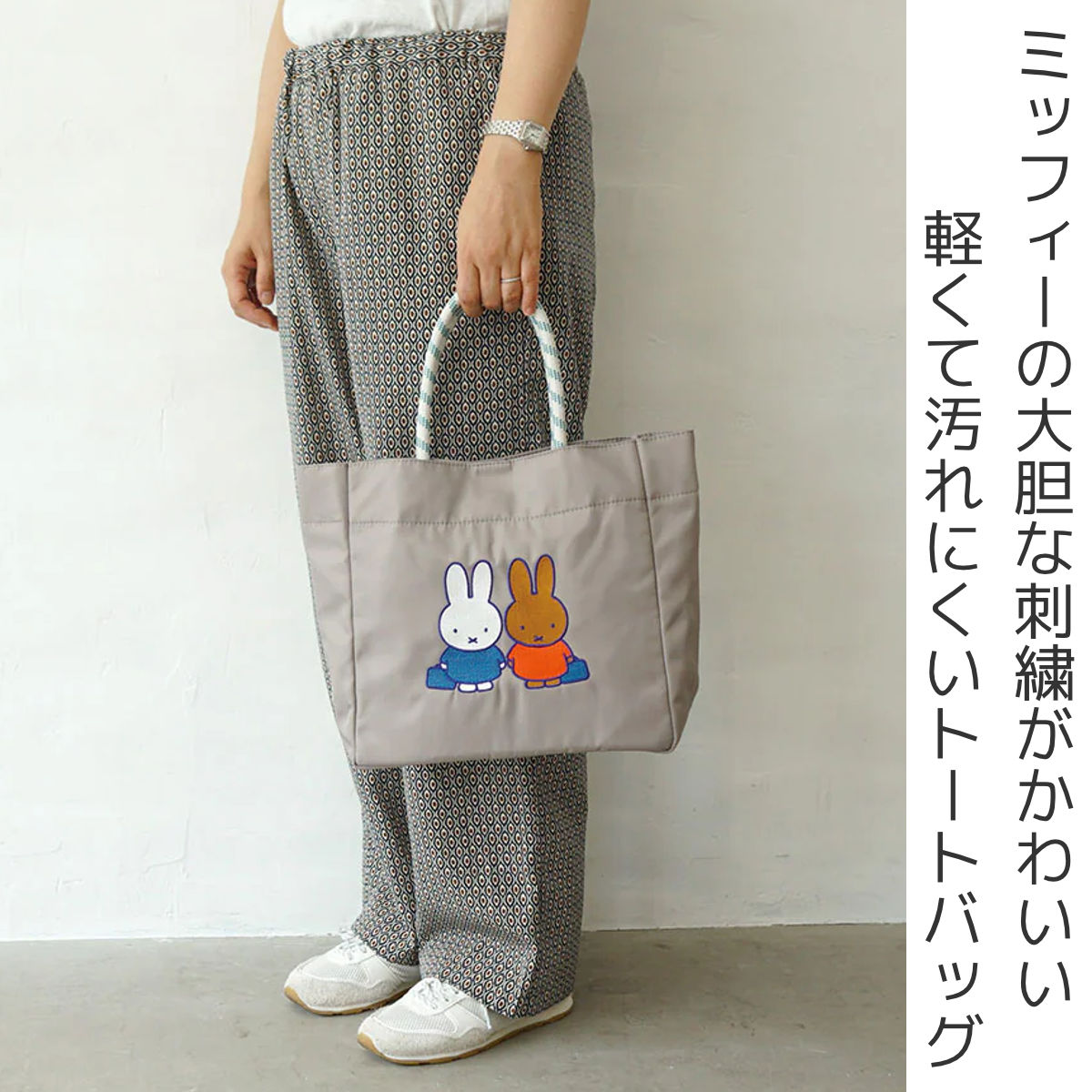 ロープハンドルと、フロントの大胆な刺繍がポイントのトートバッグです。バッグを開いた時にチラリと見える総柄の裏地がキュートです。