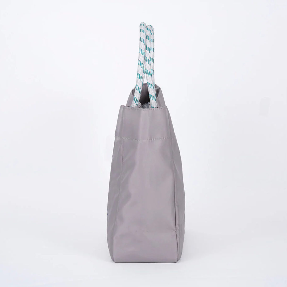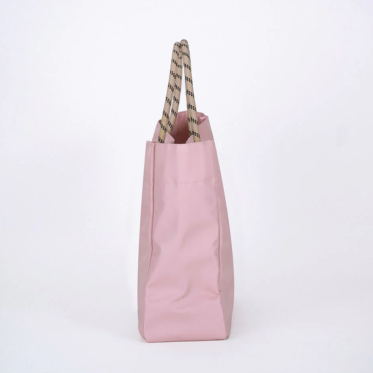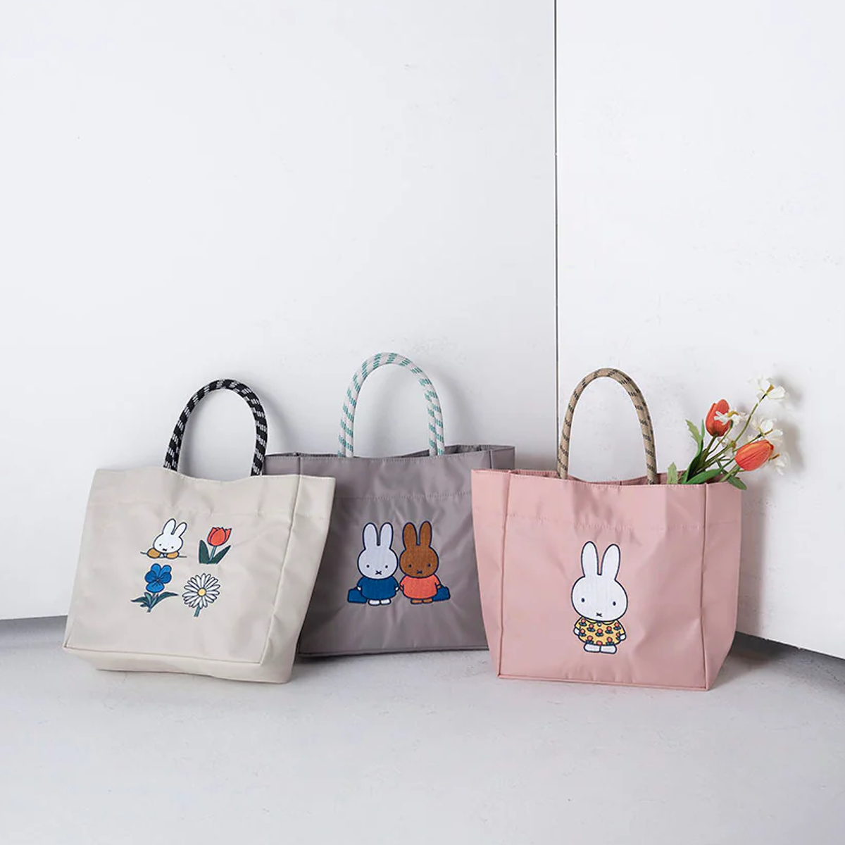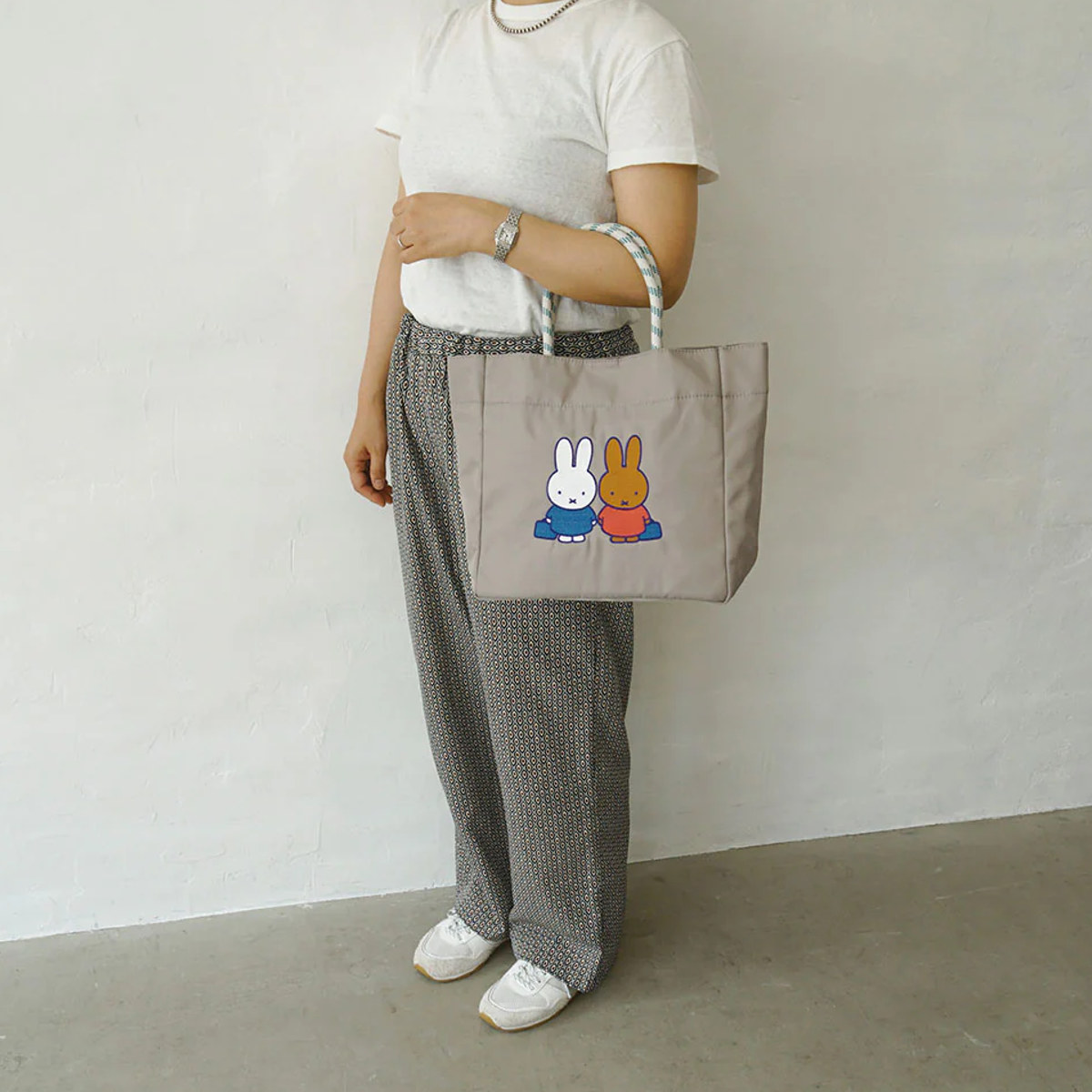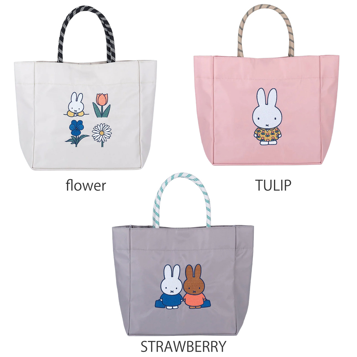 ロープハンドルと、フロントの大胆な刺繍がポイントのトートバッグです。バッグを開いた時にチラリと見える総柄の裏地がキュートです。