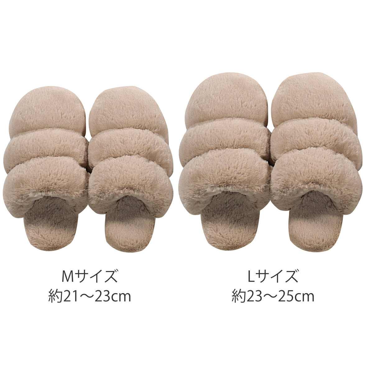 柔らかく優しい肌触りのボアを全体に使用したスリッパです。上品な見た目と心地良い履き心地にこだわっており、足元を暖かく包み込み、優しくフィットします。