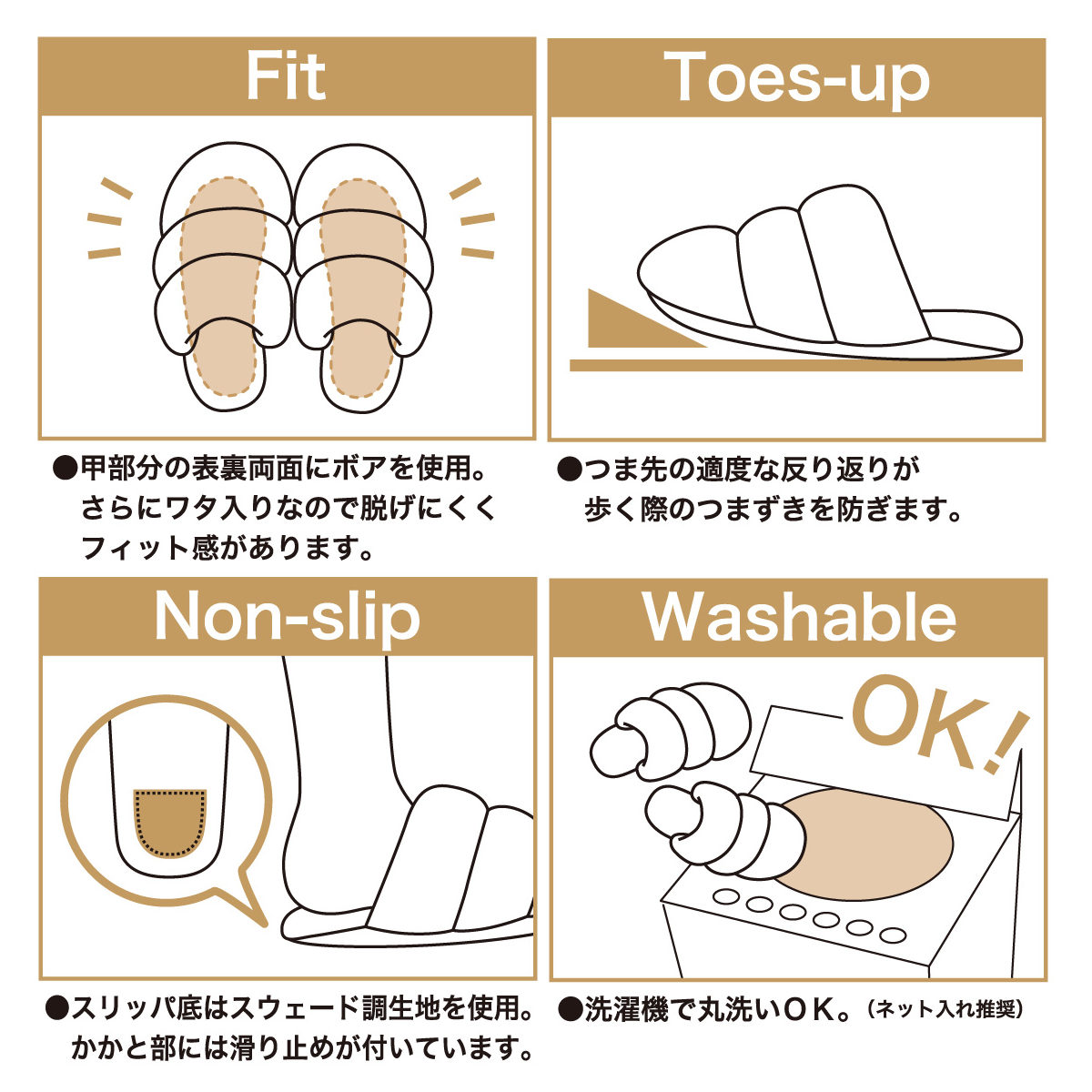 毛足が長く保温性に優れたボア素材です。柔らかい肌触りで足を暖かく包み込んでくれますので、寒い季節にもぴったりです。甲部分の表裏両面にボアを使用しており、さらにワタ入りなので脱げにくくフィット感があります。
