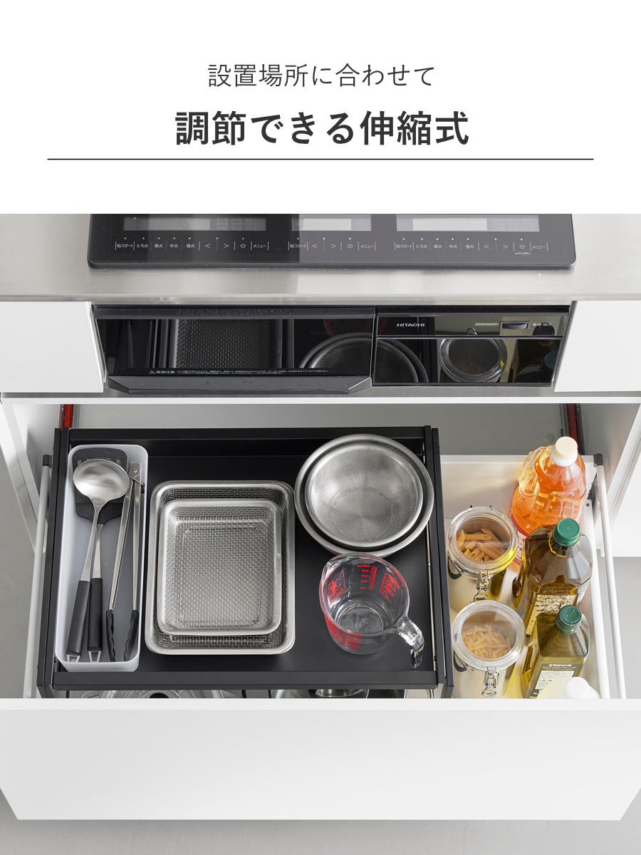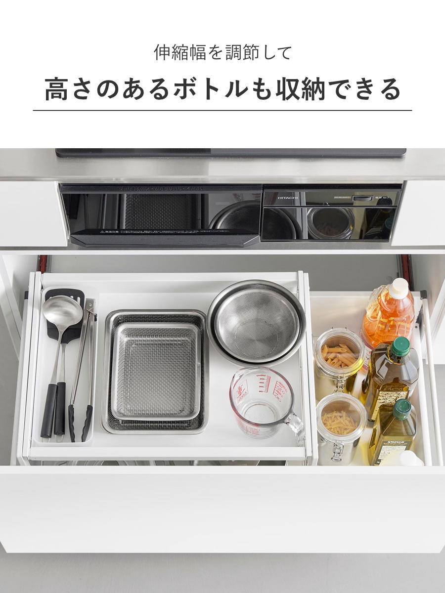 調味料のボトルや高さのある保存容器は、伸縮幅を調節して横のあいた空間に収納できます。