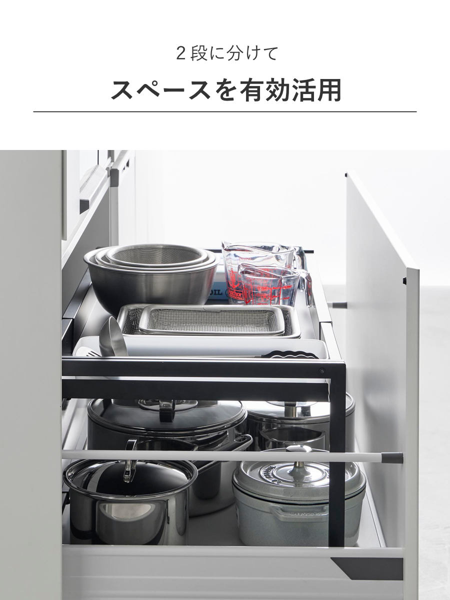 設置するだけで引き出しの中を2段に分けて収納できます。デッドスペースになりがちな引き出し上部の空間を収納スペースとして有効活用できます。