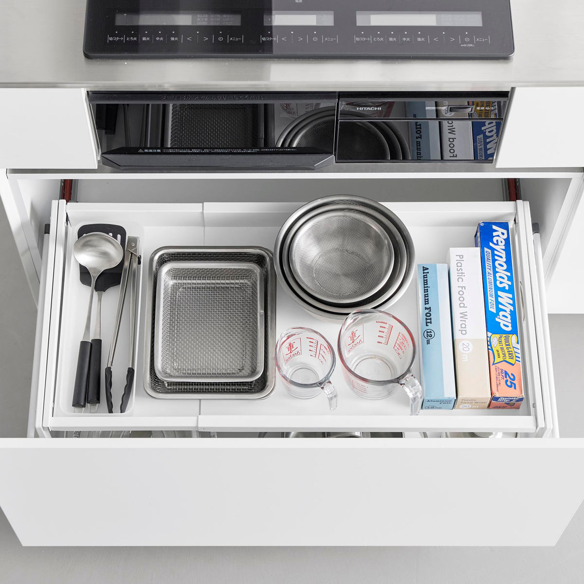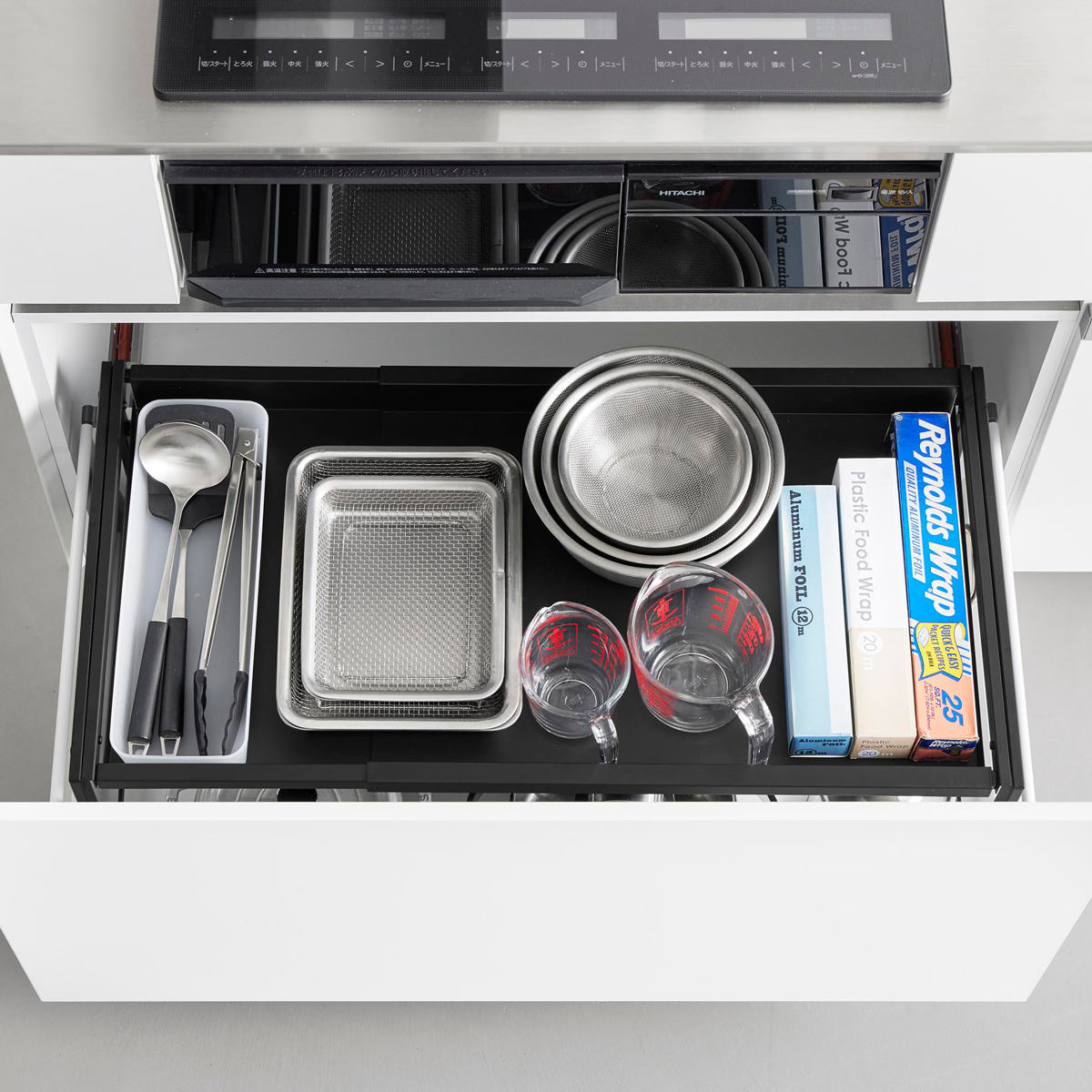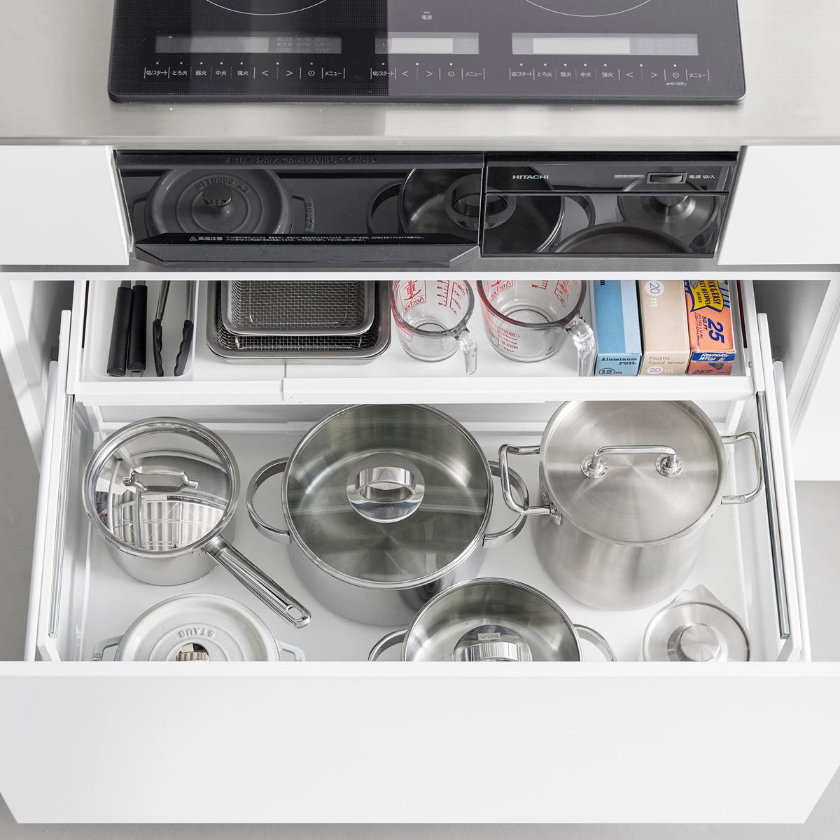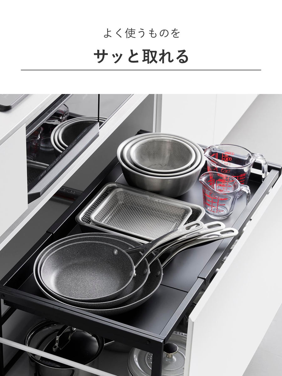 調理でよく使うフライパンなどの収納にも便利です。引き出しを開けてサッと取れる場所によく使う物を置いておくと作業がスムーズにできます。