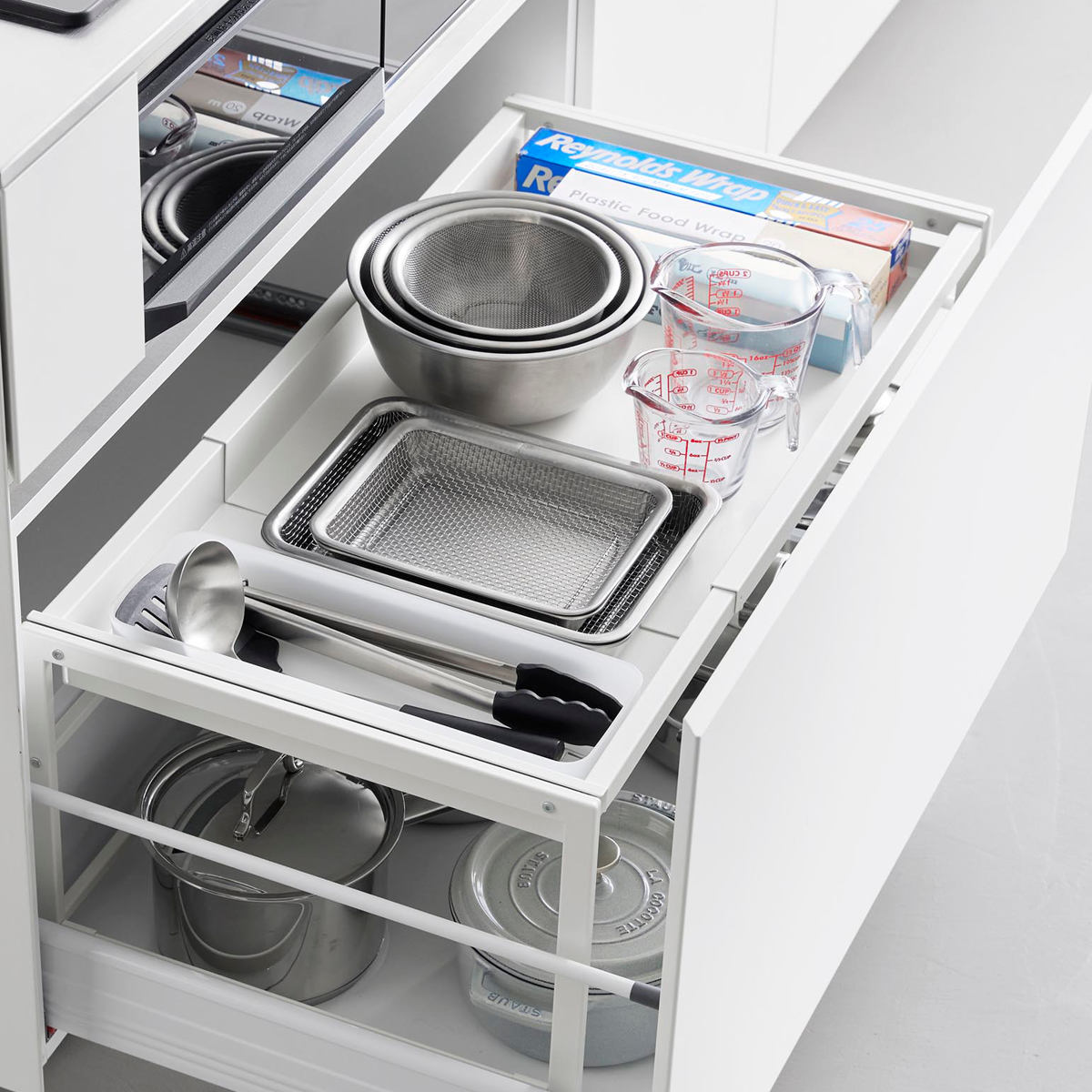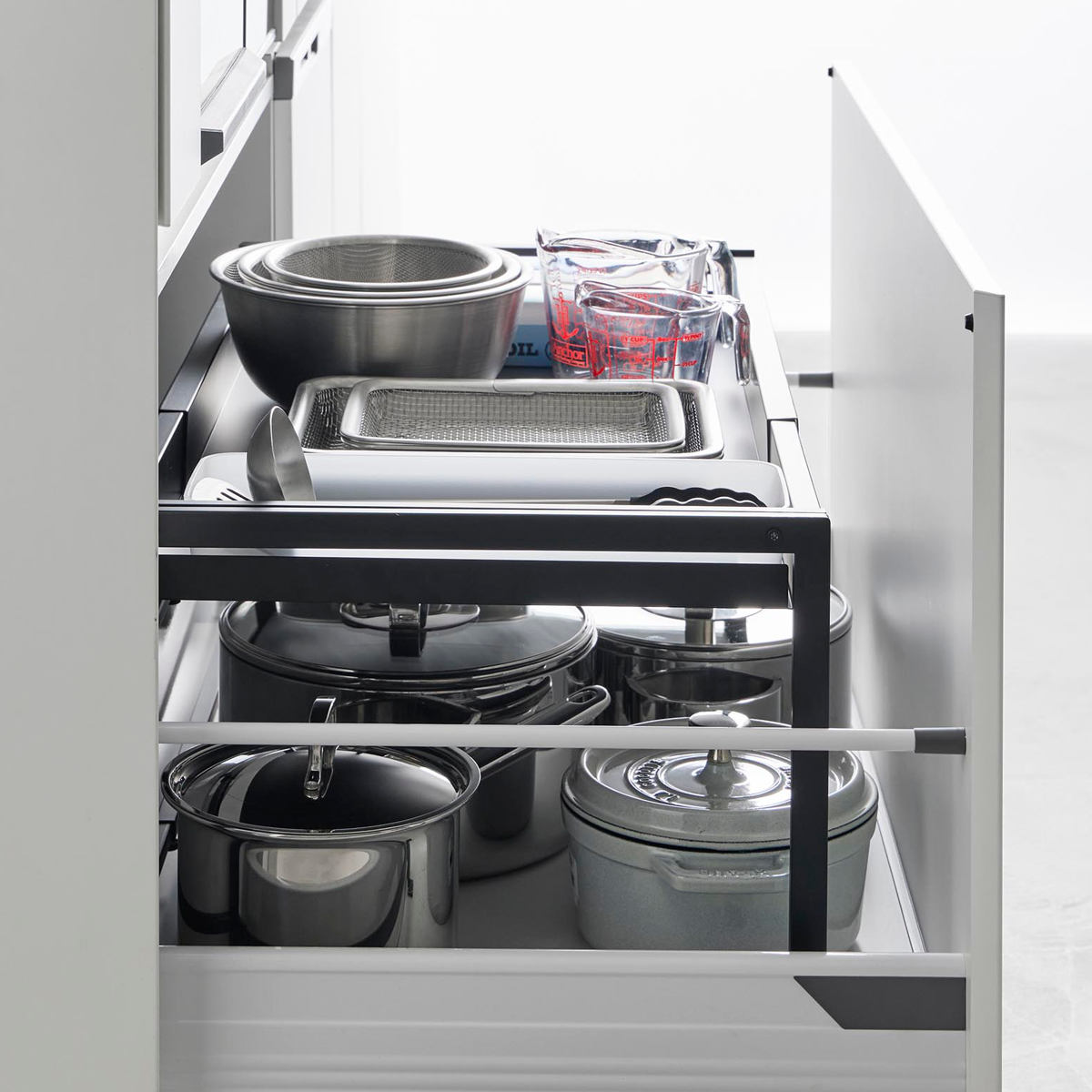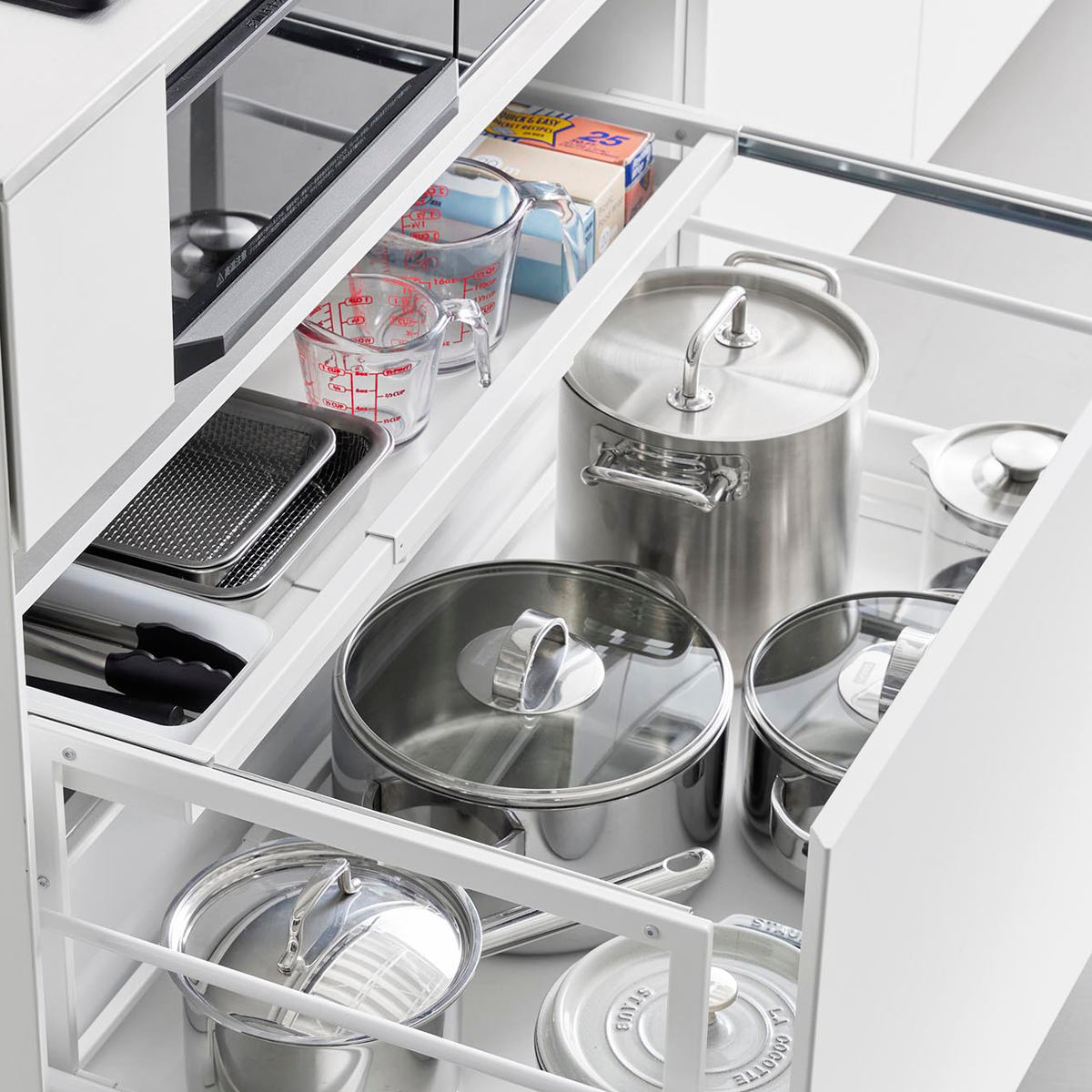 調理でよく使うフライパンなどの収納にも便利です。引き出しを開けてサッと取れる場所によく使う物を置いておくと作業がスムーズにできます。