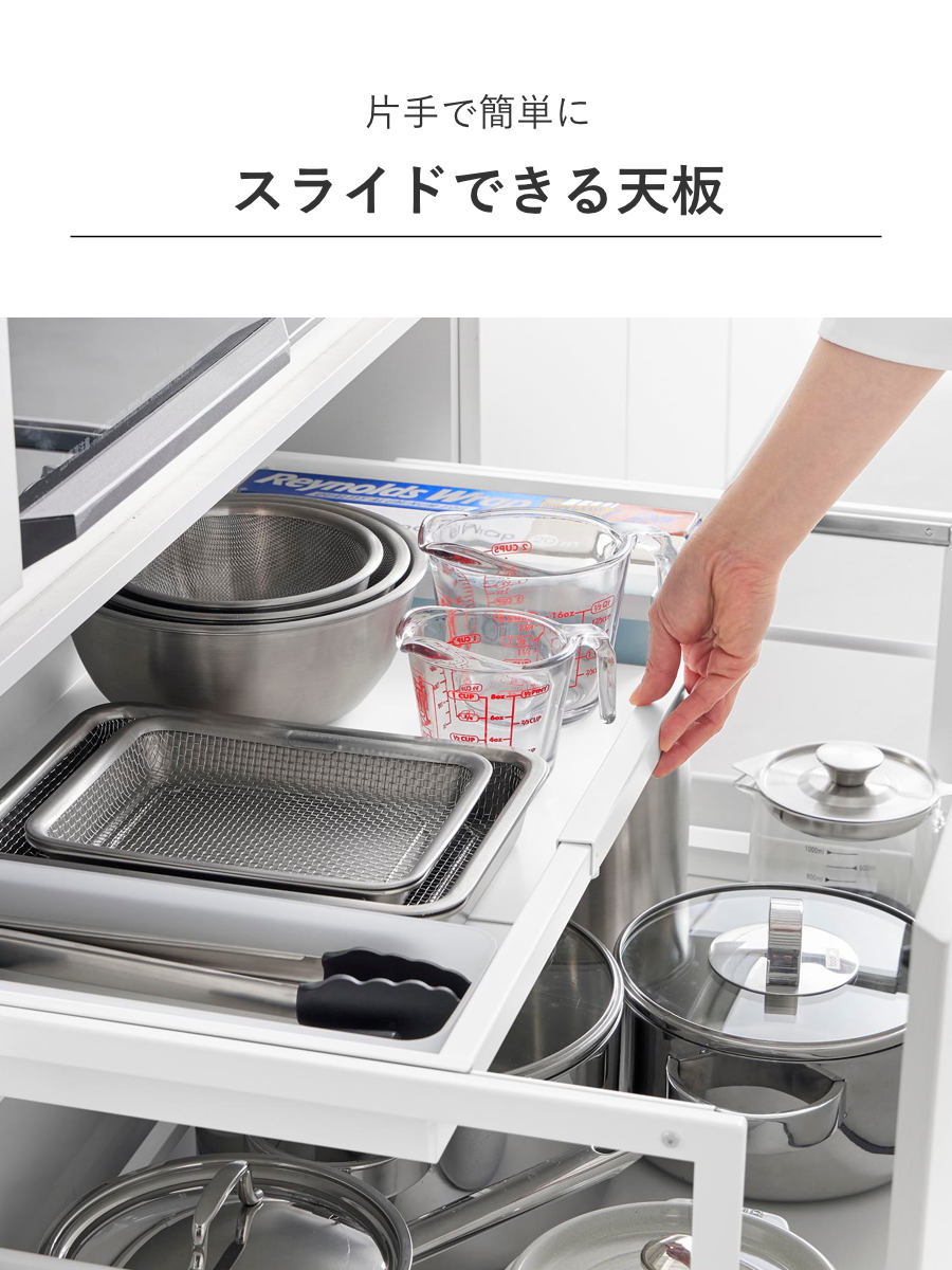 天板は片手で簡単にスライドでき、奥へスライドさせることで下に収納した物もスムーズに取り出せます。
