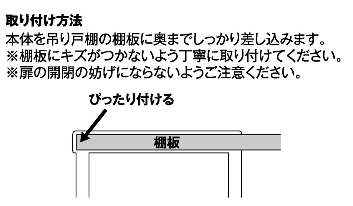 | 注意事項 | ※設置場所のサイズや厚さ・形状・材質によっては取り付けできない場合があります。 ※ガラス戸へのご使用はお避けください。 |