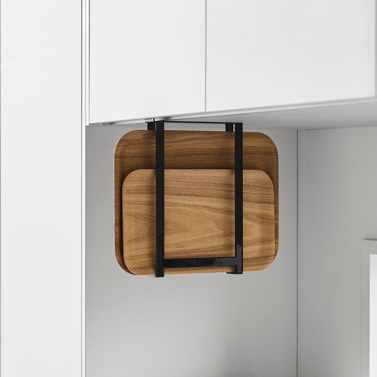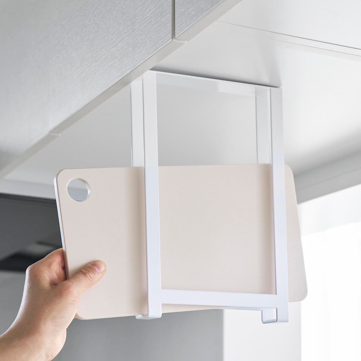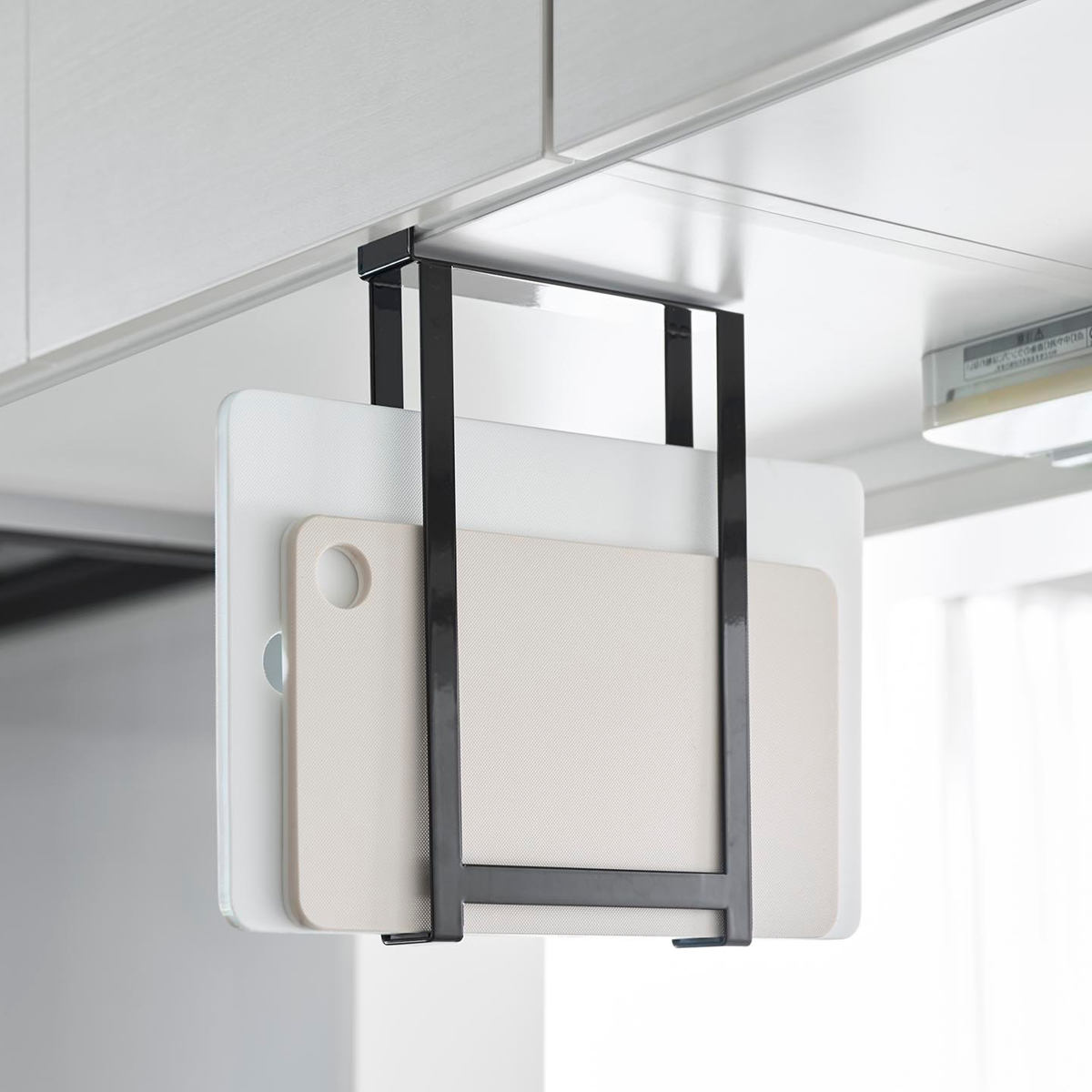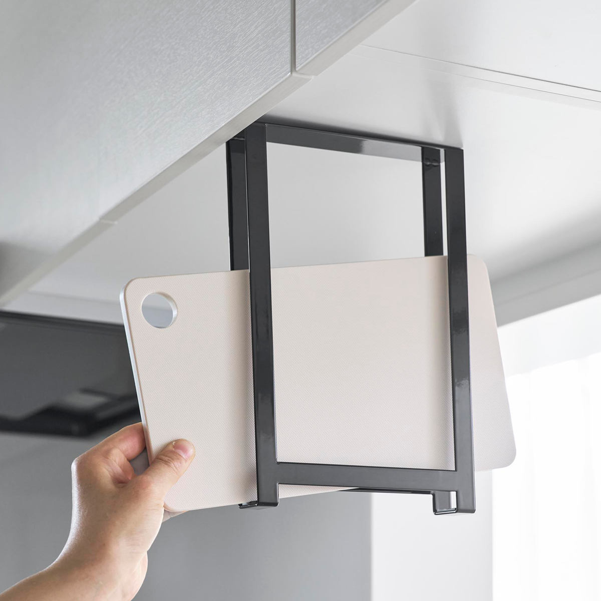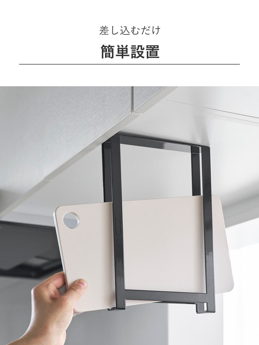 戸棚下に差し込むだけで設置できるまな板ホルダーです。調理台のすぐ上にまな板を収納すると使いたい時にサッと使用できます。