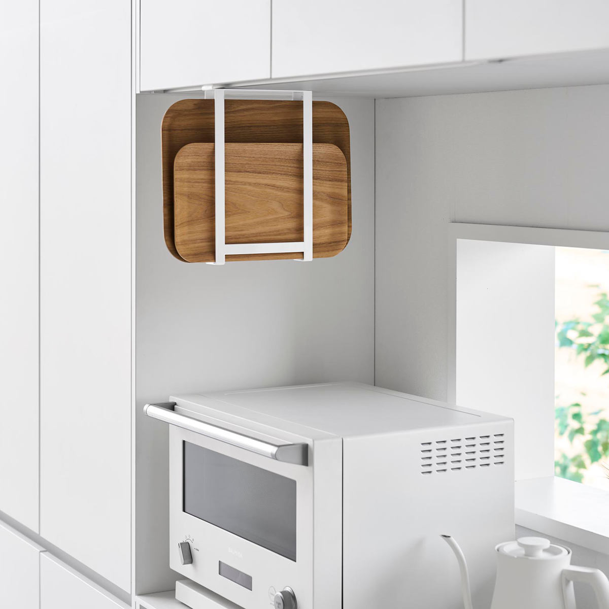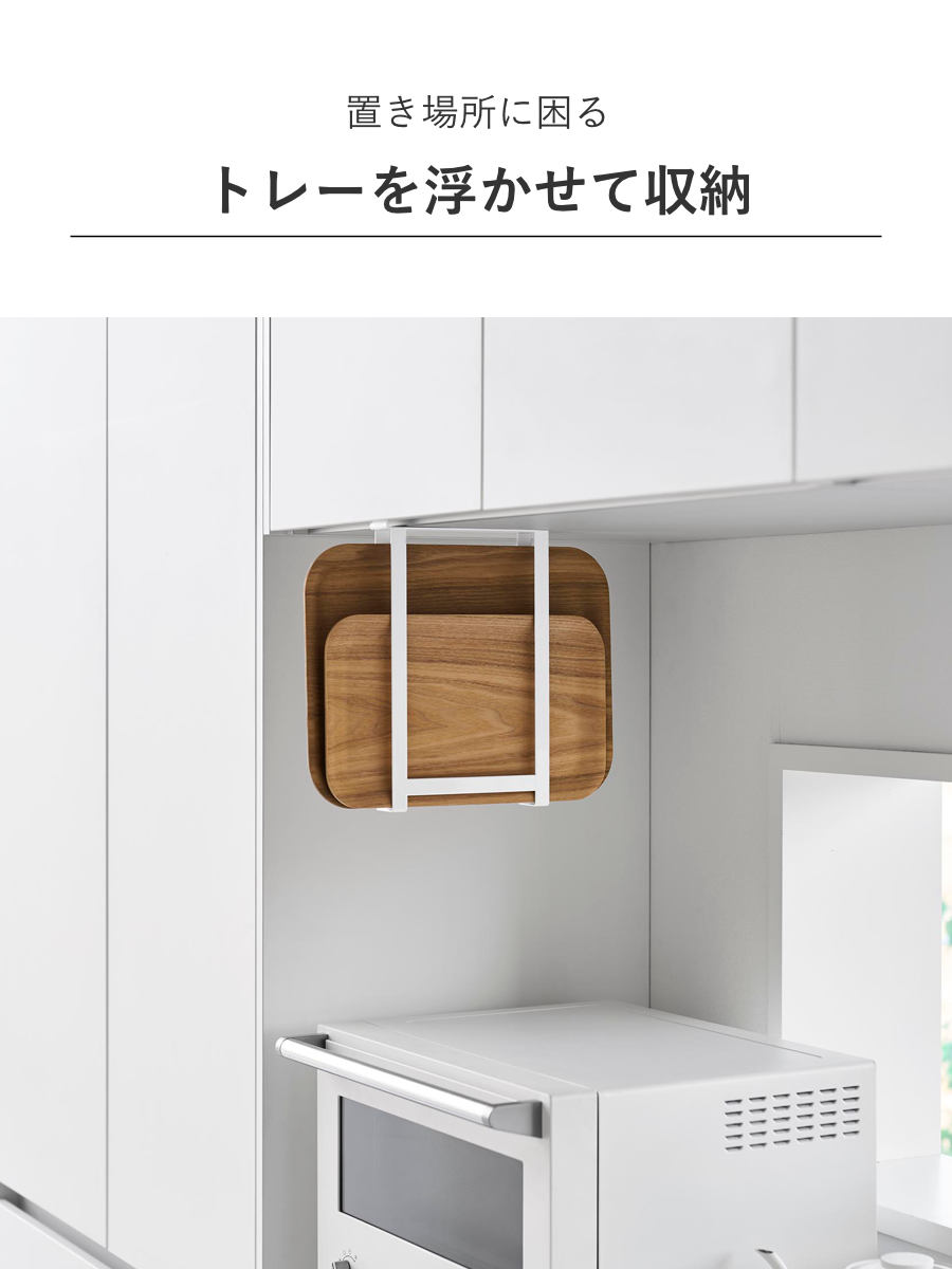 置き場所に困るトレーを浮かせて収納できて、戸棚下のスペースを有効活用できます。