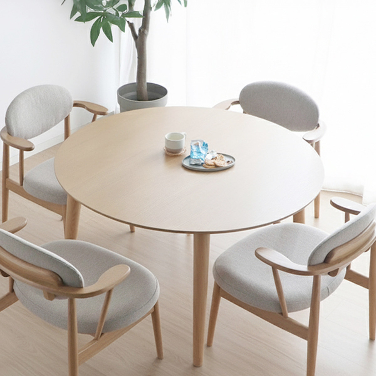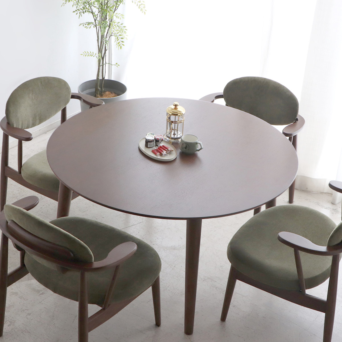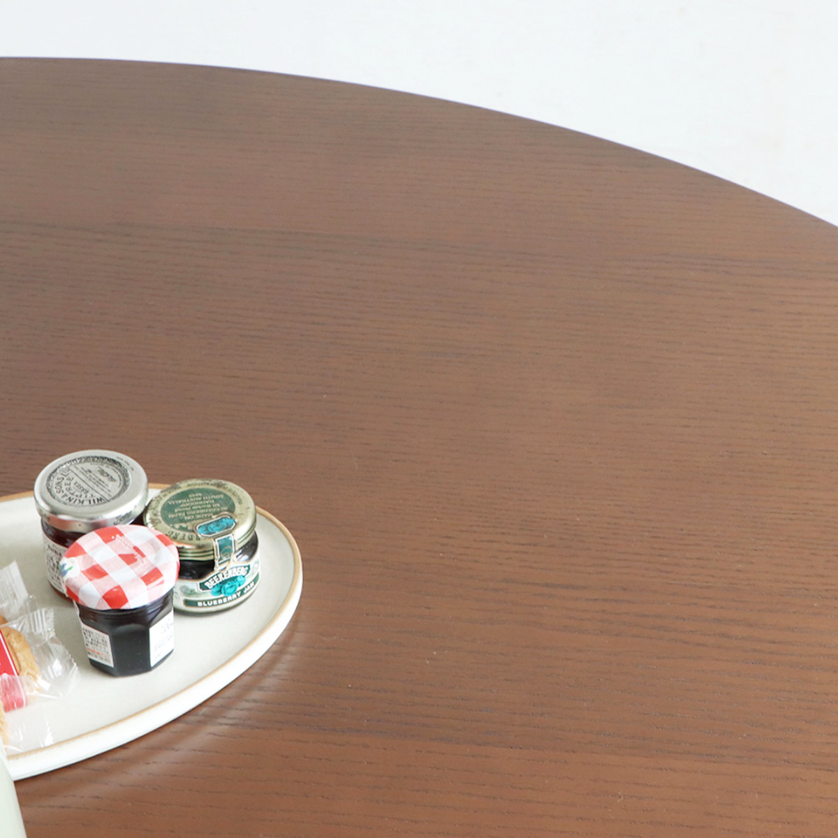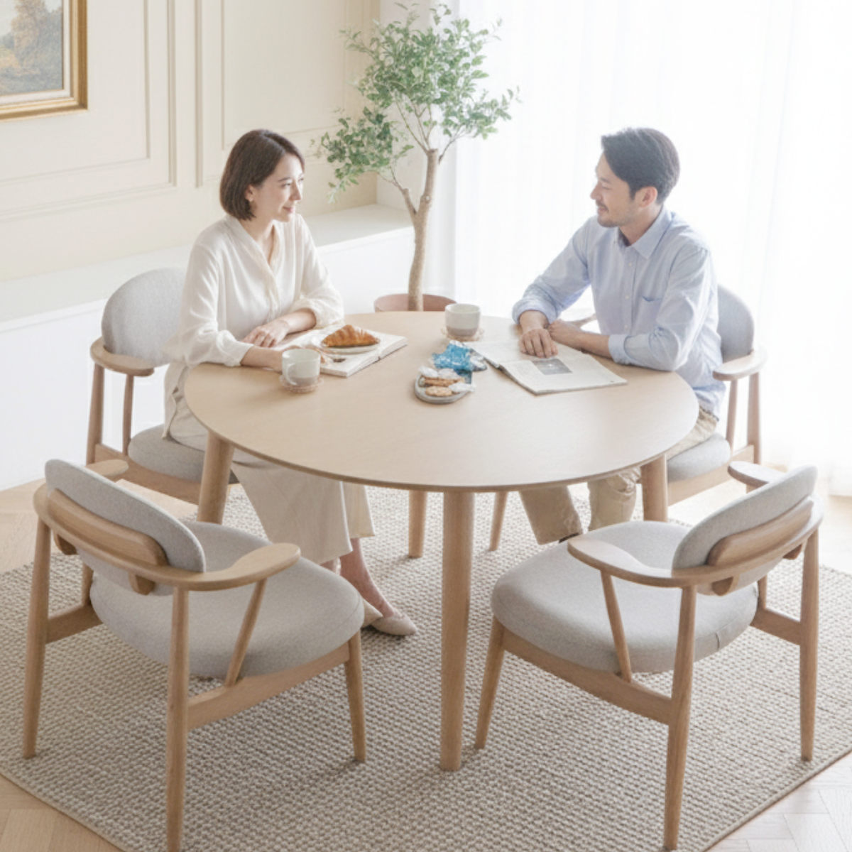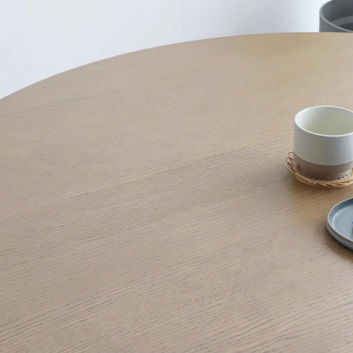 丸いフォルムが空間をやさしく包み込む、直径120cmのダイニングテーブル。角のない円形デザインは、家族や友人と自然に顔を合わせて座れるため、会話が弾む心地よいダイニング空間をつくります。