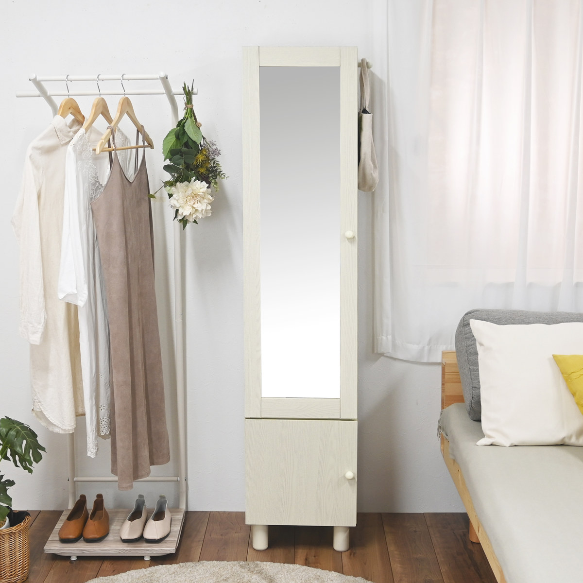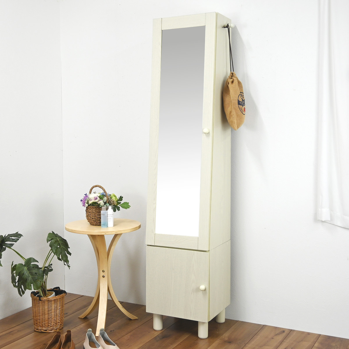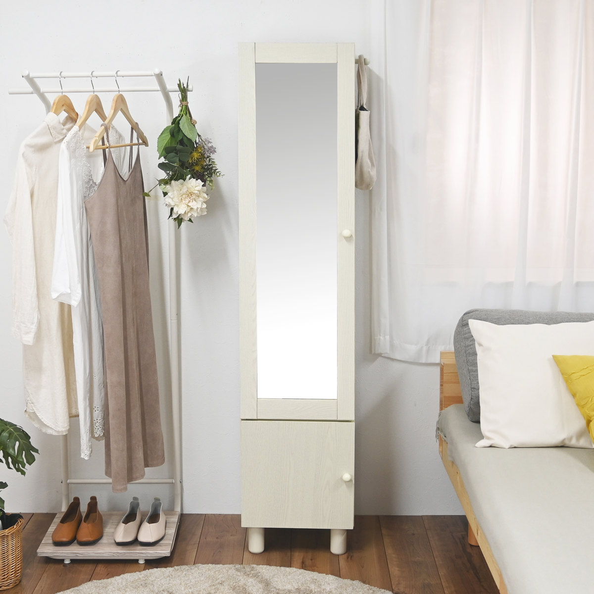 全身がしっかり映るミラーと収納を一体化した、省スペース設計のスリムラックです。見た目の美しさと使いやすさを兼ね備え、日常の身支度を快適にサポートします。