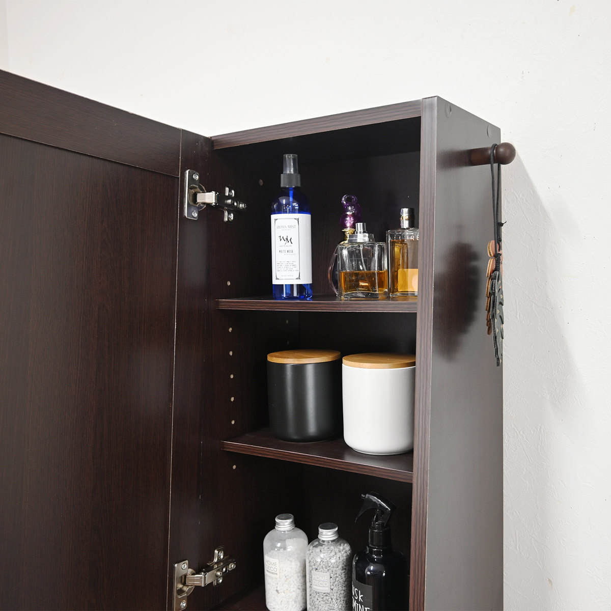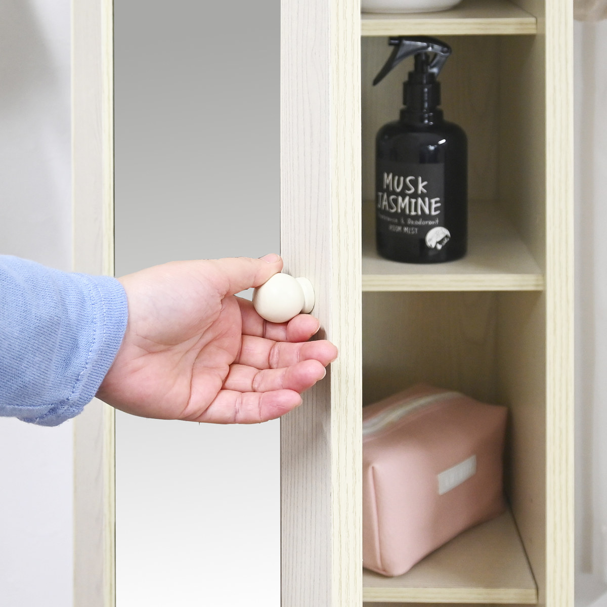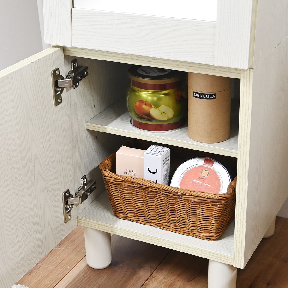 上の扉内の収納スペースは、1枚の固定棚と3枚の可動棚で仕切ることができます。小物類からドライヤーなどのかさばるアイテムまでしっかり収納可能。身の回りの物をまとめて収納でき、空間をすっきりと整えます。