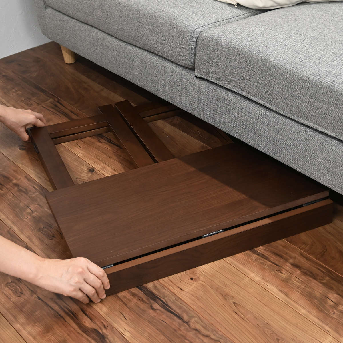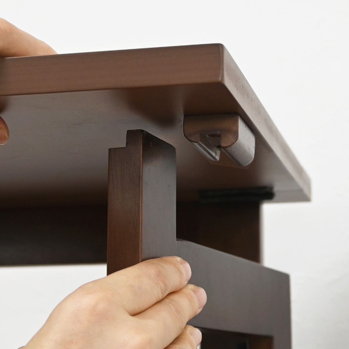 両脚を広げて天板裏のストッパーにはめるだけで、簡単に設置可能。必要なときにすぐ使える手軽さが魅力です。