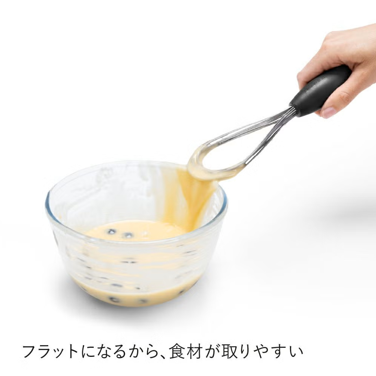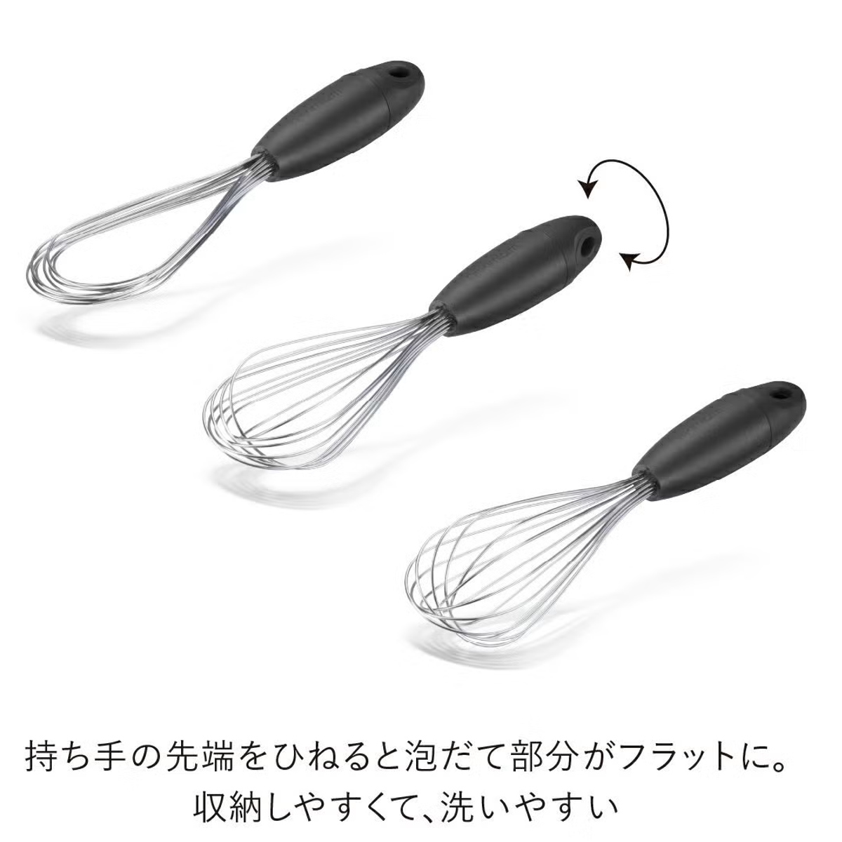 持ち手の先端をひねると、ワイヤー部分が3段階に変形する泡だて器です。用途に合わせて形状を変えられるため、混ぜる・泡立てる・すくうなど幅広く活躍します。1本でさまざまな調理に対応できる万能タイプです。