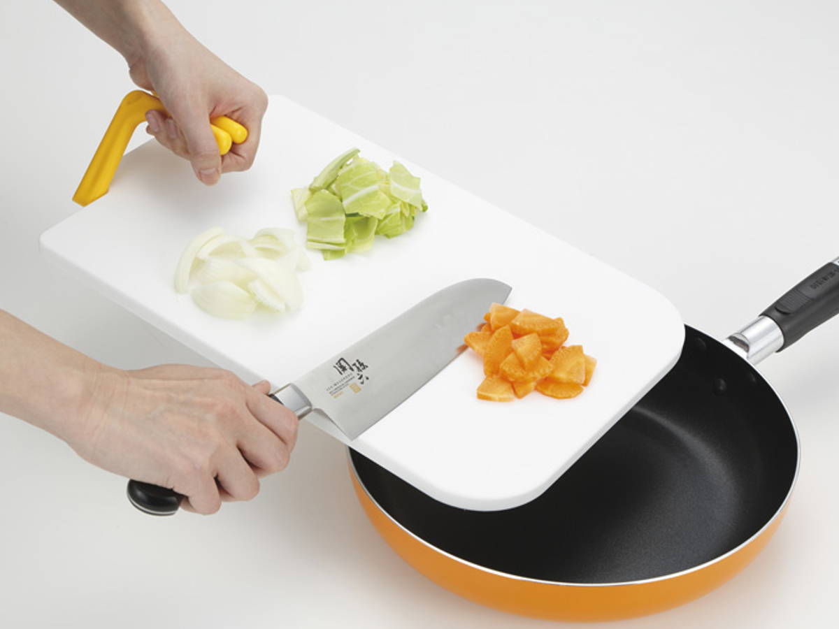 ハンドル付きの、ちょっとかわいいデザインのまな板です。切った食材をそのままお鍋やフライパンへサッと運べるので、調理もスムーズです。