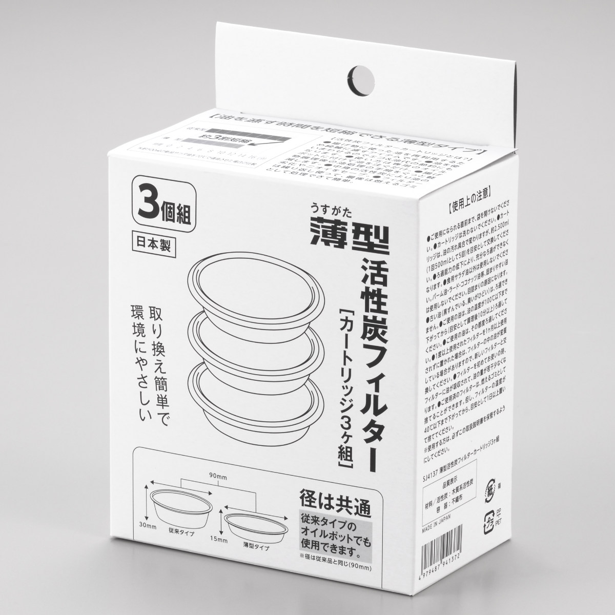 オイルポットに設置して使用する交換用の「薄型活性炭フィルター」です。活性炭フィルターを通すことで、揚げカスはもちろん、油の酸化やニオイの原因となる細かな不純物をしっかり吸着します。