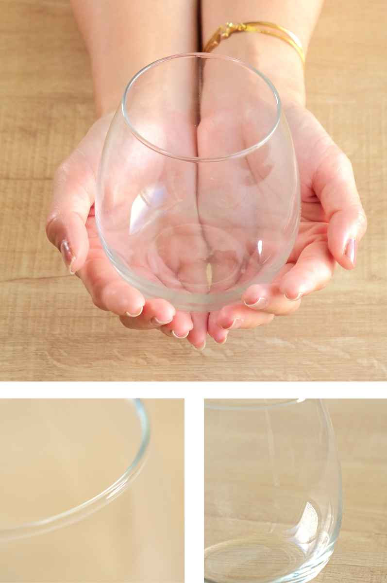 一般的なワイングラスと違い、ステム(足)が付いていません。その分扱いやすく、気軽にワインをお楽しみいただけます。また、カクテルやフローズンドリンク、ミニパフェなど幅広くお使いいただけます。