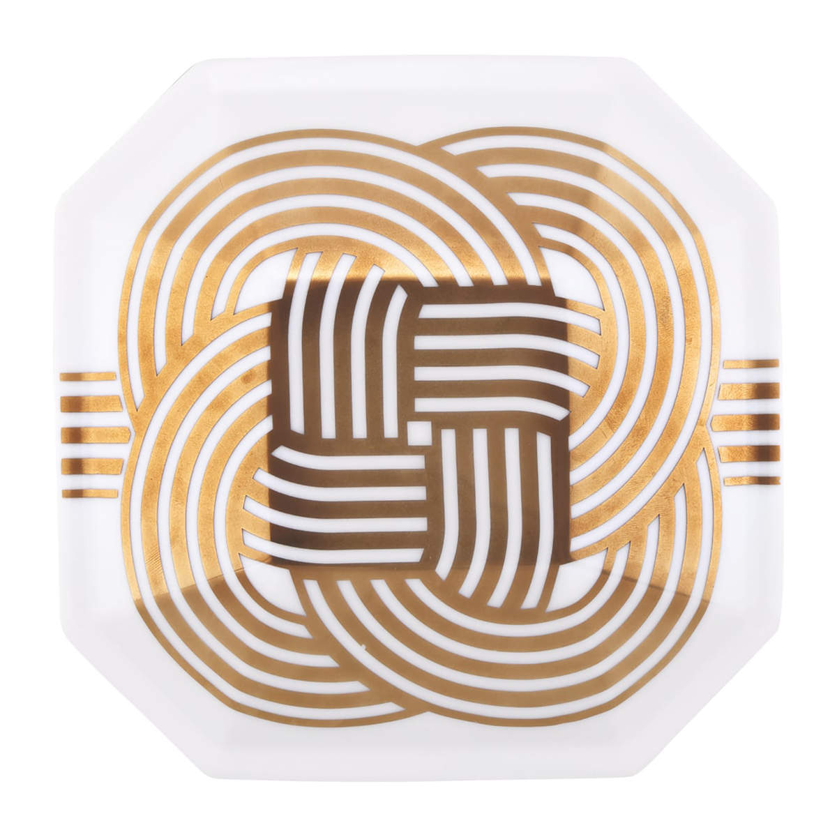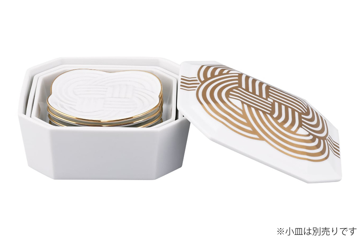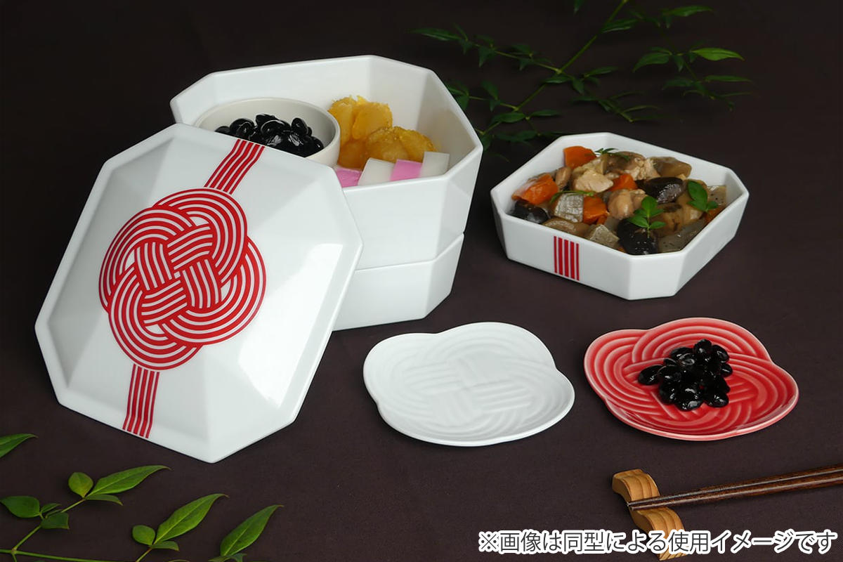 「結び」を金で絵付けした、特別な日を彩る3段重箱です。縁起が良い八角形の隅切重箱は、上品でモダンな印象を与え、現代の食卓にも合わせやすく、華やかな盛り付けが可能です。