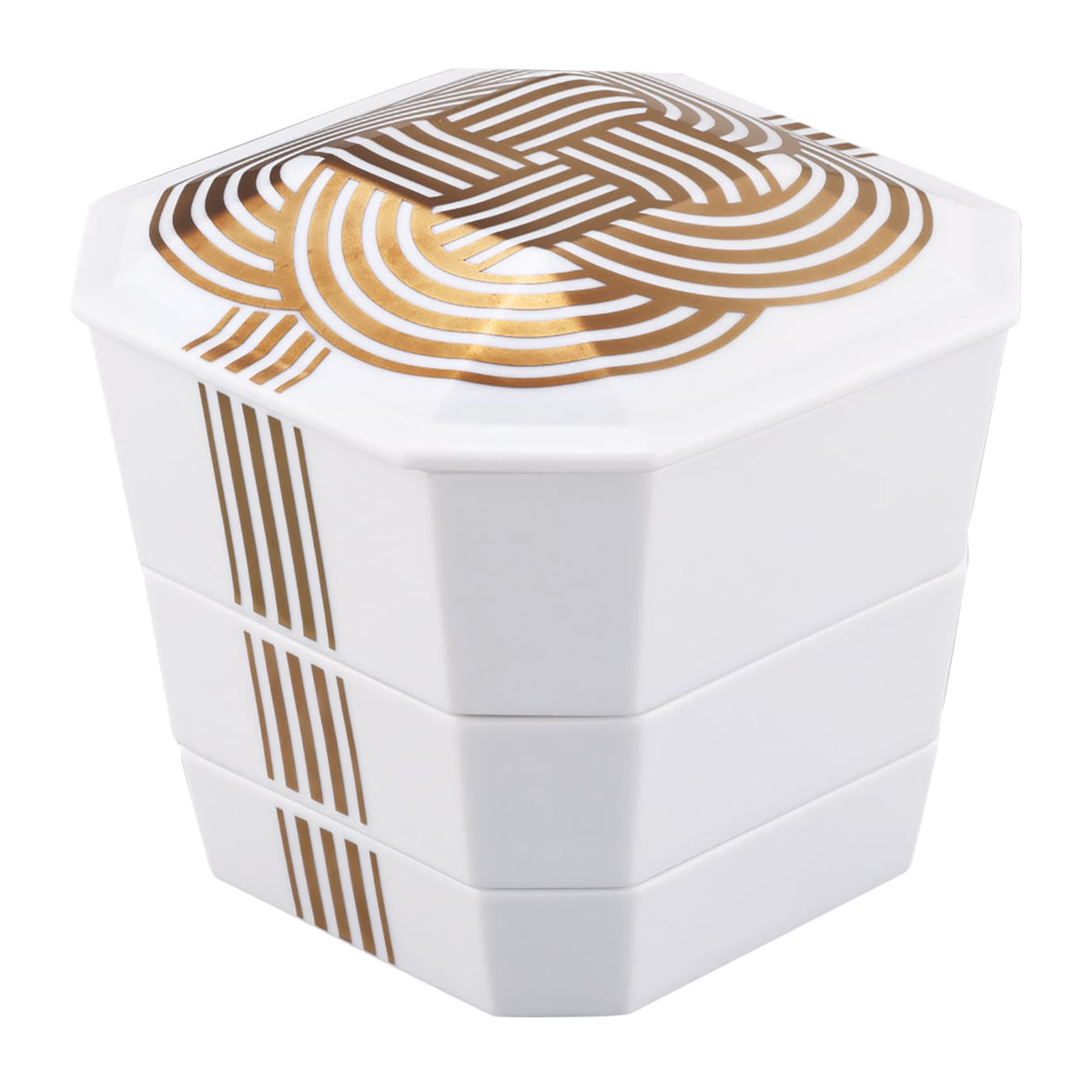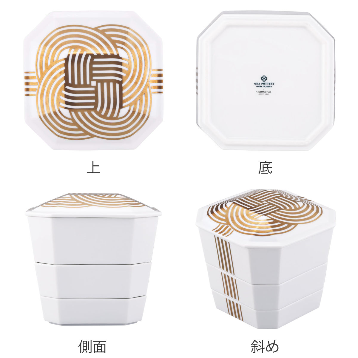●「結び」を金で絵付けした、特別な日を彩る3段重箱です。