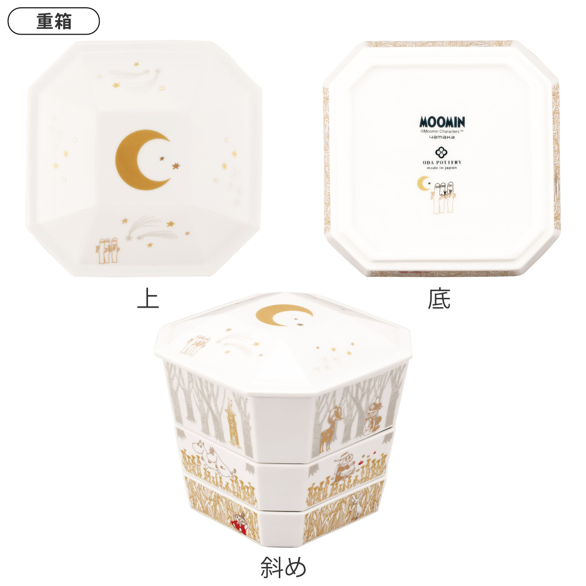 ひな祭りや誕生日、入学祝やクリスマスパーティーなど、特別な日を彩るムーミンの3段重箱です。縁起が良い八角形の隅切重箱は、上品でモダンな印象を与え、現代の食卓にも合わせやすく、華やかな盛り付けが可能。取り皿として使える小皿4枚付きです。