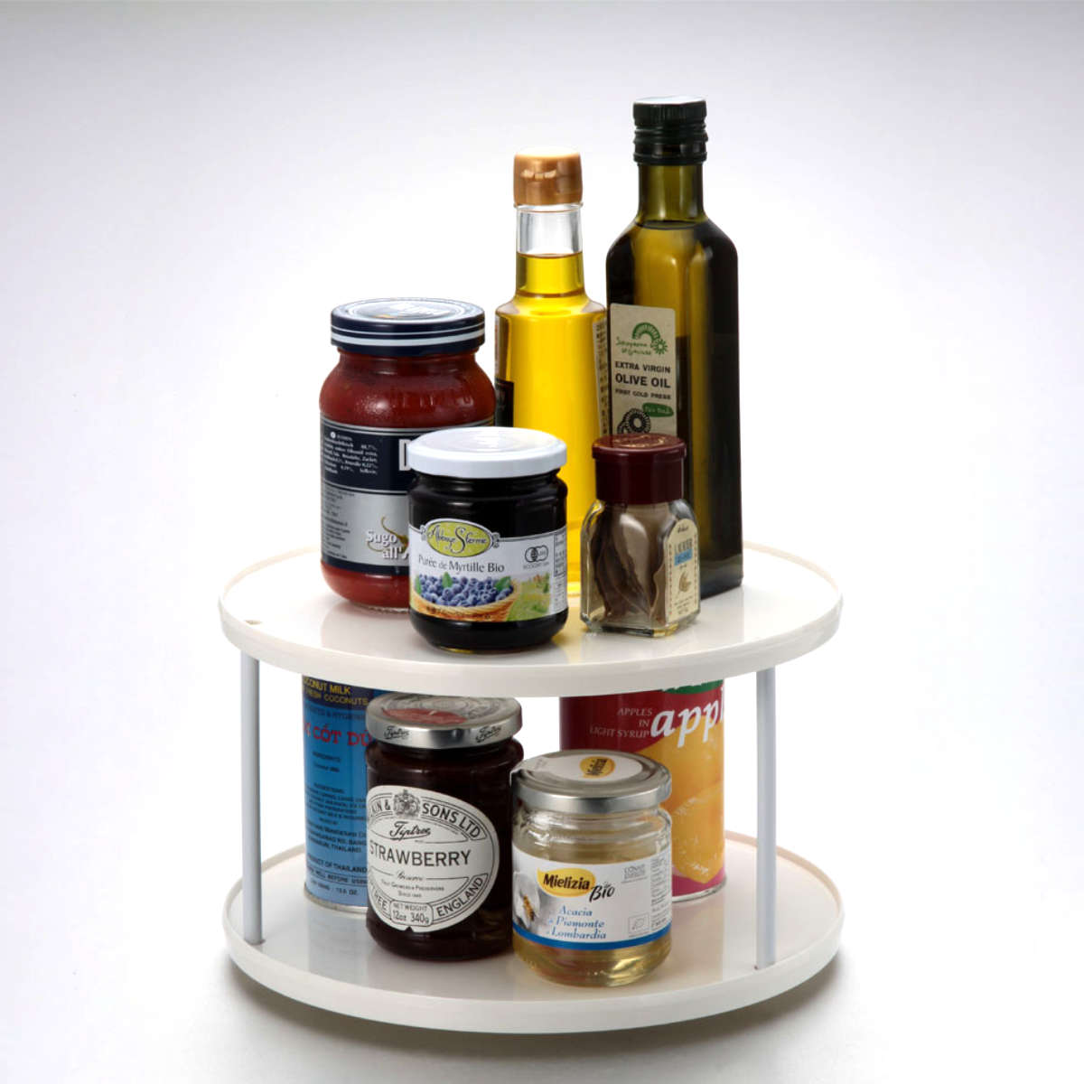 360度くるっと回せるので、戸棚や冷蔵庫の奥に置いた調味料や小物もスムーズに取り出せます。二段構造で収納力もしっかり確保でき、上段約2kg・下段約4kgまで載せられるため、調味料やボトル類をまとめて整理できます。