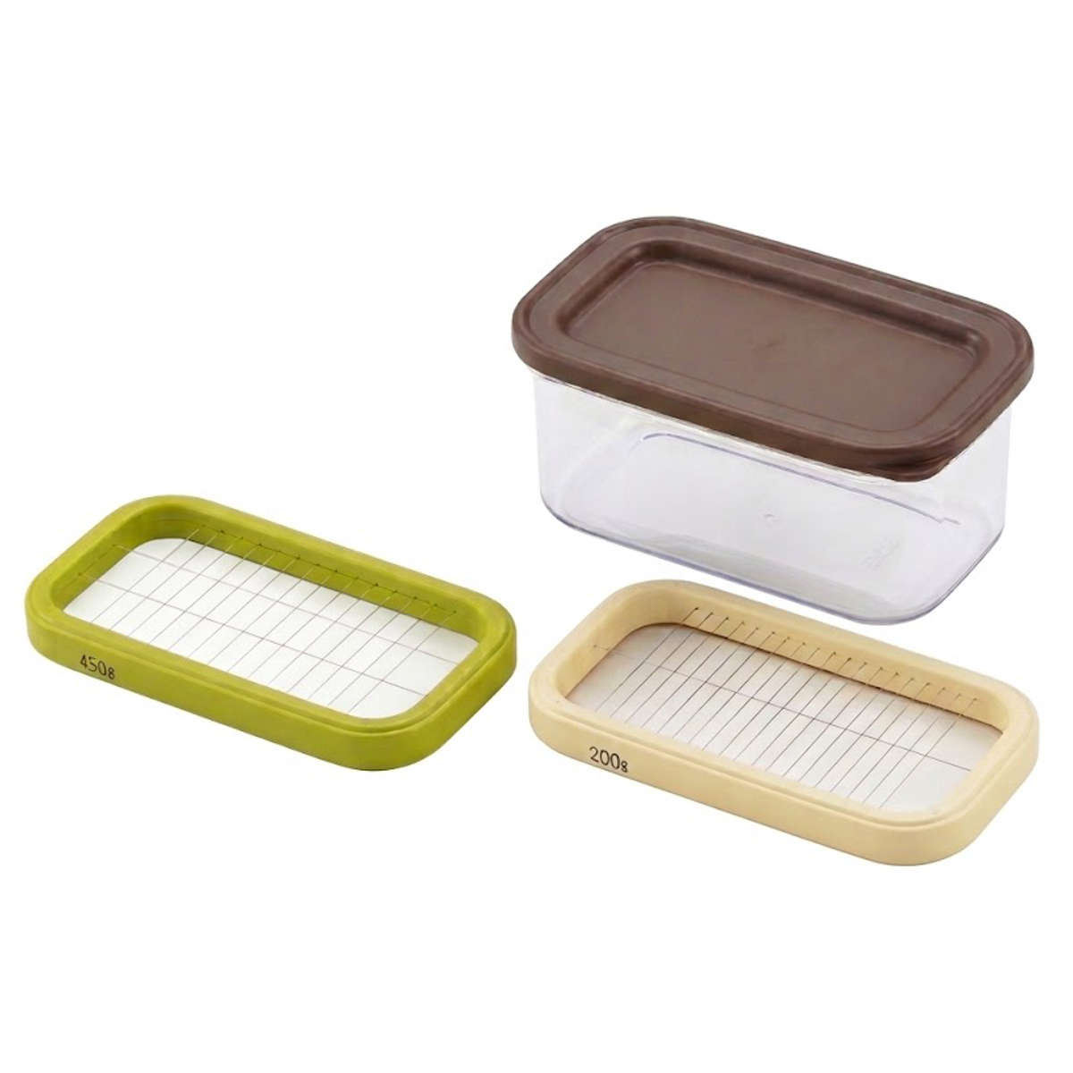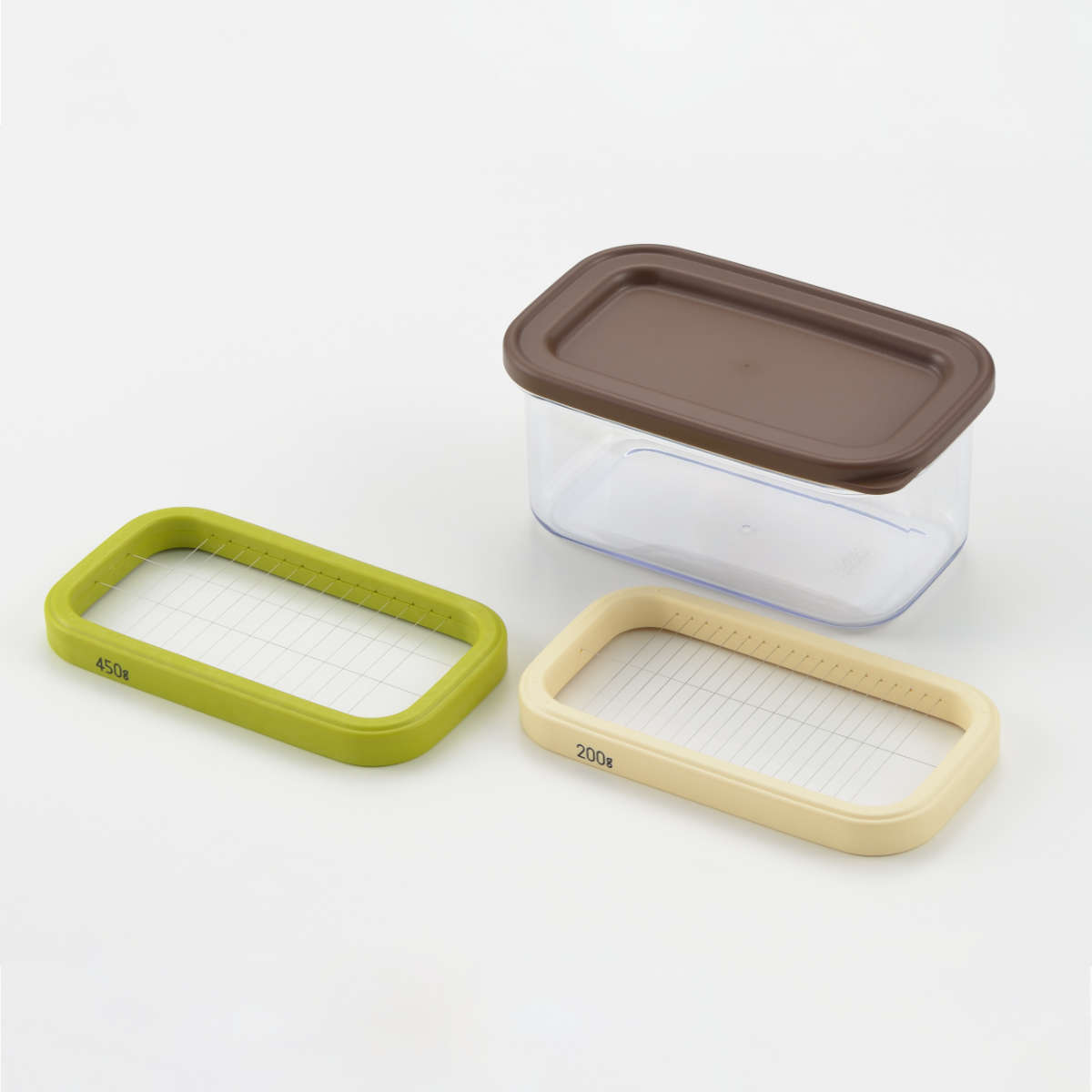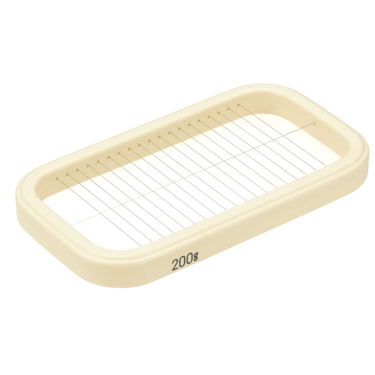 | 備考 | 【カット後の1切れの重さ・サイズ】 バター150gの場合(緑色のワイヤープレート使用):約 3.3g・分割個数45ピース バター150gの場合(黄色のワイヤープレート使用):約 3.7g・分割個数40ピース バター200gの場合(黄色のワイヤープレート使用):約 5g・分割個数40ピース バター450gの場合(緑色のワイヤープレート使用):約 10g・分割個数45ピース ※バターを置く位置により明記した重さと異なることがあります ※200g・150gの場合はカット後のバターが容器内に落ち整えてからご使用ください |