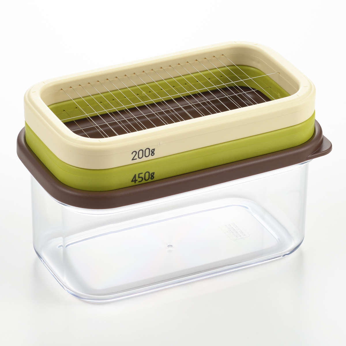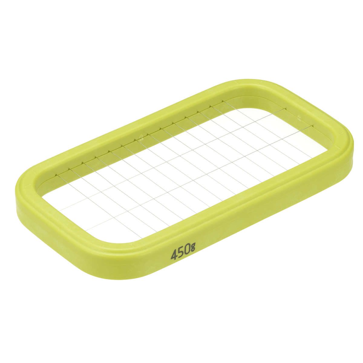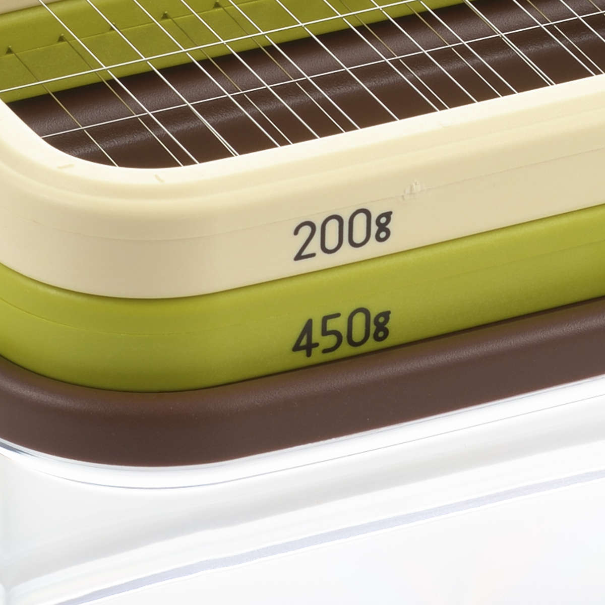 | 備考 | 【カット後の1切れの重さ・サイズ】 バター150gの場合(緑色のワイヤープレート使用):約 3.3g・分割個数45ピース バター150gの場合(黄色のワイヤープレート使用):約 3.7g・分割個数40ピース バター200gの場合(黄色のワイヤープレート使用):約 5g・分割個数40ピース バター450gの場合(緑色のワイヤープレート使用):約 10g・分割個数45ピース ※バターを置く位置により明記した重さと異なることがあります ※200g・150gの場合はカット後のバターが容器内に落ち整えてからご使用ください |