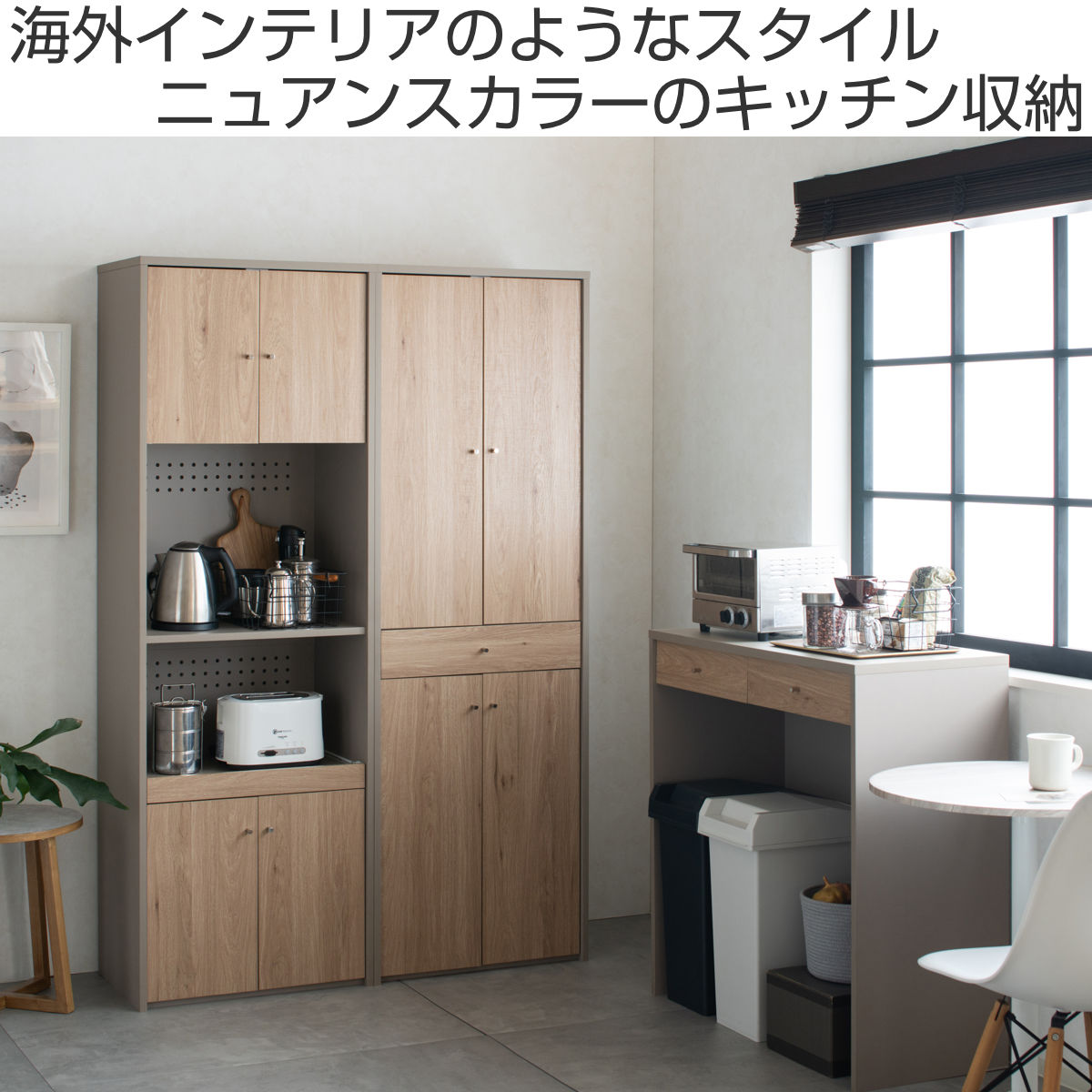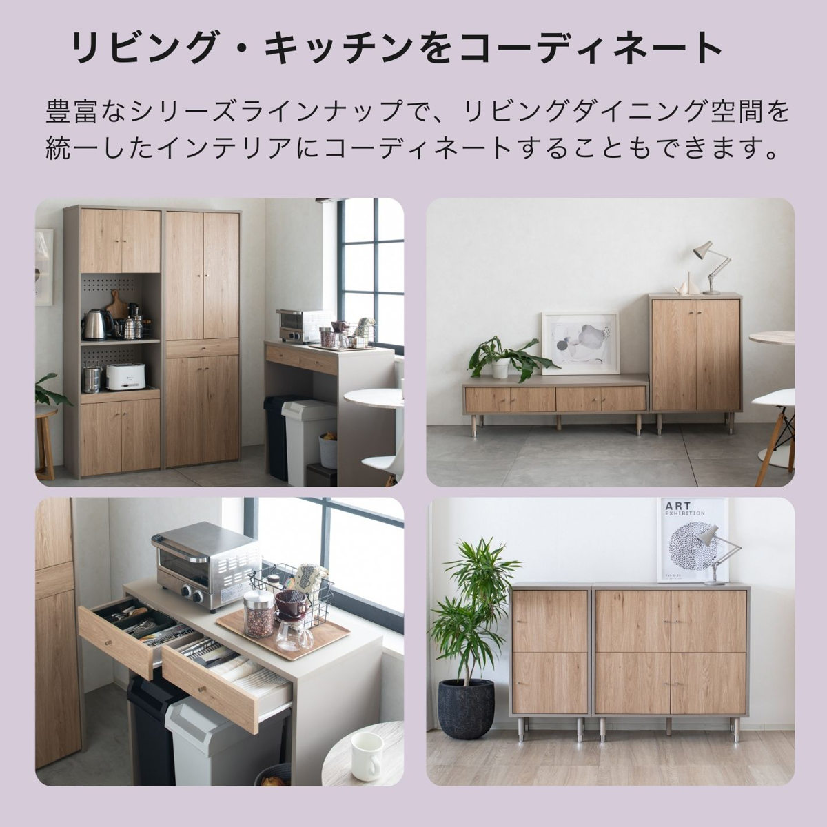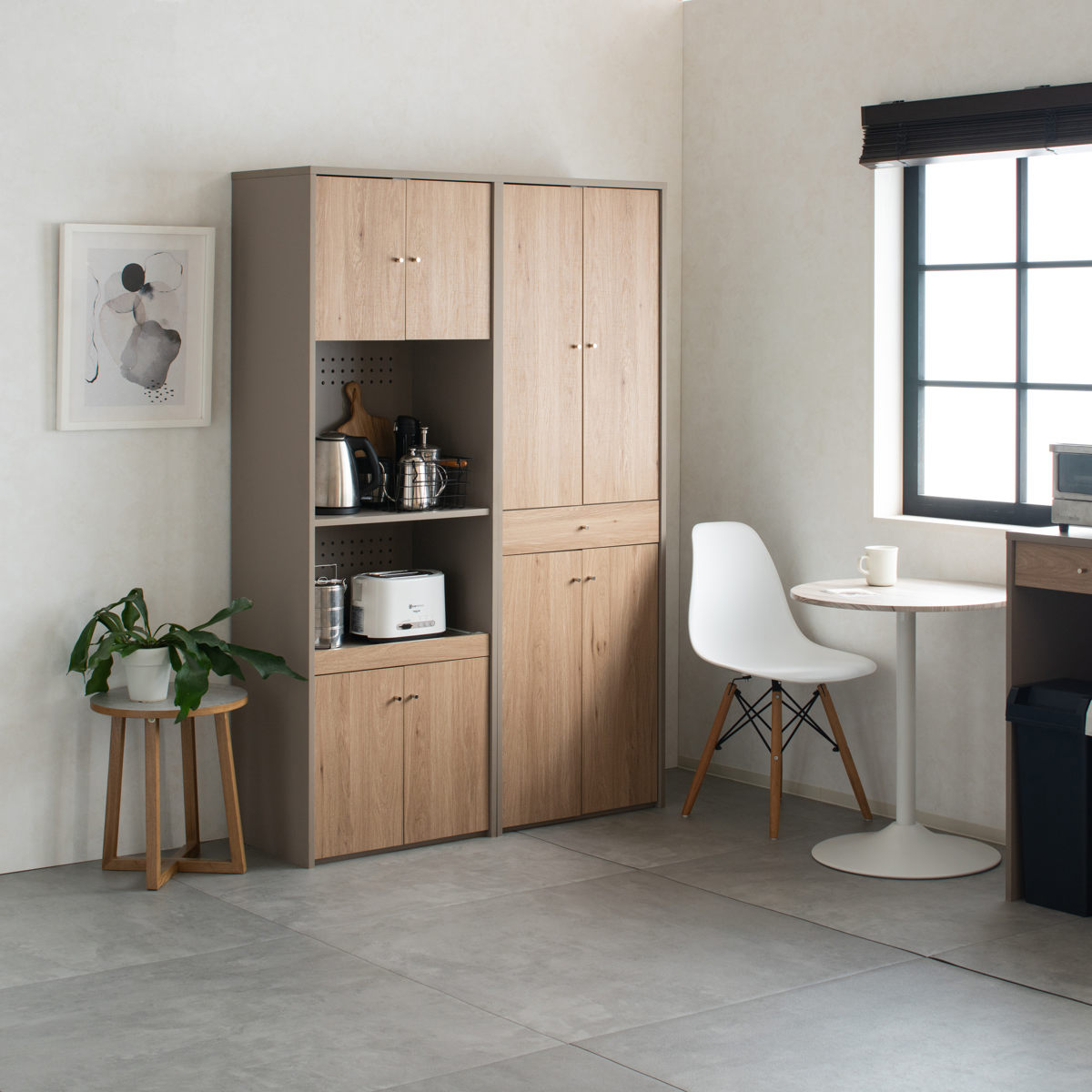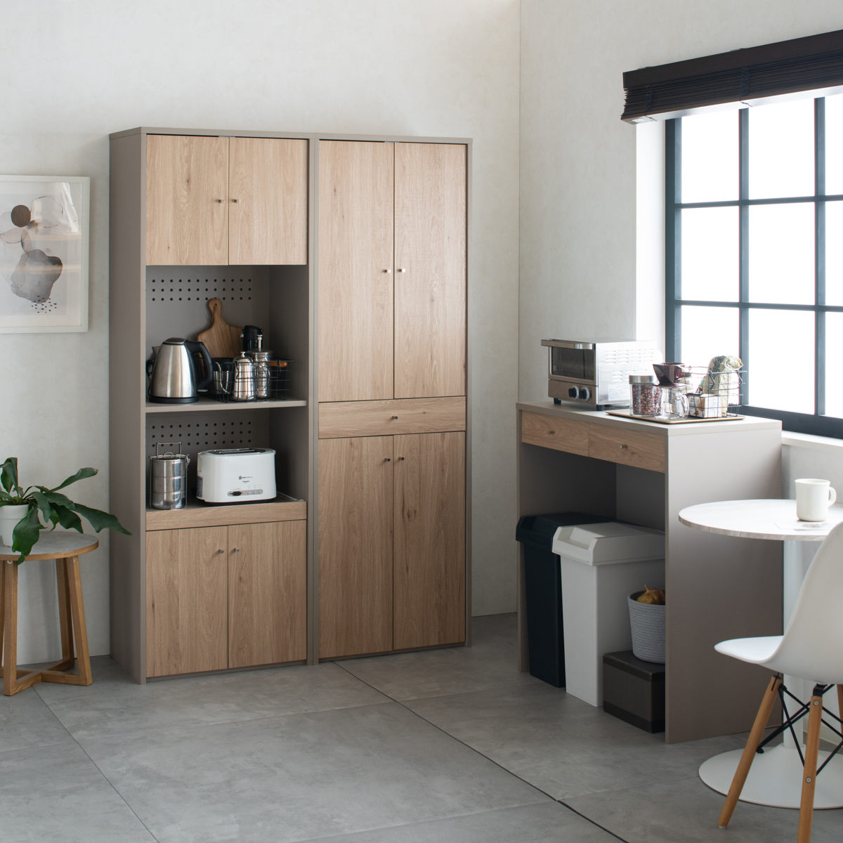 あたたかみのあるグレー色とナチュラルな木目柄を組み合わせた食器棚です。海外インテリアのような雰囲気が楽しめて、ナチュラルな空間でもモダンな空間にも馴染みます。