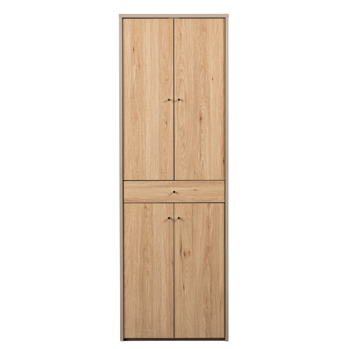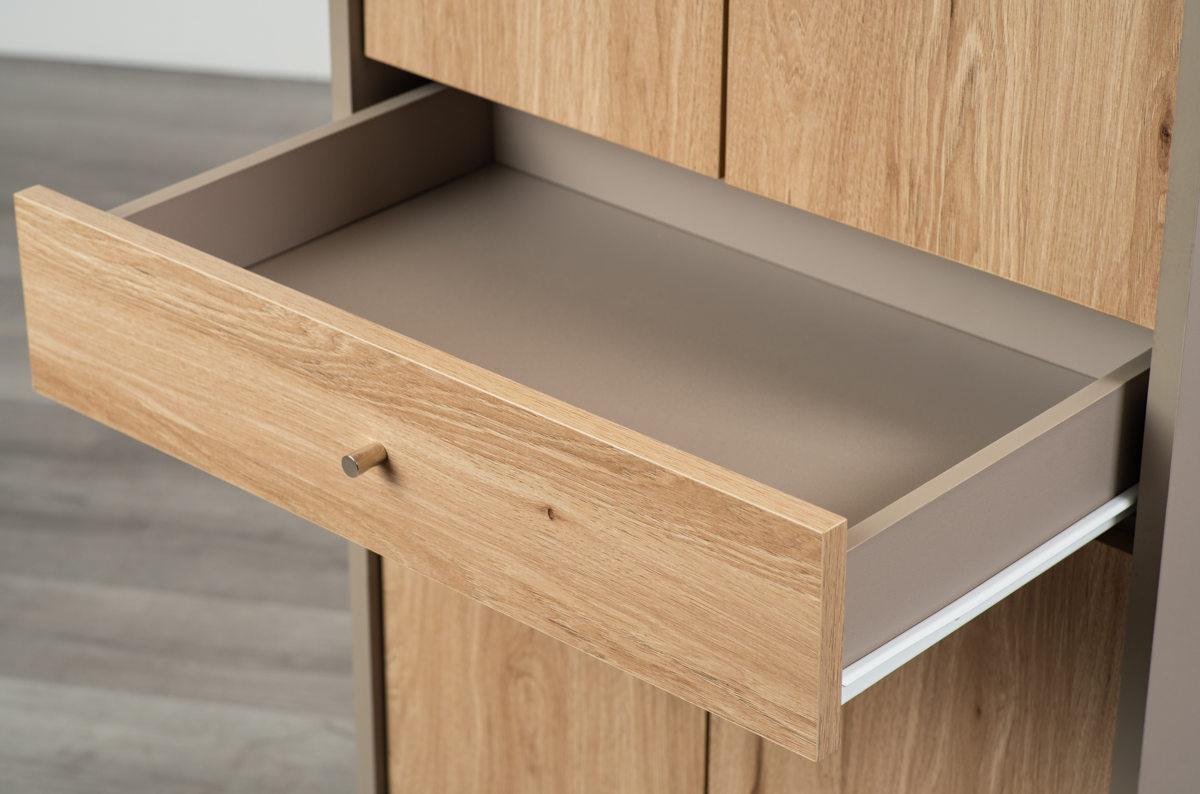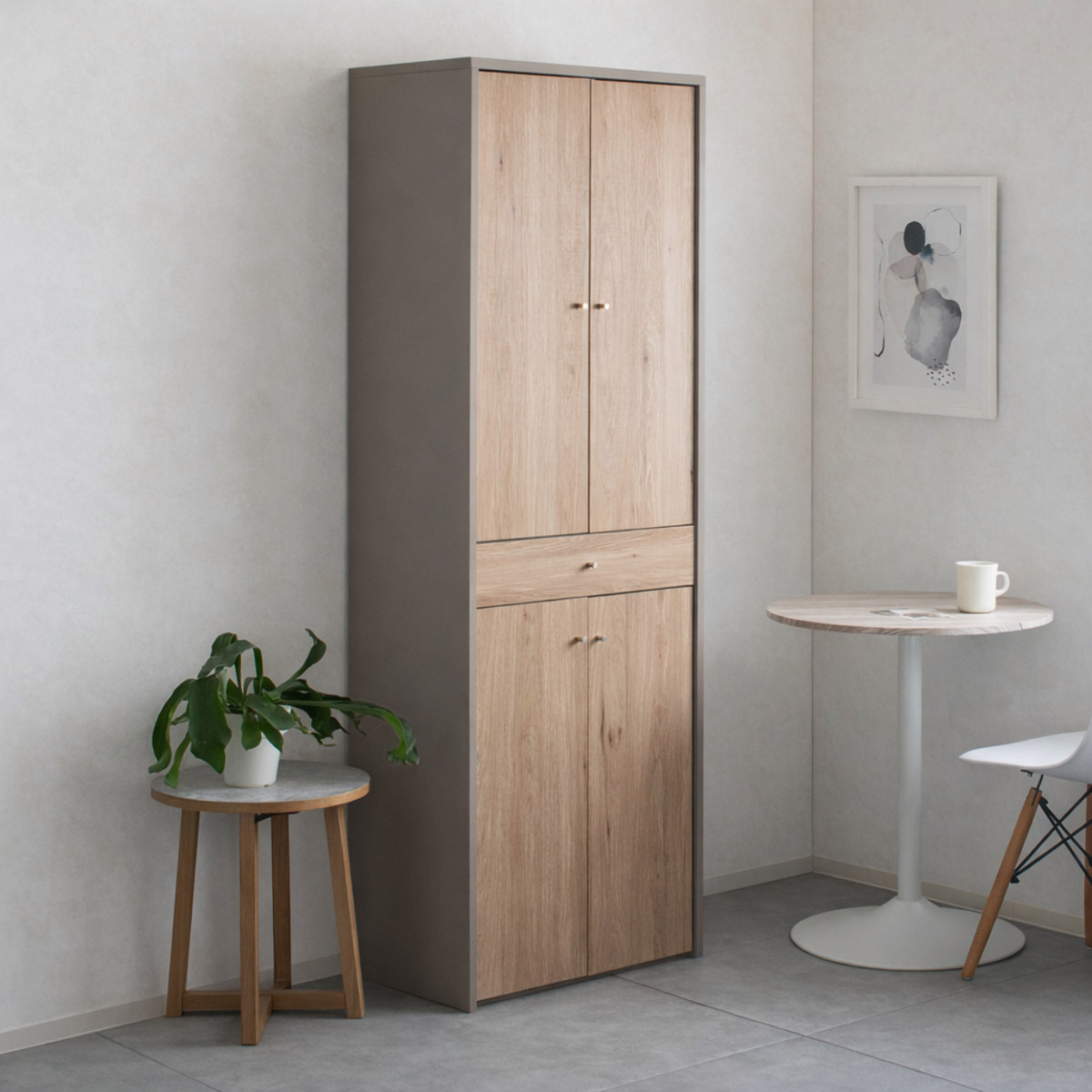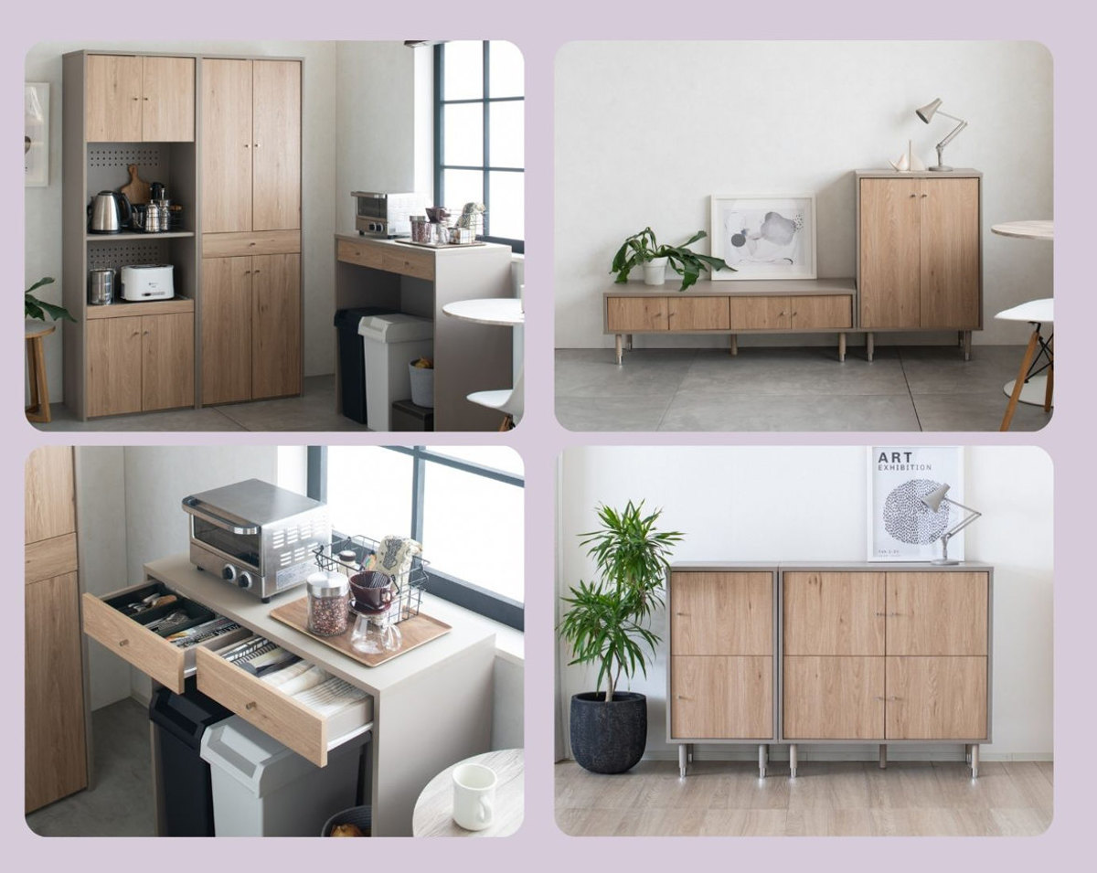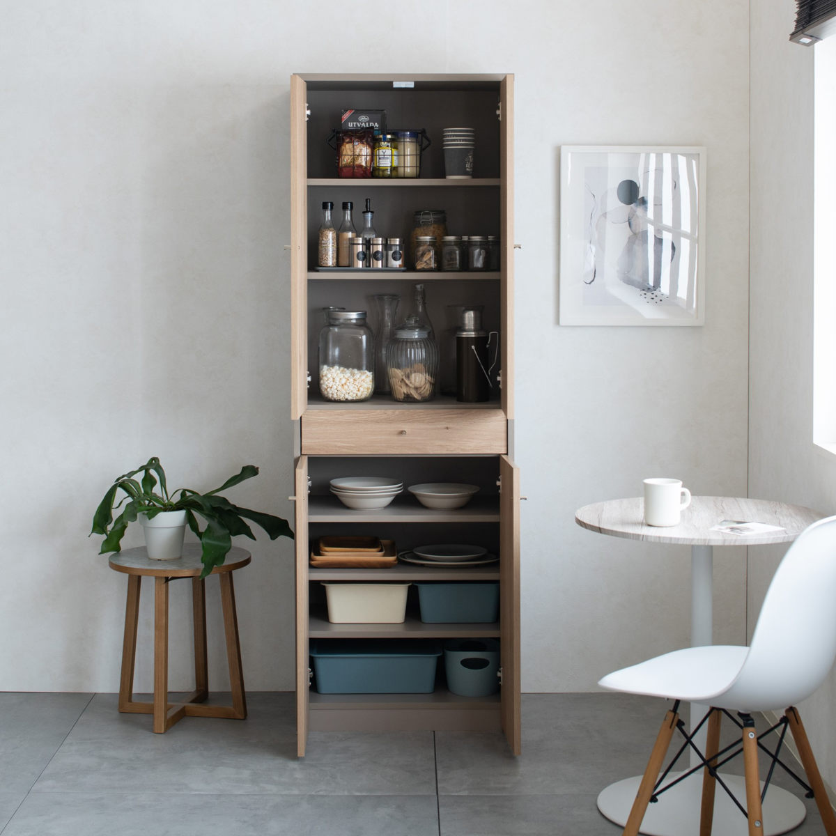 あたたかみのあるグレー色とナチュラルな木目柄を組み合わせた食器棚です。海外インテリアのような雰囲気が楽しめて、ナチュラルな空間でもモダンな空間にも馴染みます。