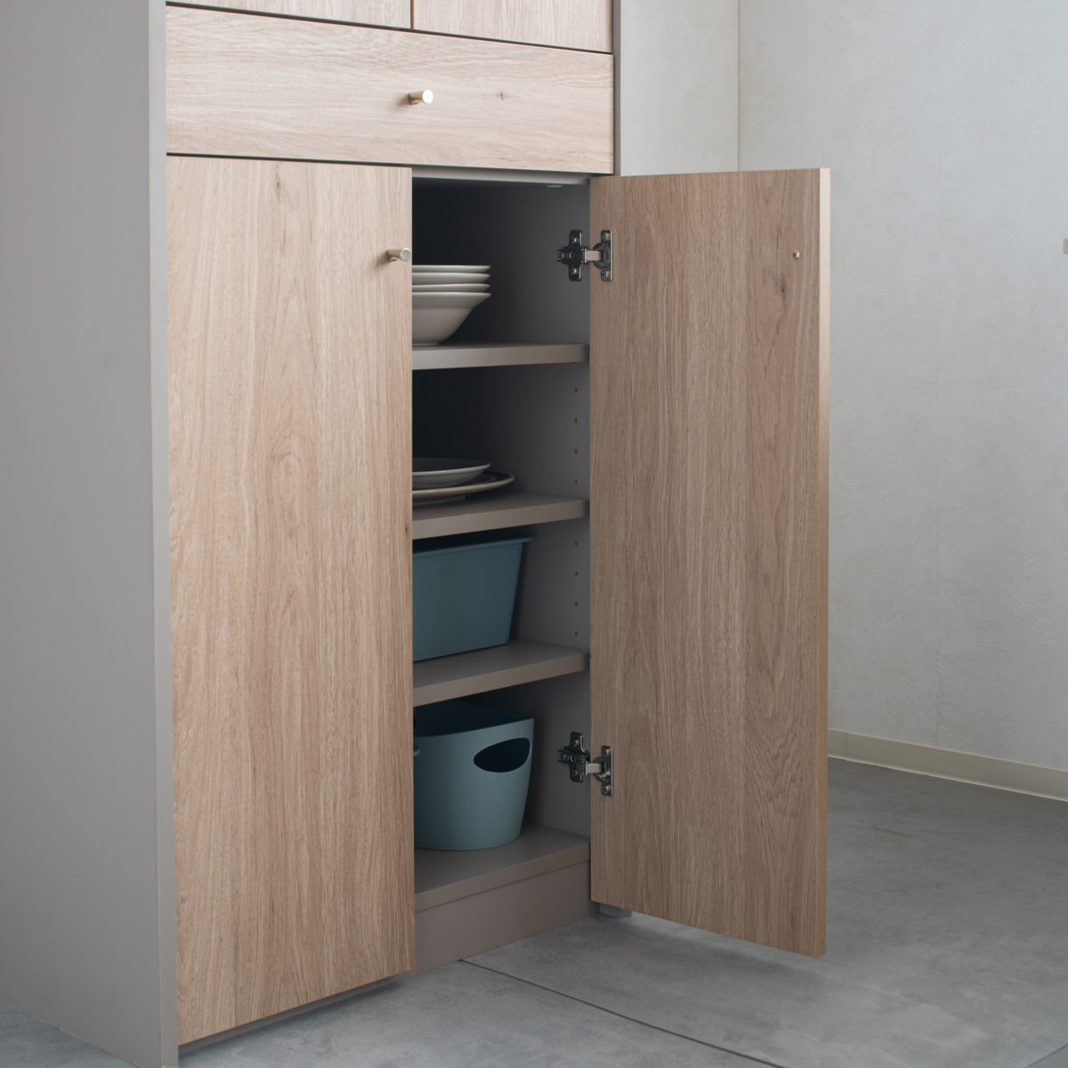 調味料や食材のストック、食器をひとまとめに収納できます。隠す収納でキッチンをすっきり見せてくれます。