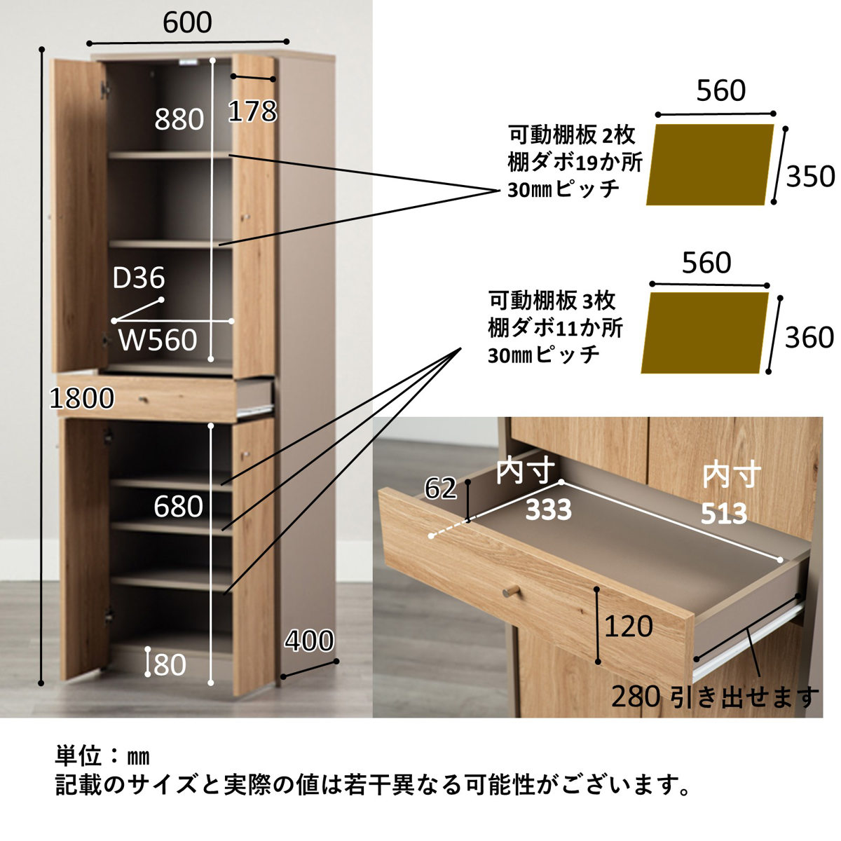 カトラリーやキッチンマットなどのキッチン小物の収納に便利な引出し付きです。簡易レール付きなので開け閉めもスムーズです。