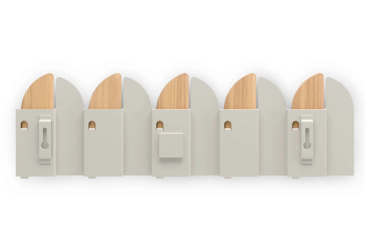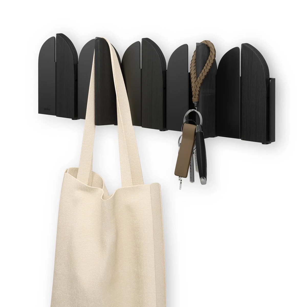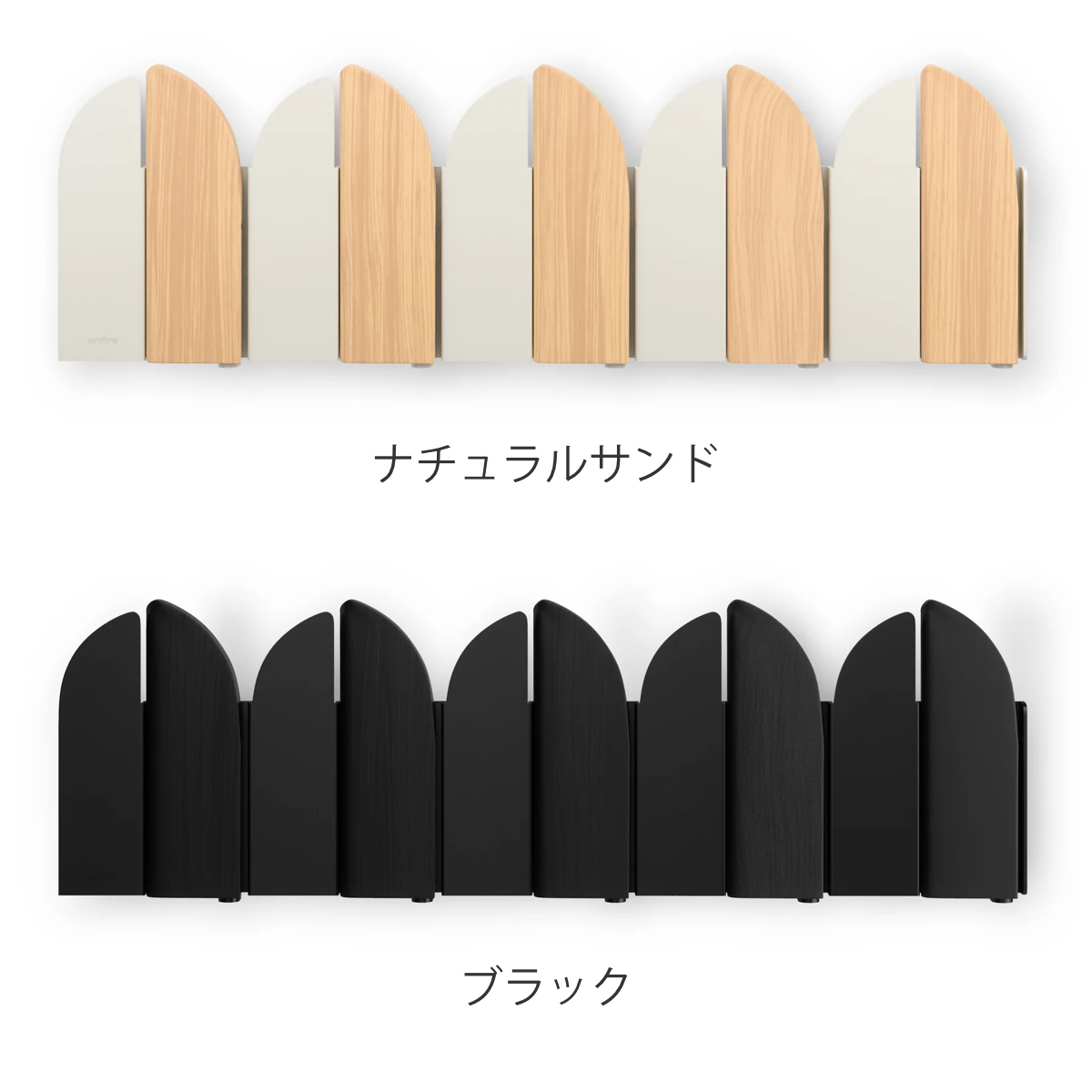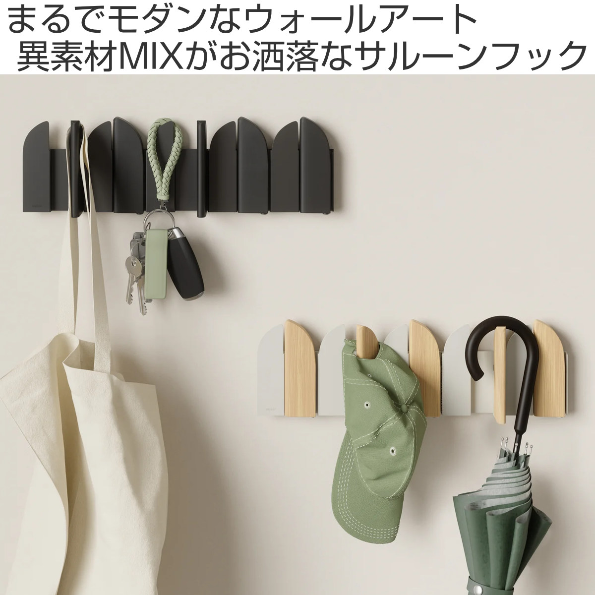 酒場のスイングドアがイメージされたフックは、角度によって見え方が変わる動きのあるデザインが魅力です。ウッドと金属の組合せが映えるナチュラルサンド、スタイリッシュなブラック。玄関やリビング、寝室など設置場所を選ばずスッキリ馴染みます。