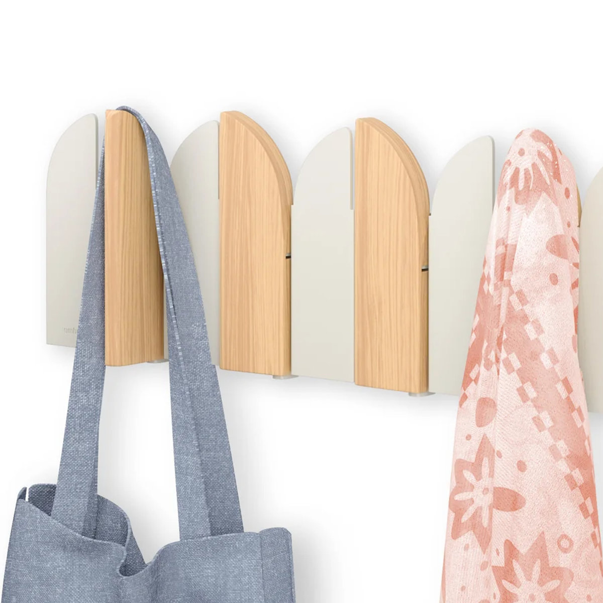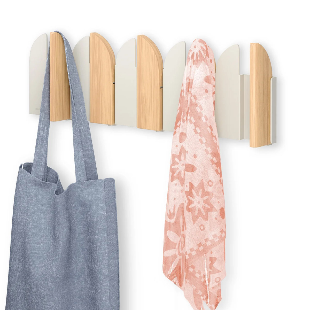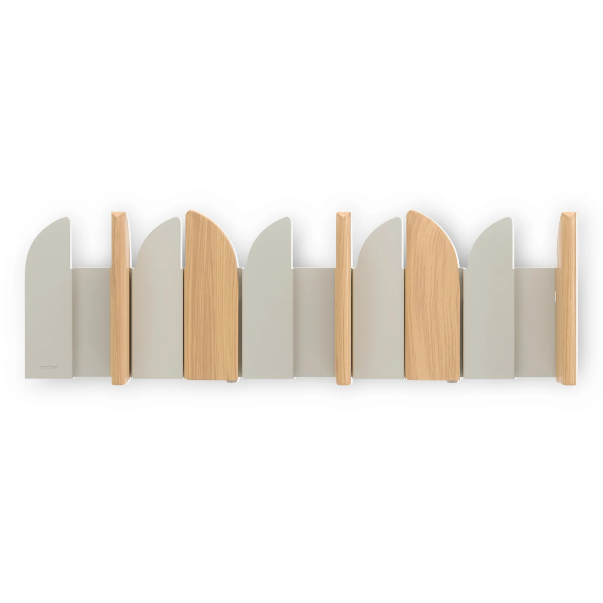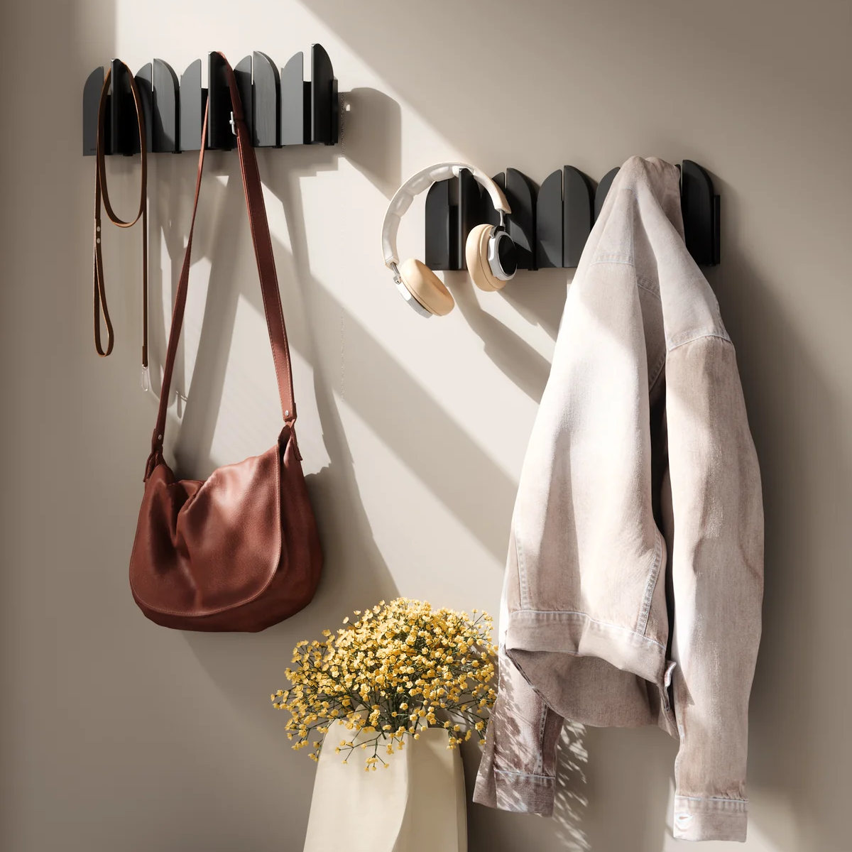 酒場のスイングドアがイメージされたフックは、角度によって見え方が変わる動きのあるデザインが魅力です。ウッドと金属の組合せが映えるナチュラルサンド、スタイリッシュなブラック。玄関やリビング、寝室など設置場所を選ばずスッキリ馴染みます。