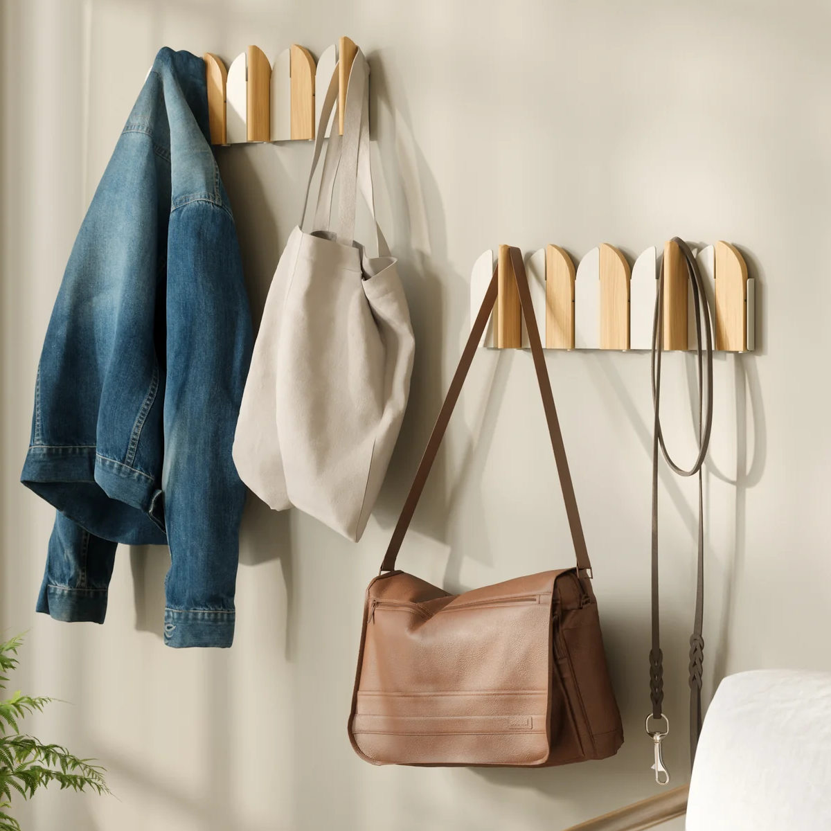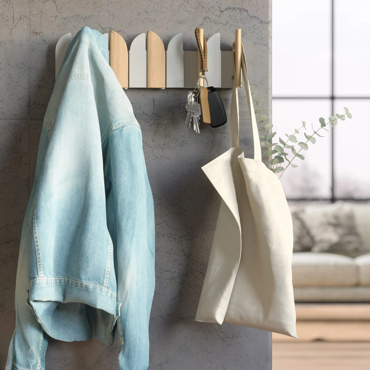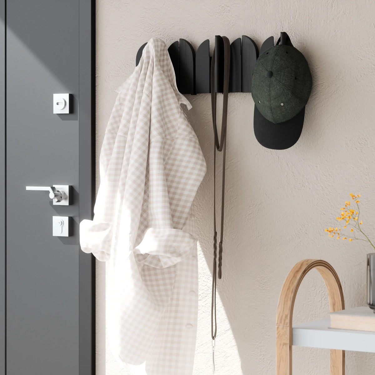 モダンなウォールアートを兼ね備えた実用的なコートラック