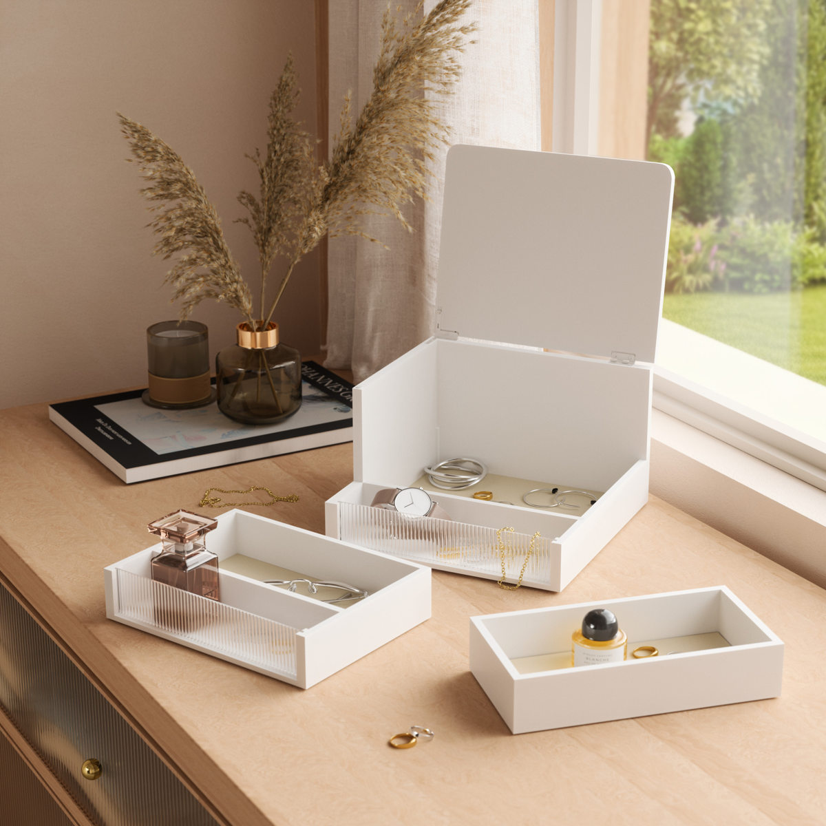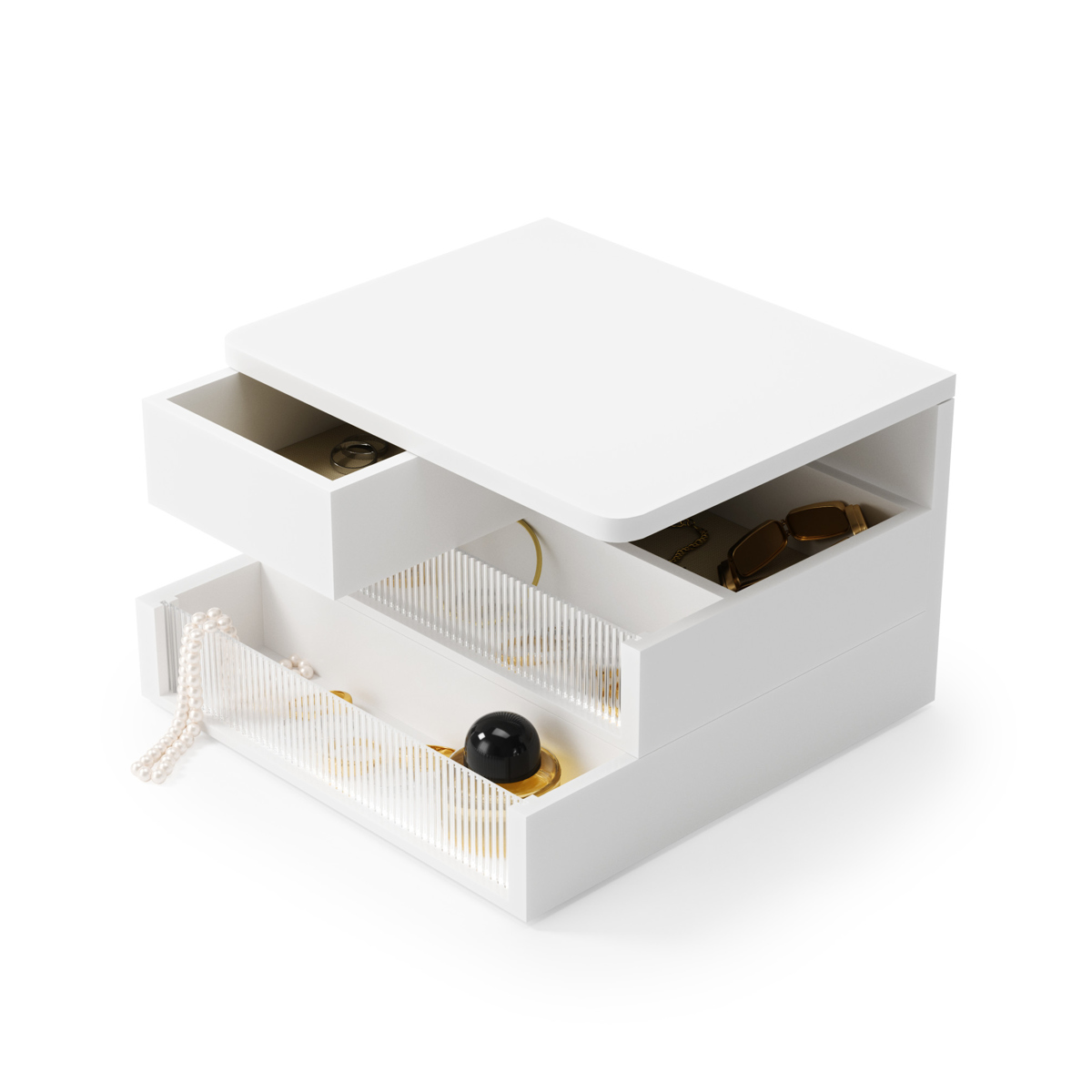 洗練されたデザインと機能性を兼ね備えた、モダンなジュエリーボックスです。大切なアクセサリーを美しく整理しながら、インテリアとしても映える一品です。