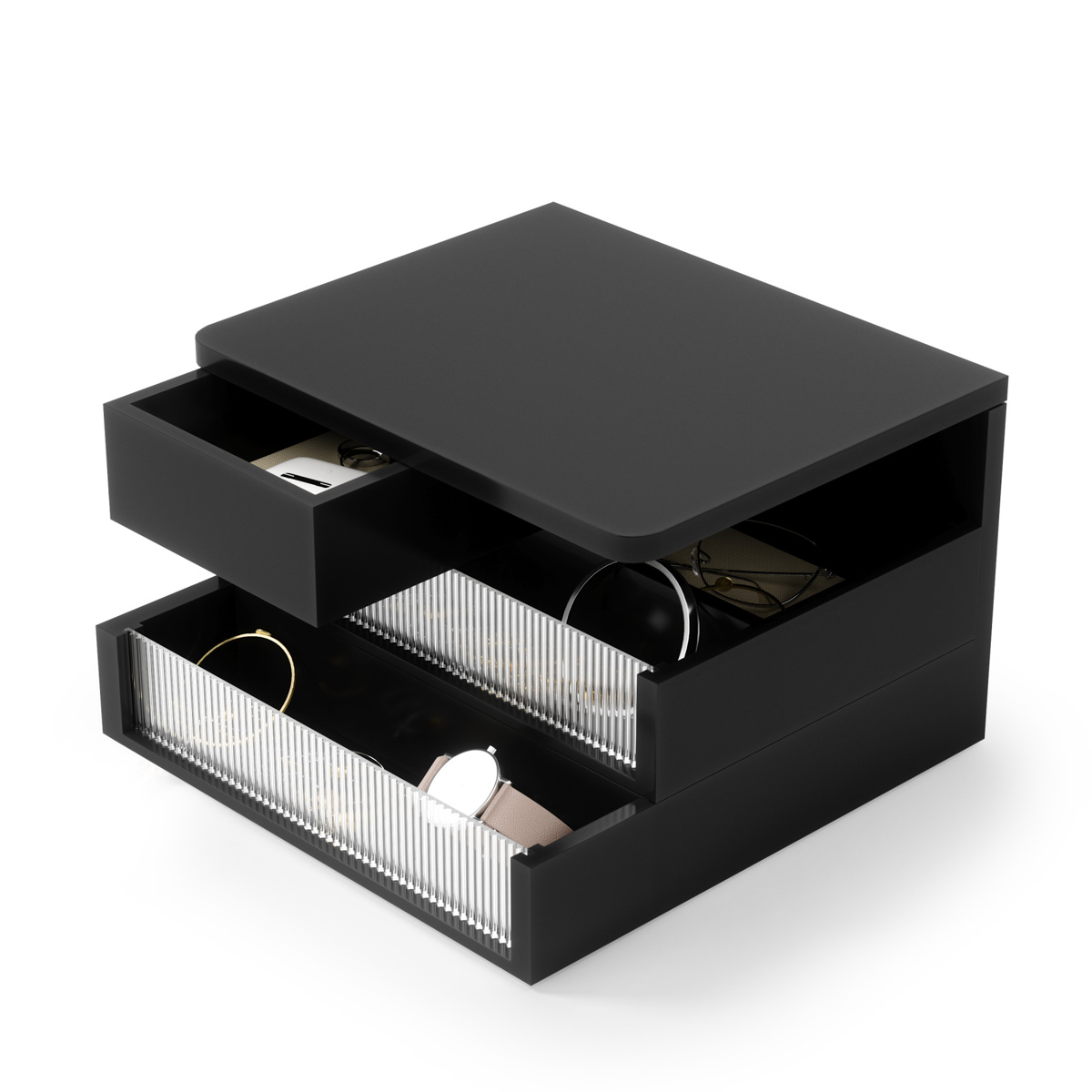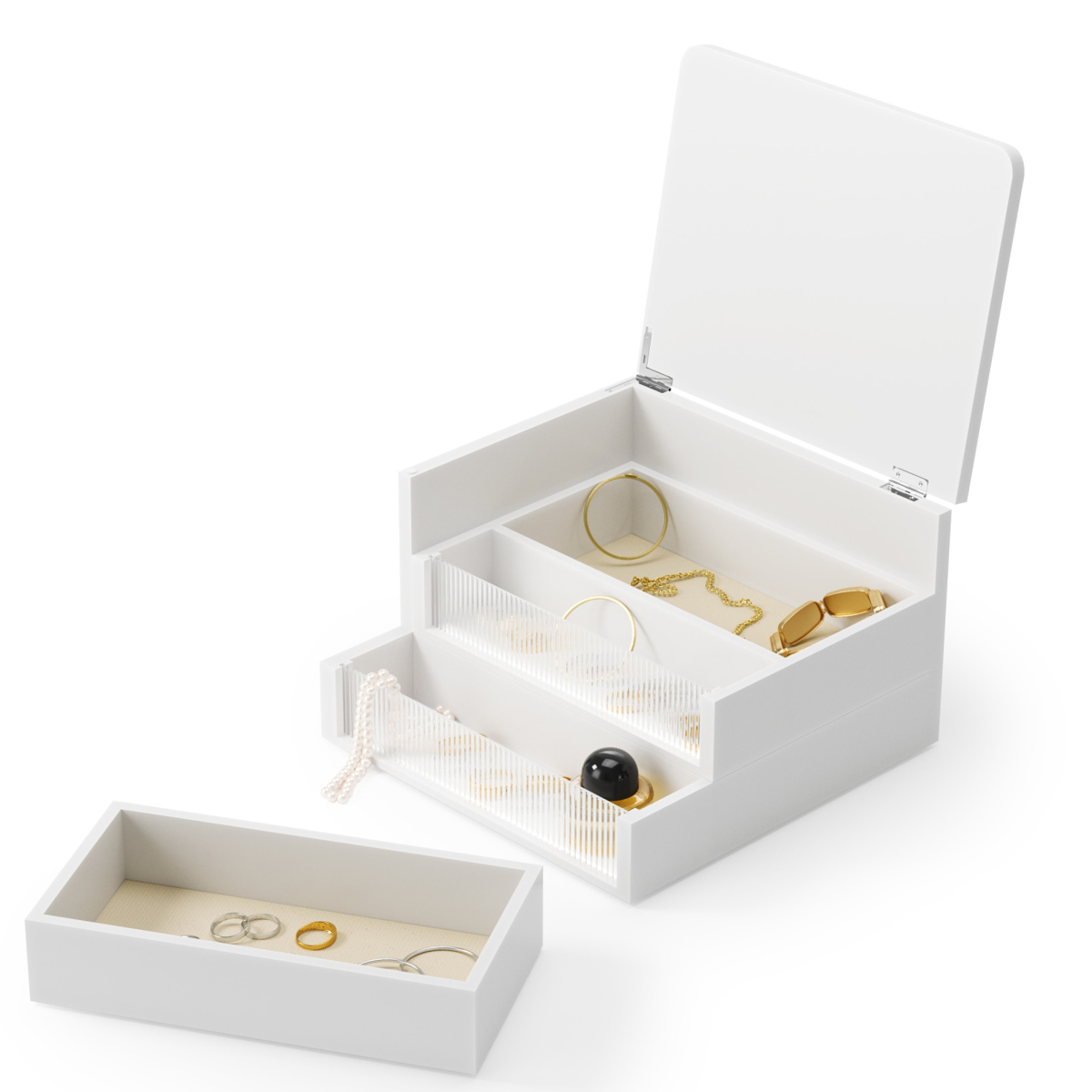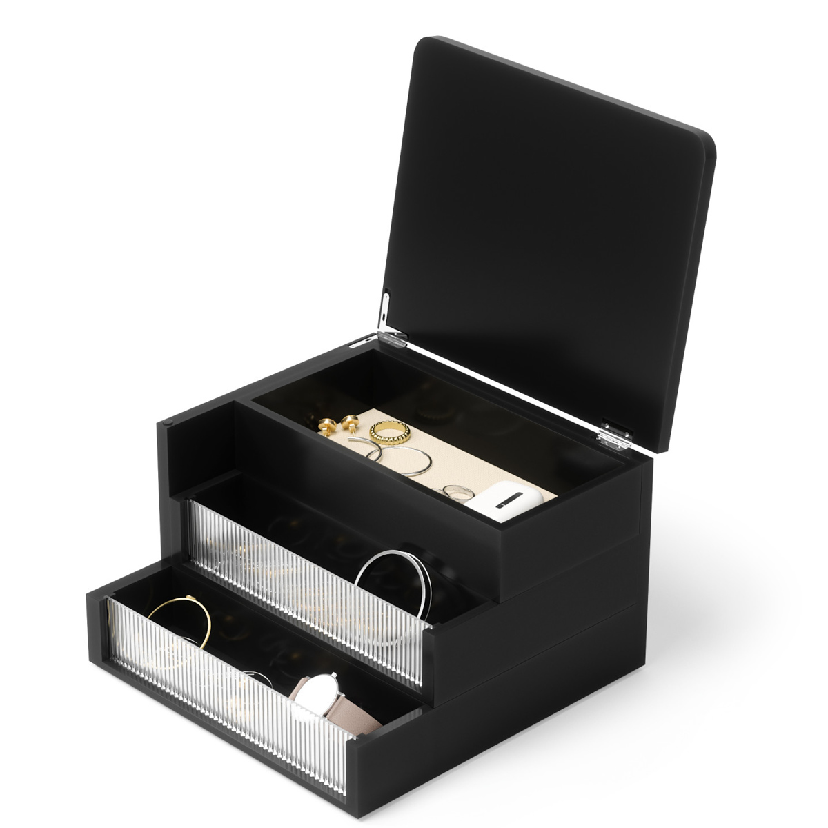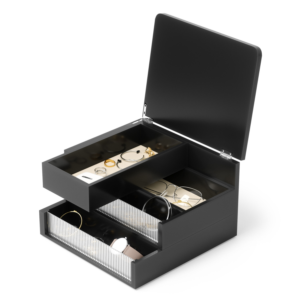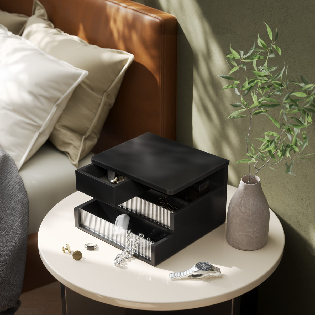 ボックスが3段重なる構造で、リング・ネックレス・腕時計などを分けて収納できます。絡まりや傷を防ぎながら、すっきり整理できます。