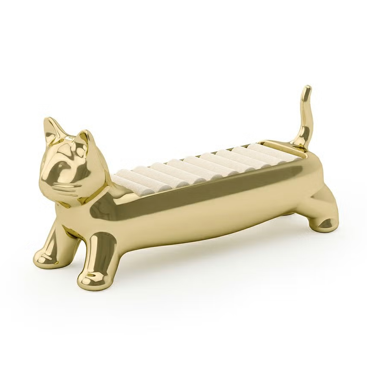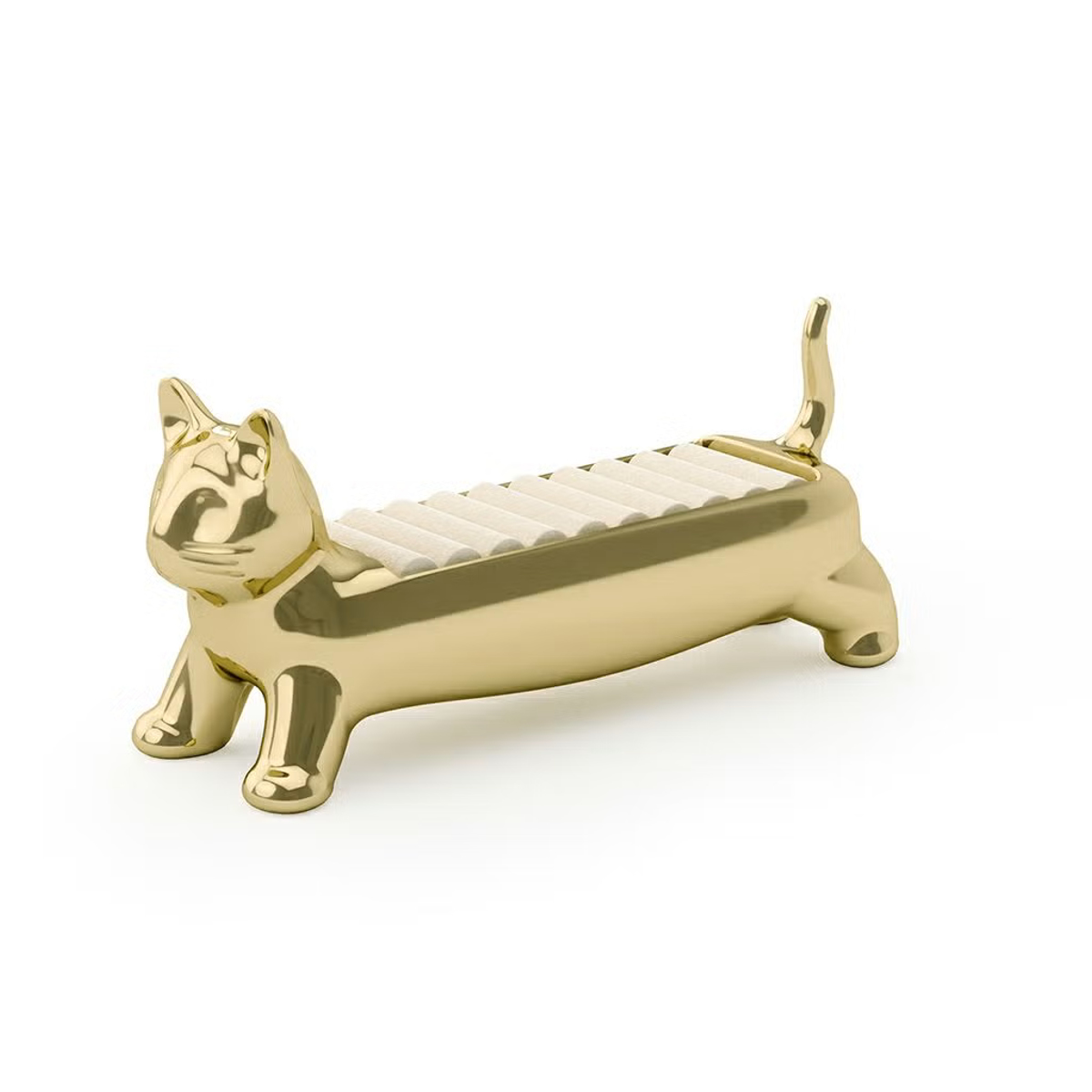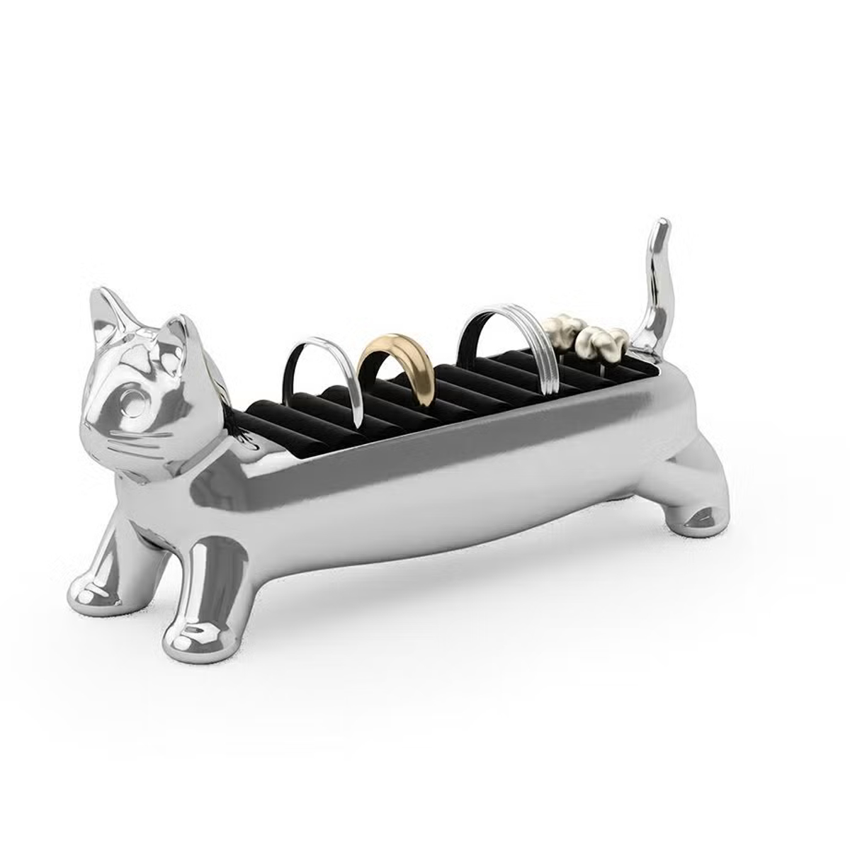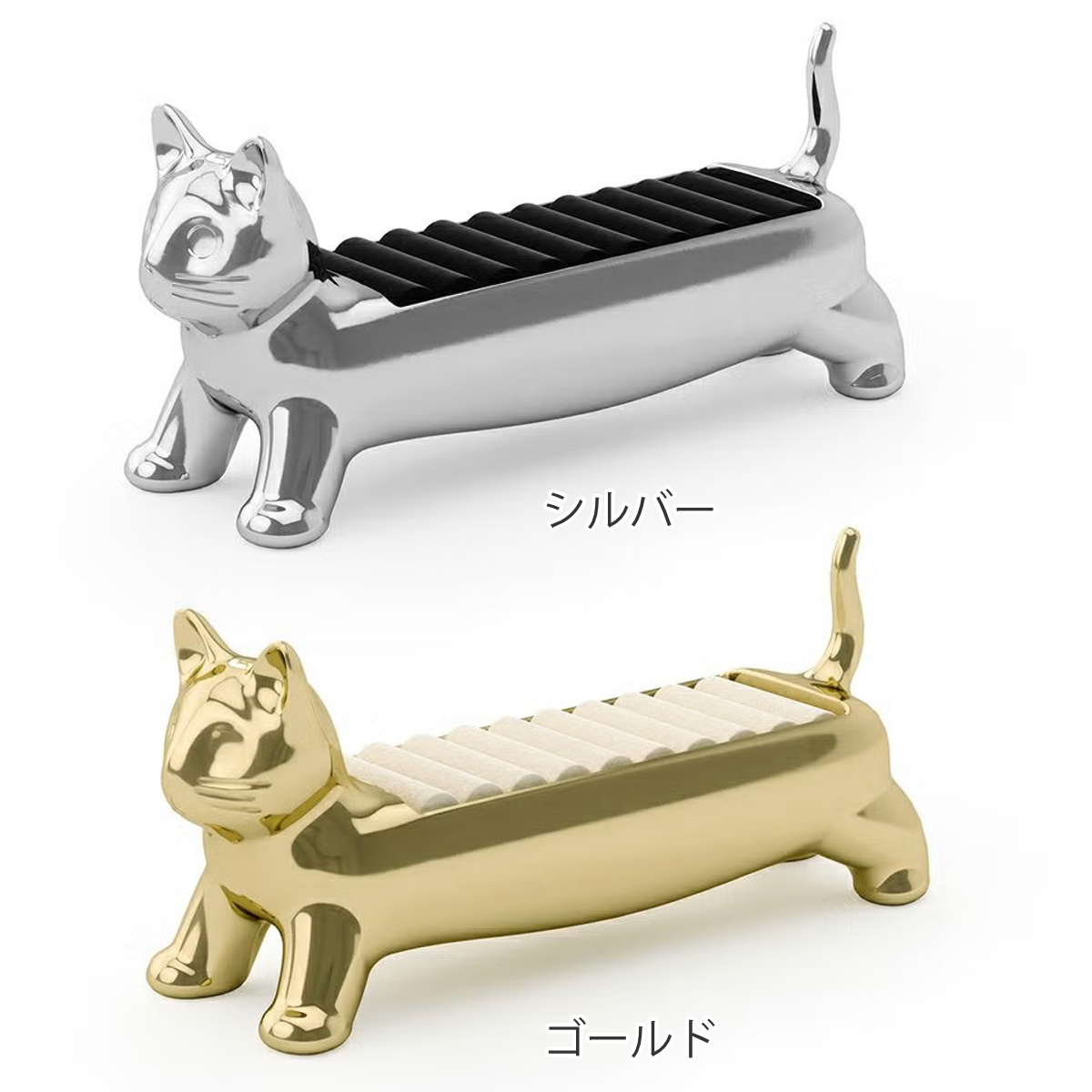 リングをまとめて収納できるリングホルダーです。マンチカン猫をモチーフにした愛らしいデザインで、置くだけで空間に遊び心とやさしい雰囲気をプラスします。