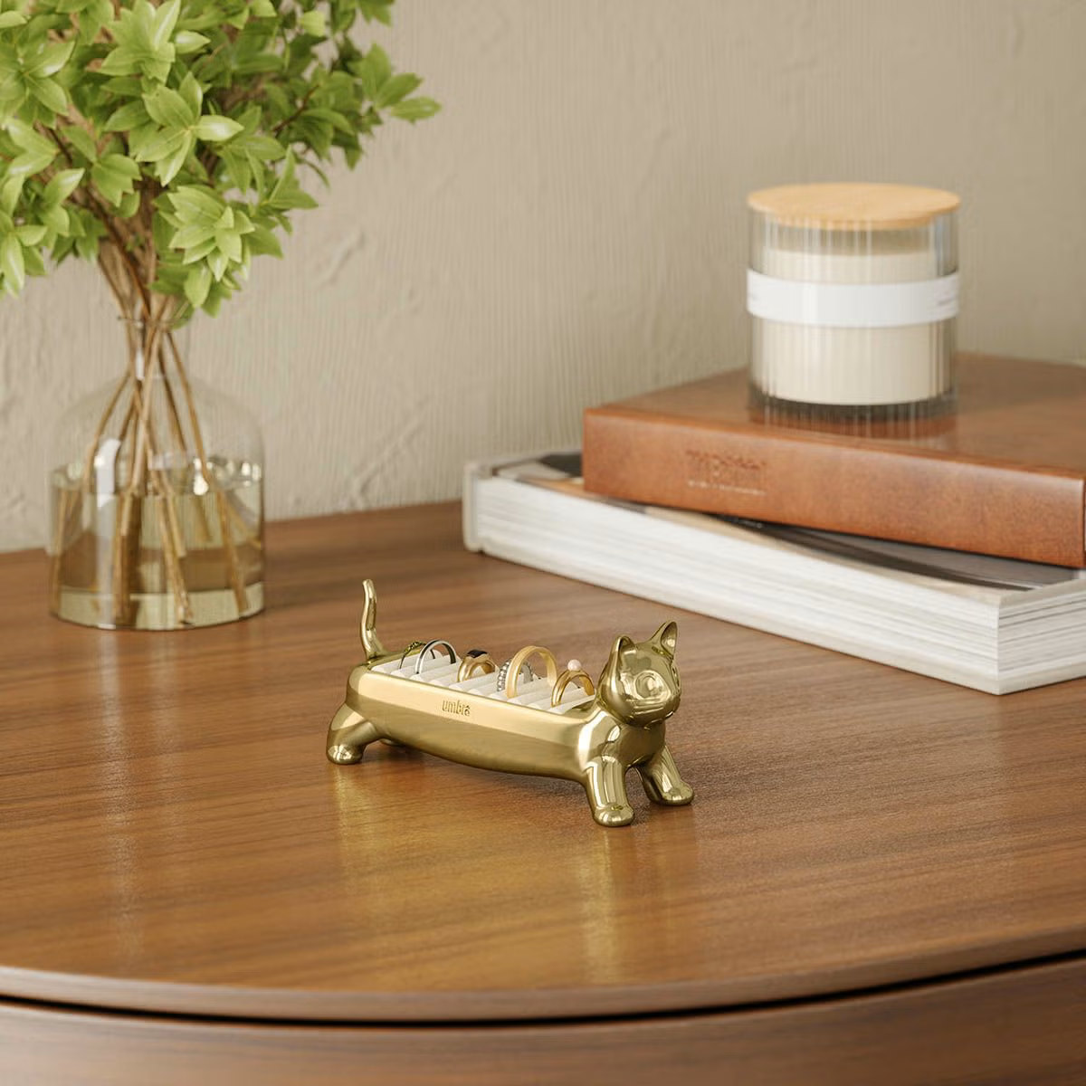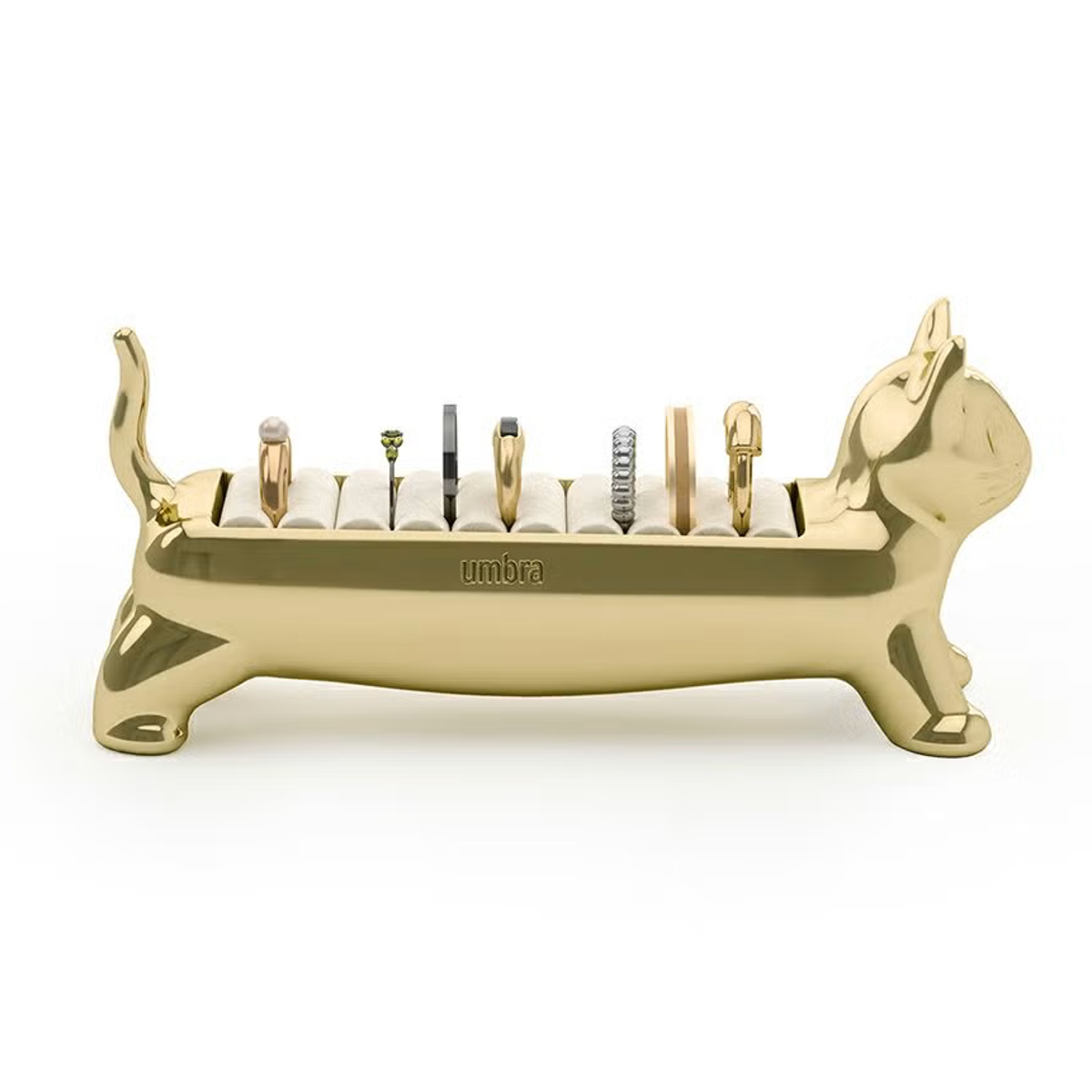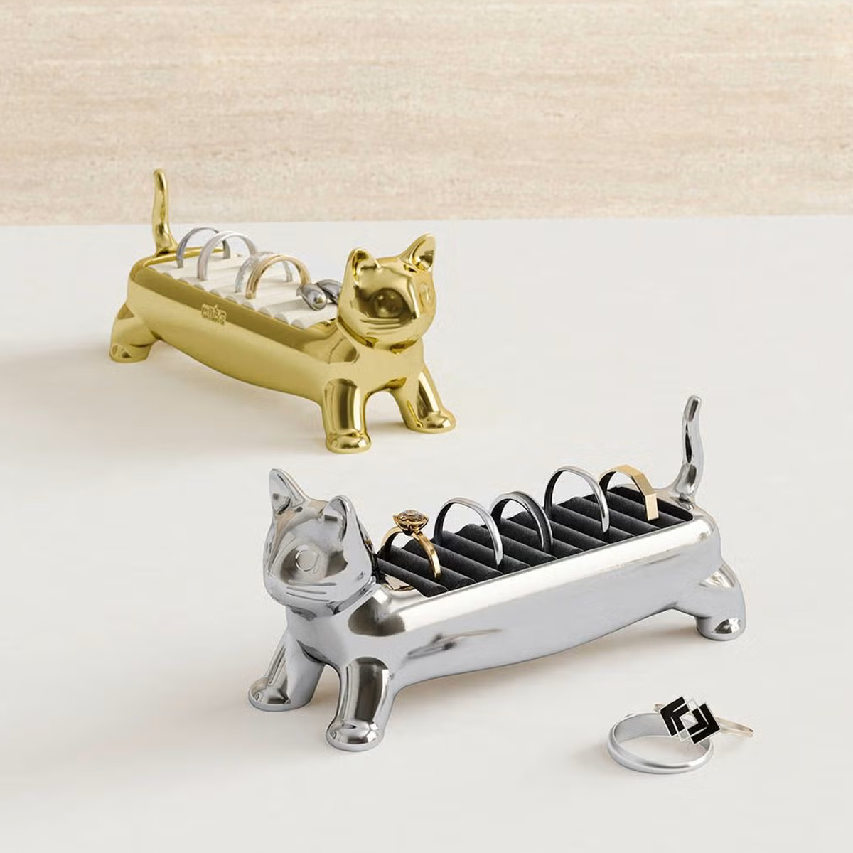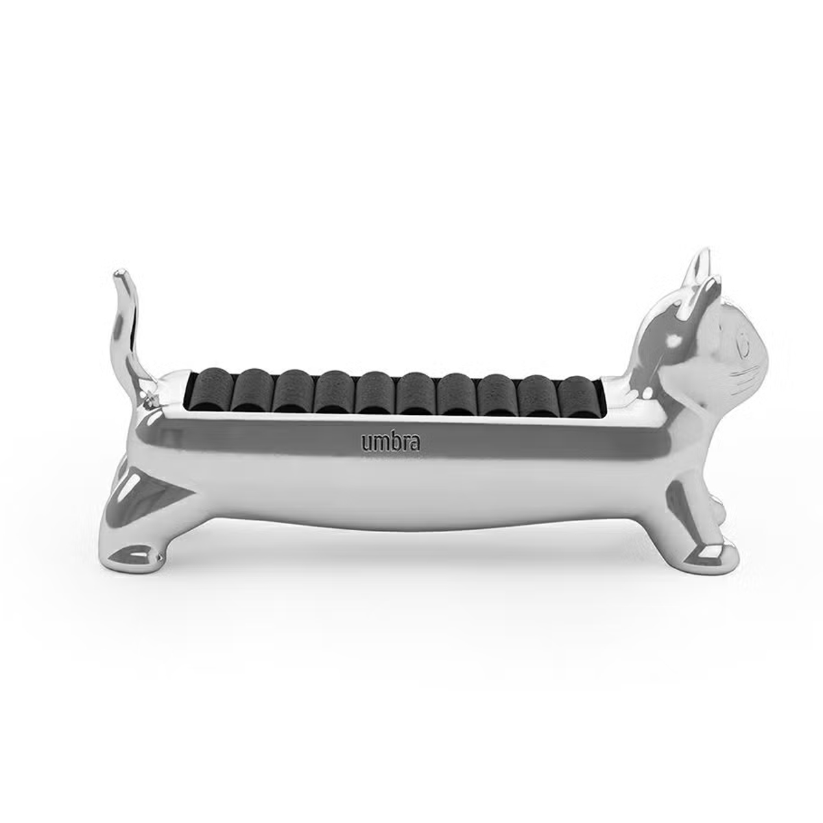 リングをまとめて収納できるリングホルダーです。マンチカン猫をモチーフにした愛らしいデザインで、置くだけで空間に遊び心とやさしい雰囲気をプラスします。