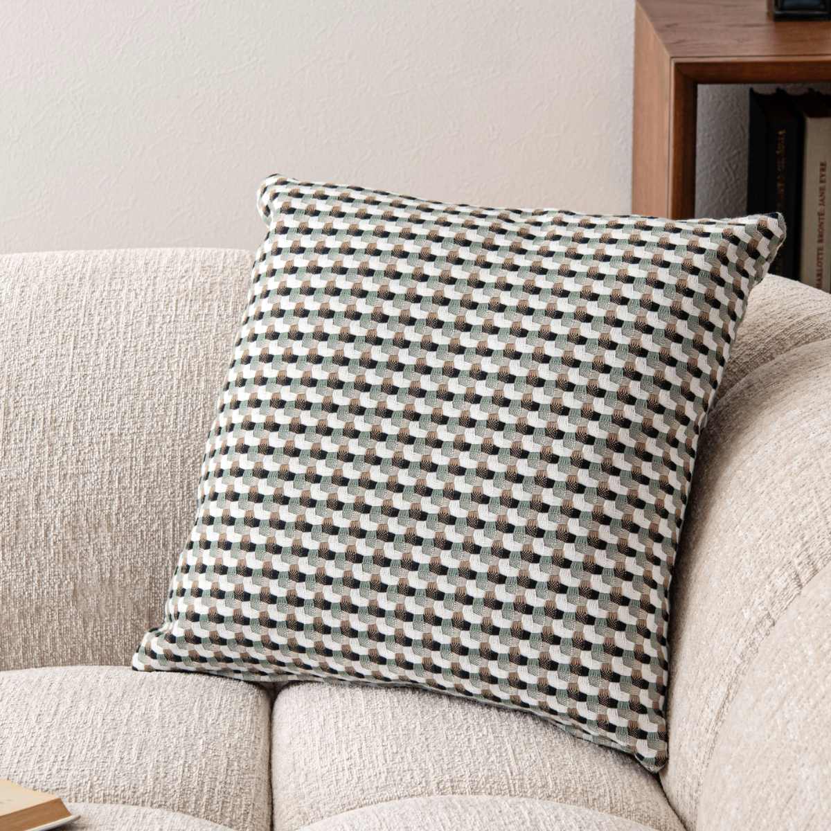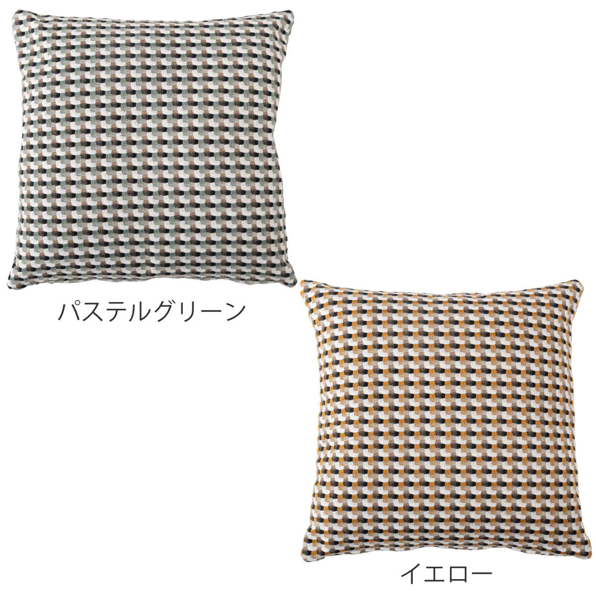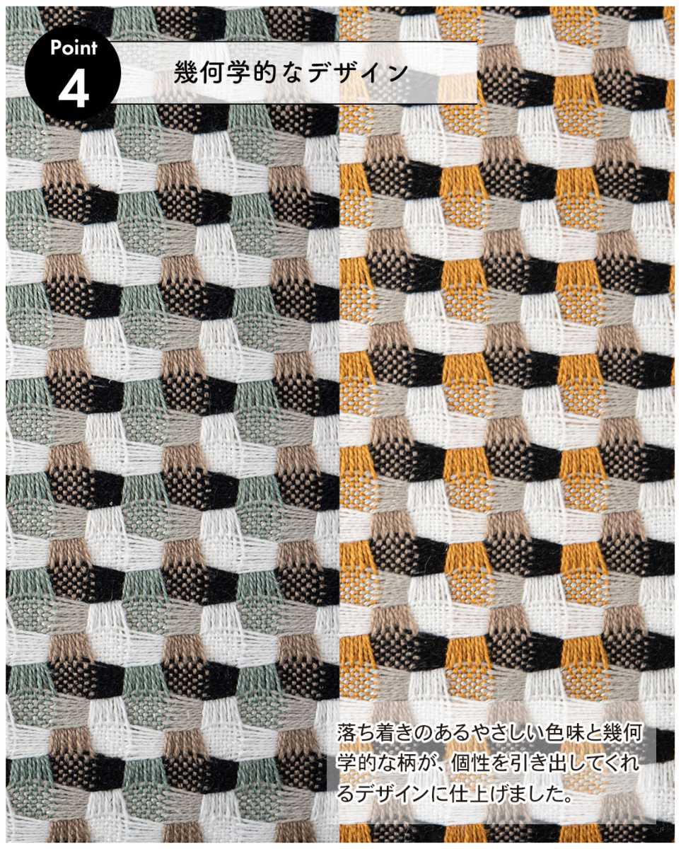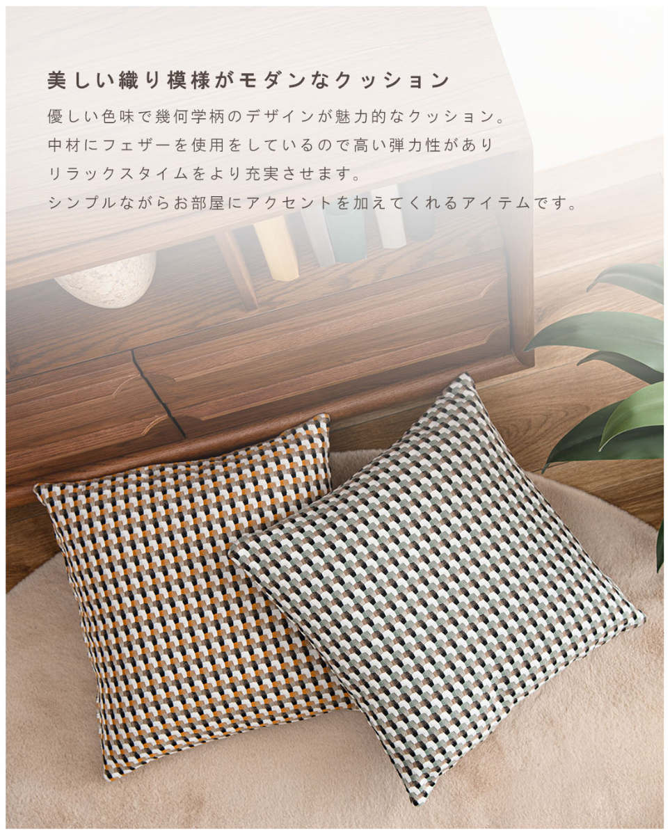 ●優しい色味と幾何学柄の織り模様が印象的な、モダンなデザインのクッションです。