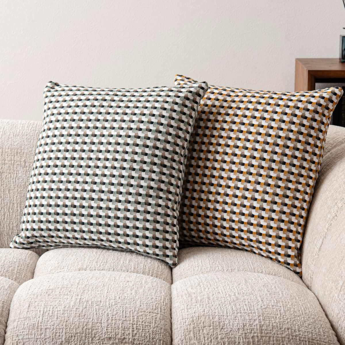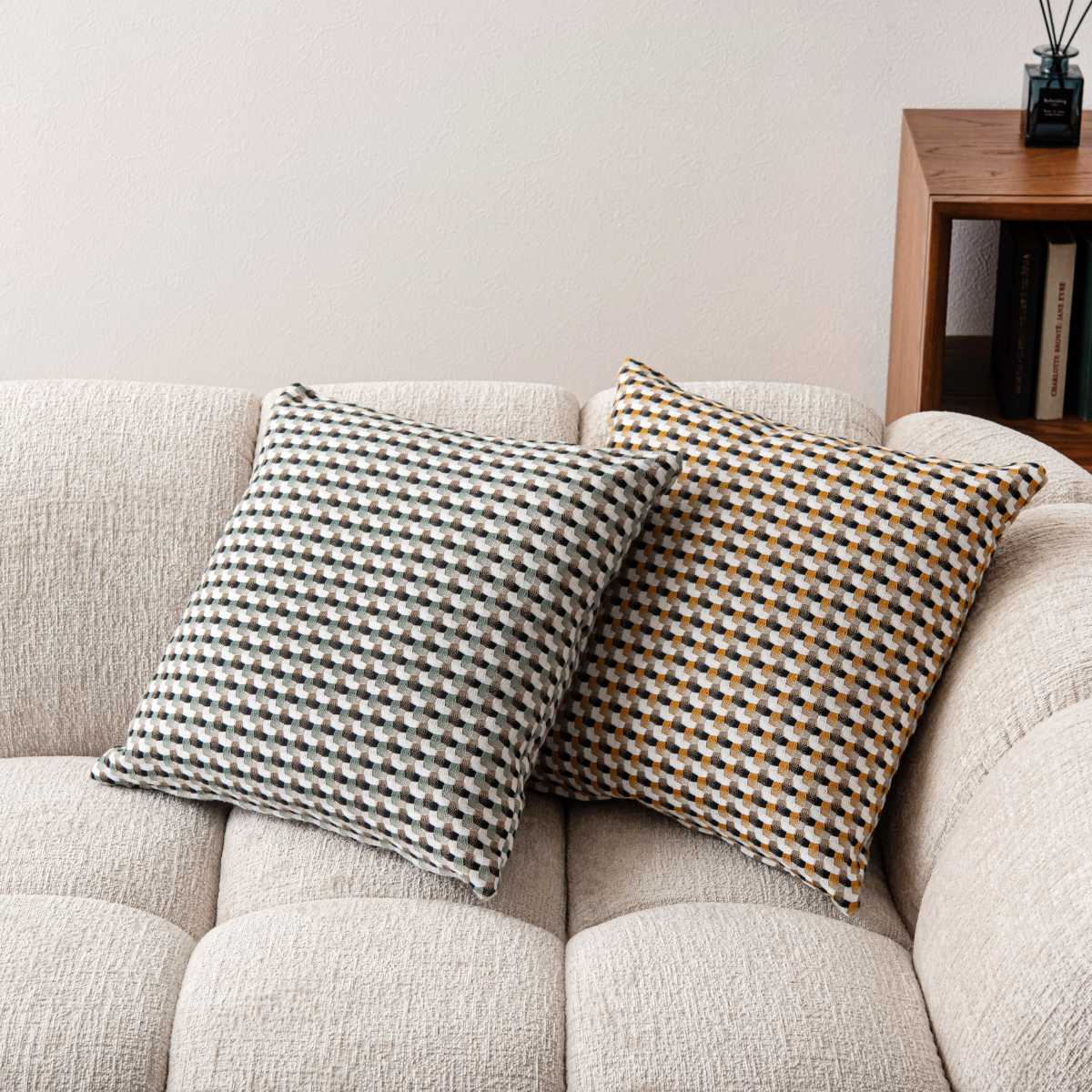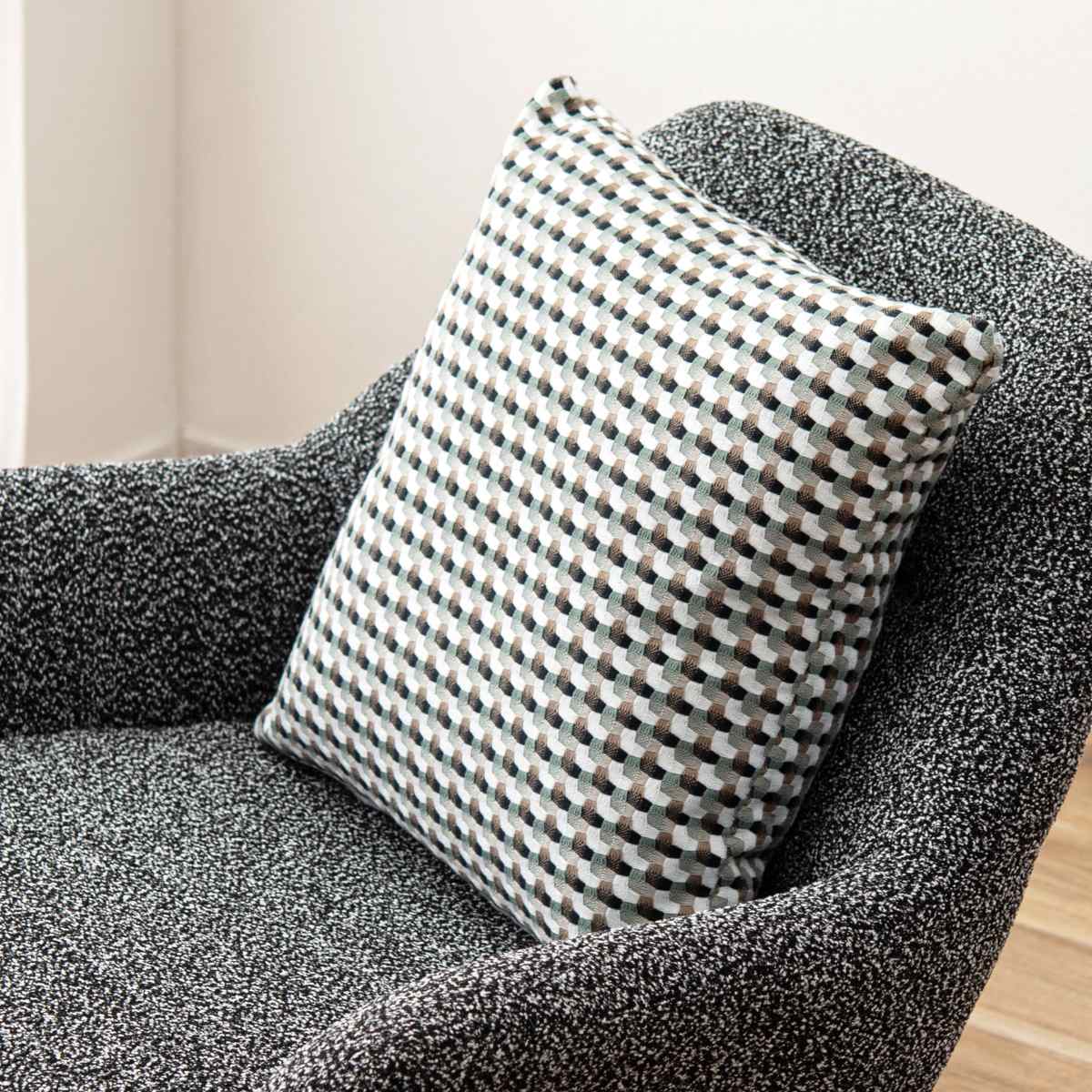●優しい色味と幾何学柄の織り模様が印象的な、モダンなデザインのクッションです。