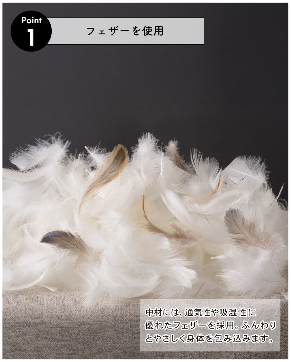 ●フェザー素材は通気性・吸湿性に優れており、蒸れにくくオールシーズン快適に使用できます。