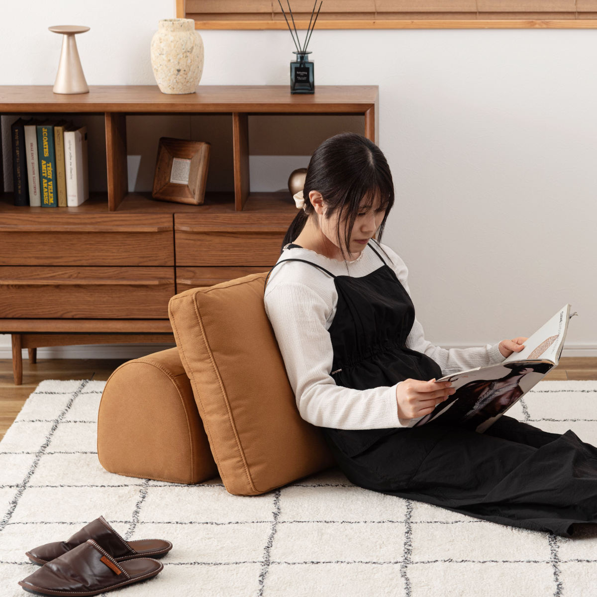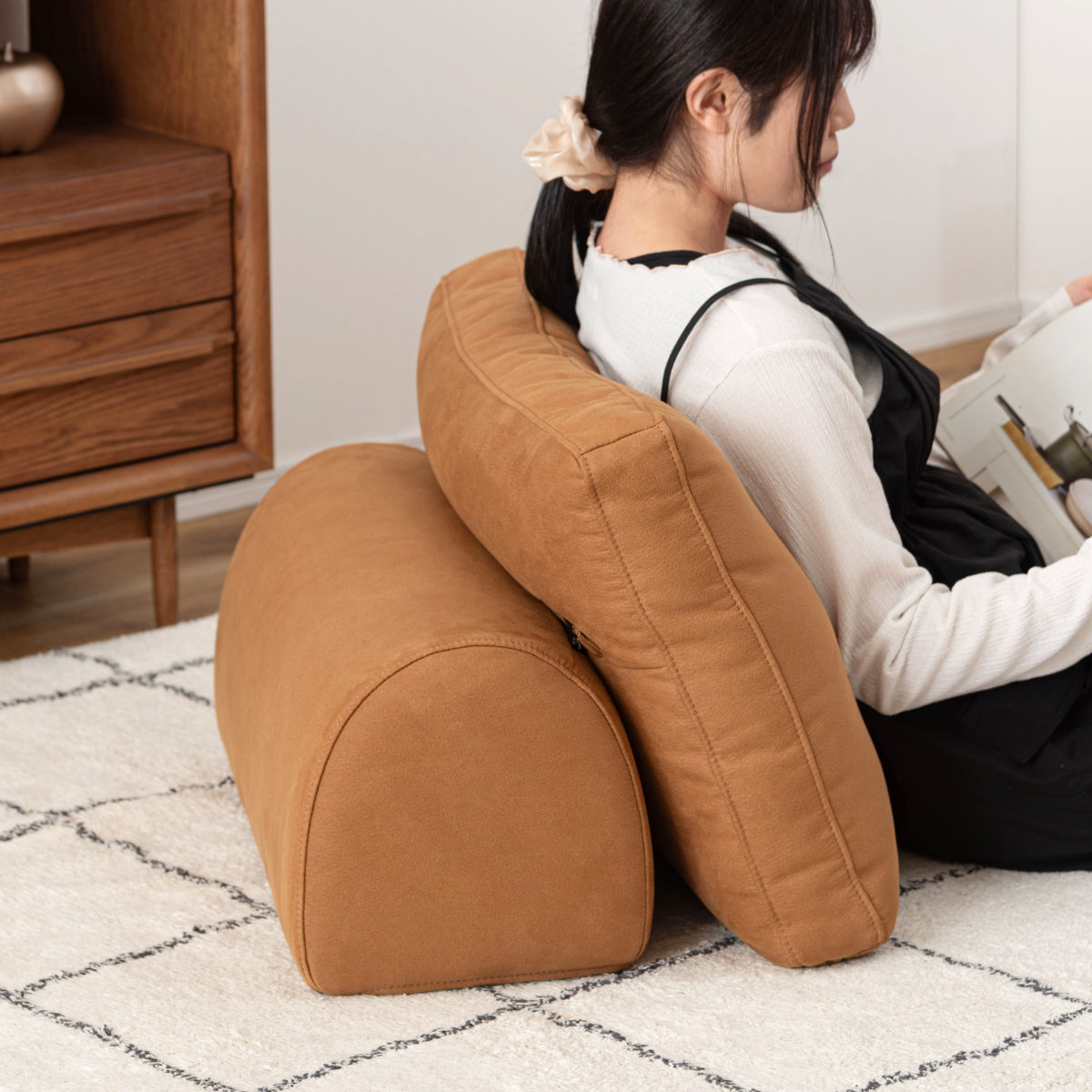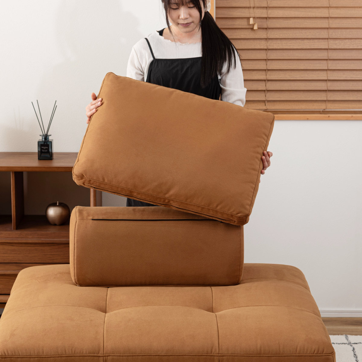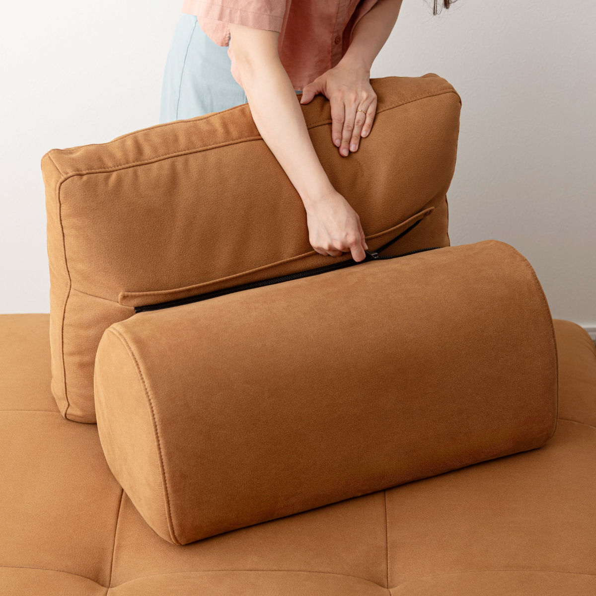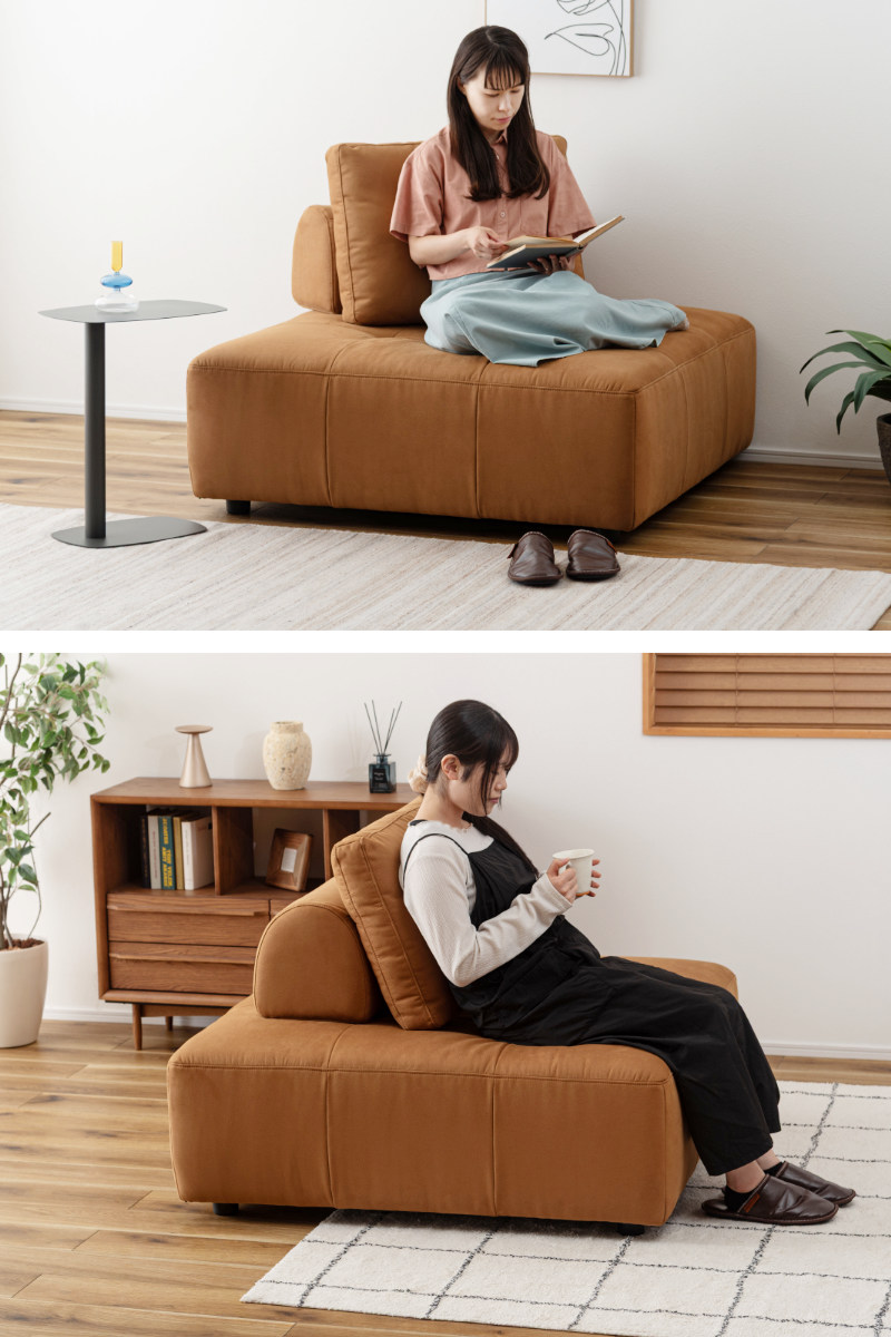 背もたれは独立しているため移動が可能。床に置いて背もたれクッションとしても使用できるので、ソファだけでなくフロアスタイルでも快適にくつろげます。