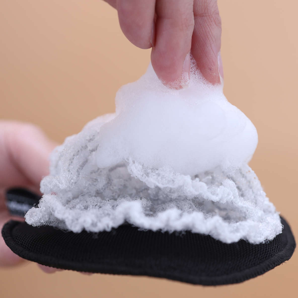 フリルがたっぷり泡立ちを生み、裏面のメッシュ生地が汚れをすっきりキャッチ。水切れがよく乾きが早いので、いつでも衛生的に使えます。
