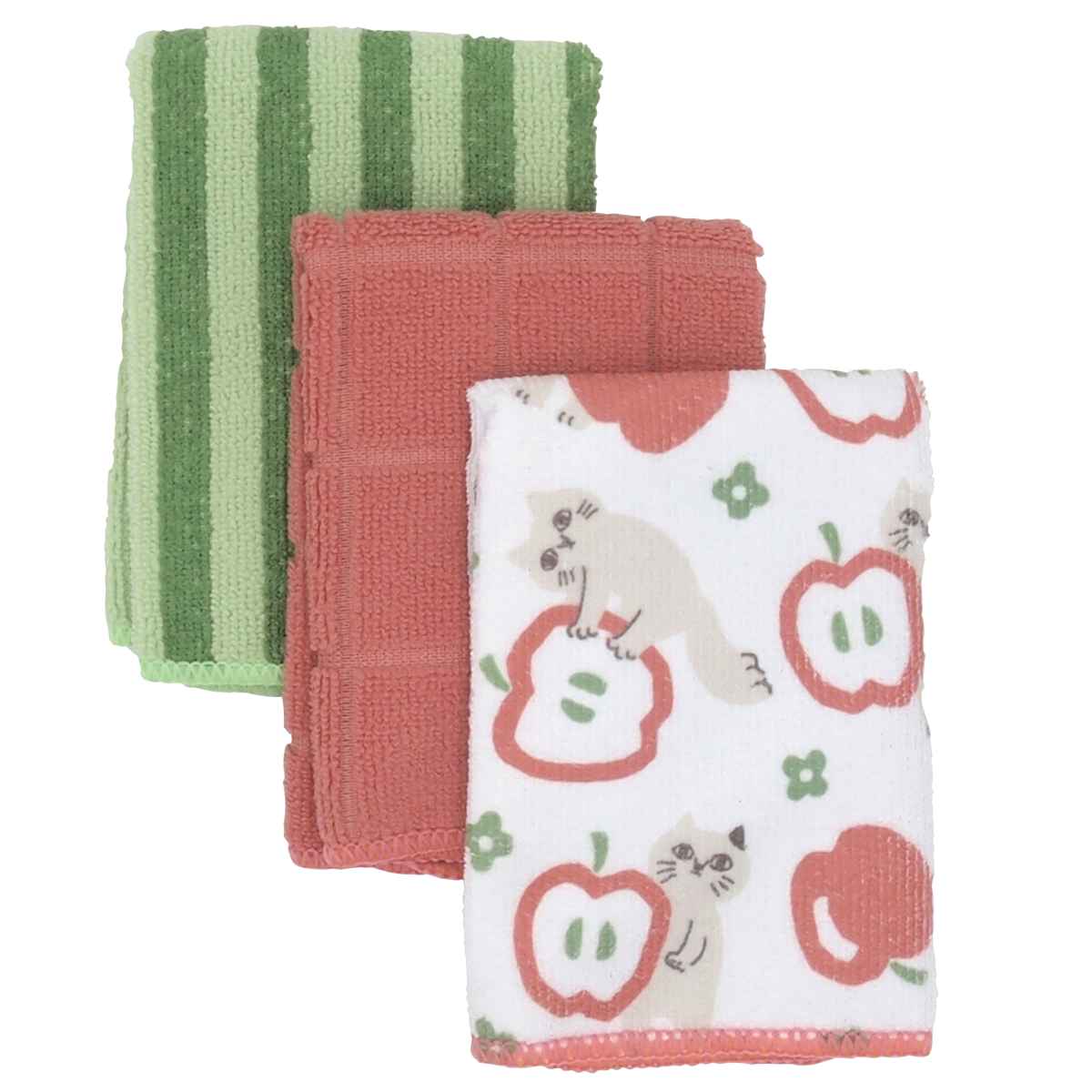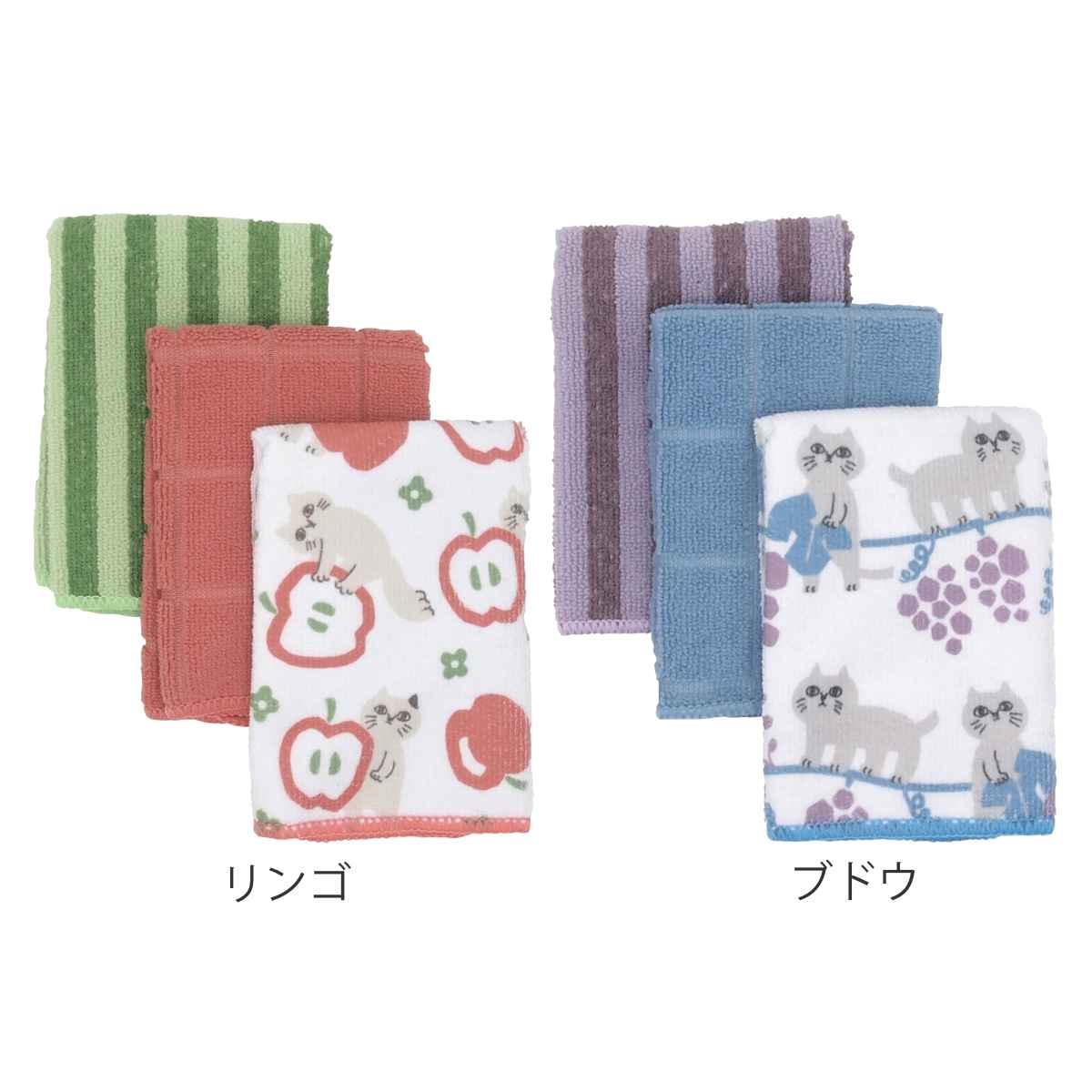 フルーツのモチーフとねこの柔らかな表情がかわいいマイクロファイバータオルです。デザイン違いの3枚セットで、用途や気分に合わせて使い分けられます。極細繊維が水分をすばやく吸い取り、拭き取り作業をスムーズにしてくれます。