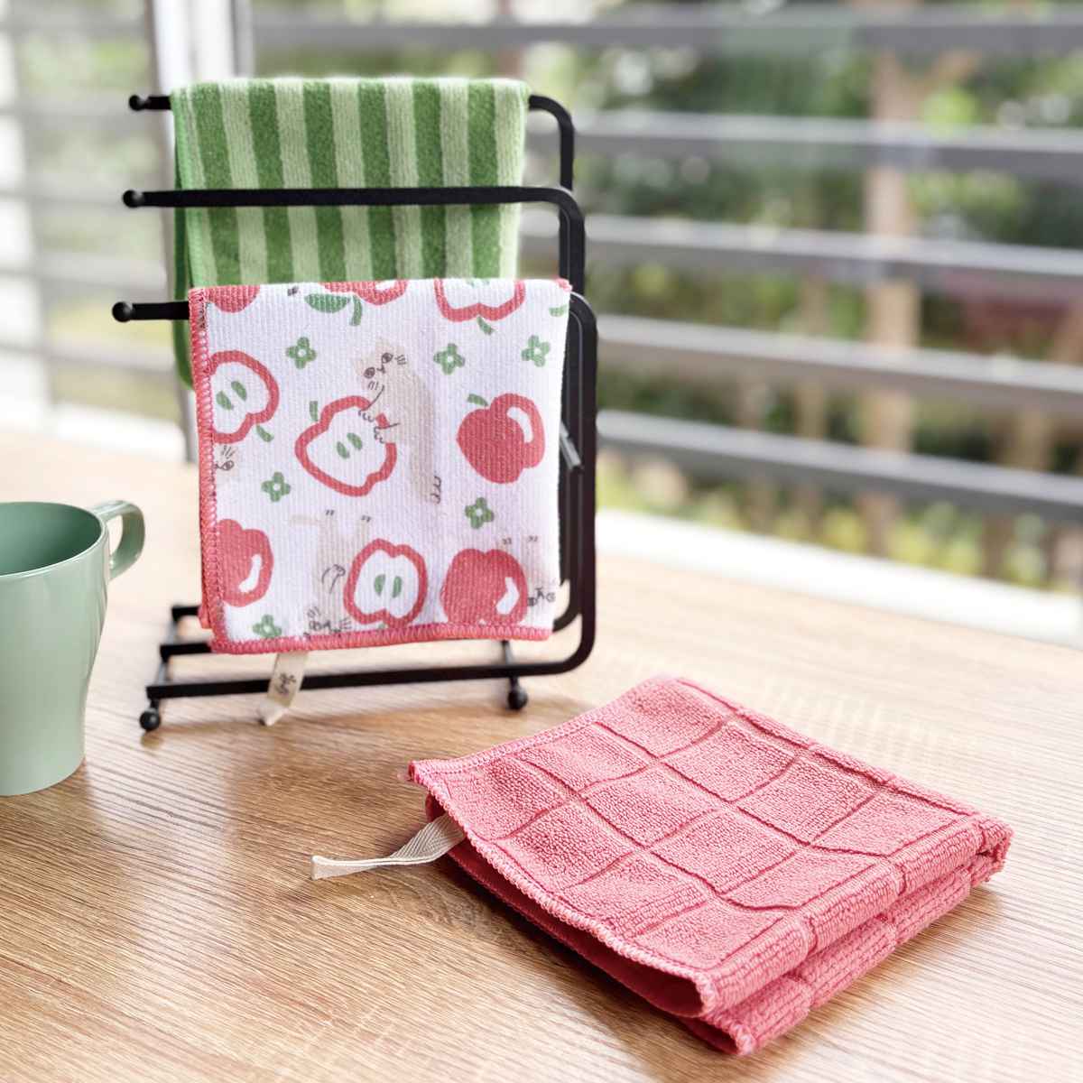 乾きが早く、食器拭きや台拭き、掃除まで幅広く活躍します。使用後もすぐ乾いて衛生的に保ちやすく、繰り返し洗ってもヘタりにくい丈夫さが魅力です。吊り下げループ付きで乾かしやすく、日常使いにぴったりです。